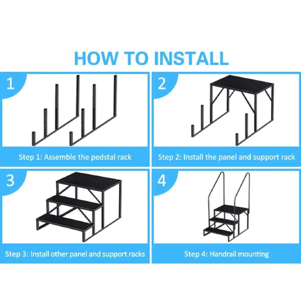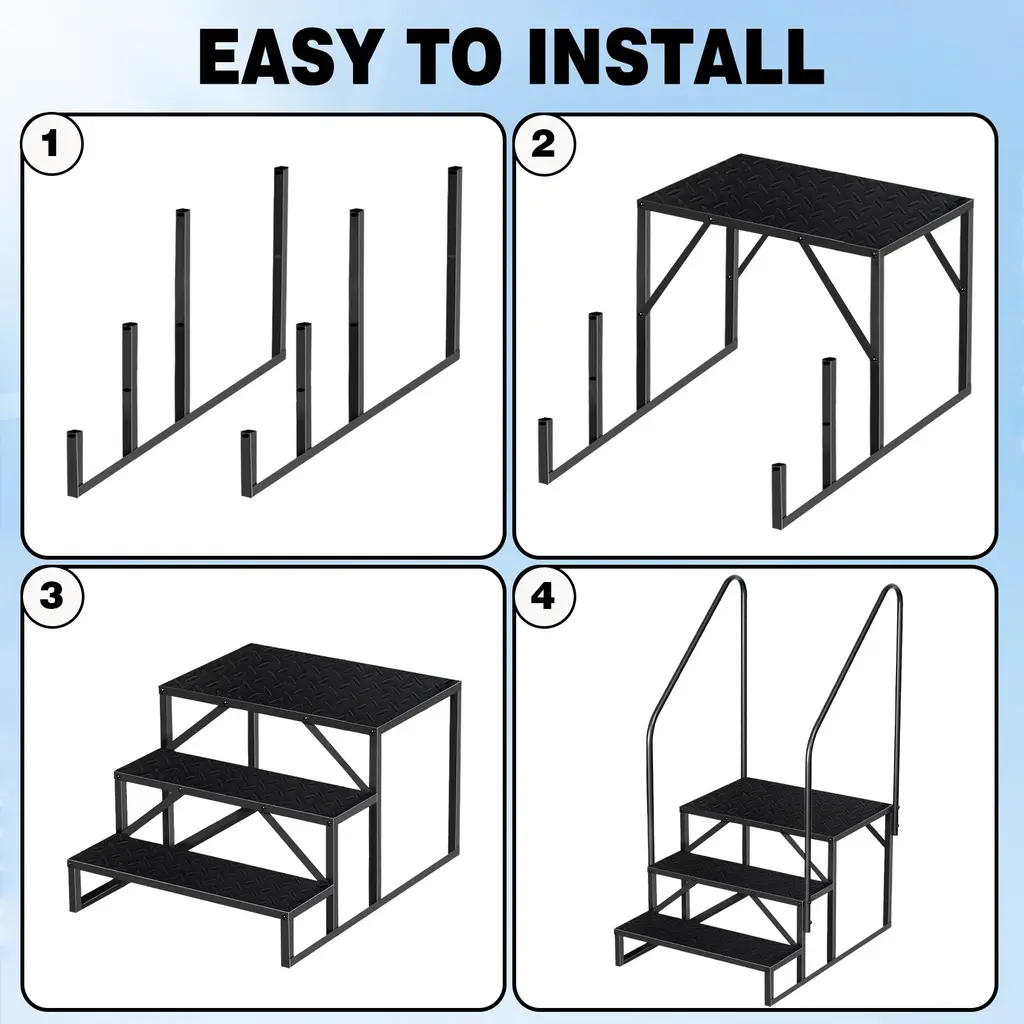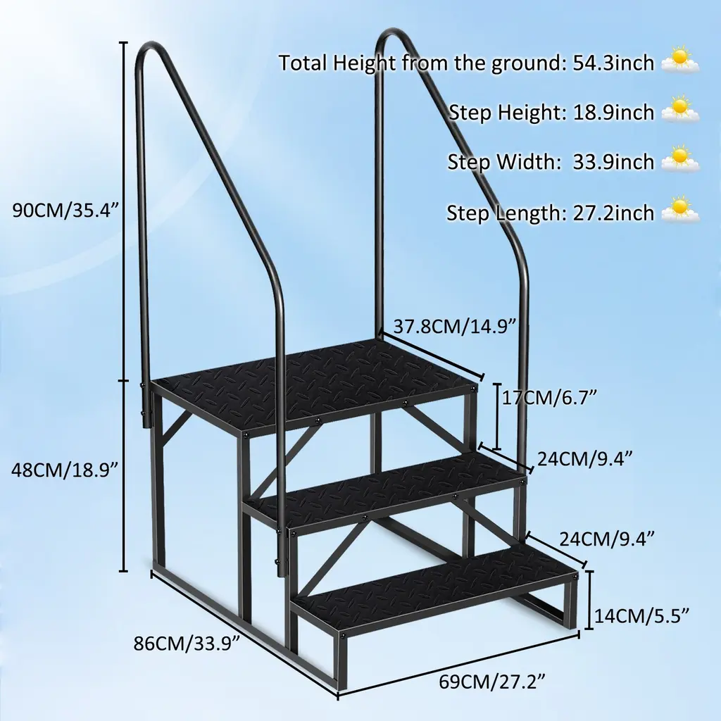 Specification: Key Features: Description: This 3-step ladder with a handrail is a durable and reliable solution for reaching high areas like RVs, hot tubs, or mobile homes. Built with heavy-duty iron, it supports up to 660 lbs and offers stability with its triangular bar design. The upgraded 1.8mm anti-slip panel ensures safer use, even in wet environments, while the handrail provides extra security. Easy to install, the ladder can be mounted on either side, and its detachable design allows for convenient storage when not in use. Perfect for a variety of outdoor and indoor applications, including travel trailers and warehouses.