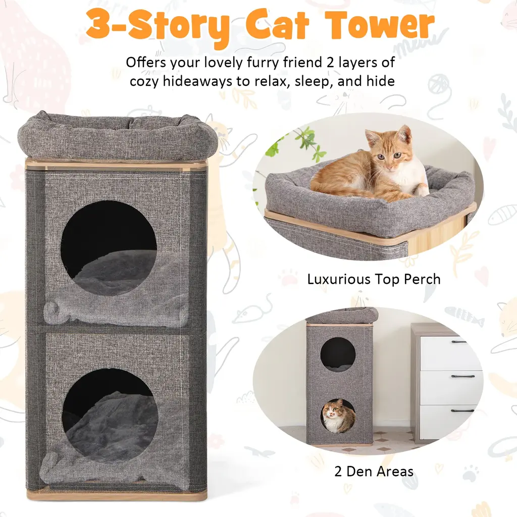 Specifications:Key Features:● Large Activity Center: The 3-story cat tower comes with a luxurious top perch, meeting cats' instincts to stand on a high place and survey the surrounding land. And there exist 2 den areas, allowing cats to enjoy curling up in small places and being out of sight.● 2-in-1 Multifunctional Design: Thanks to the removable condo outside cover, the cat house serves different purposes. With the outside cover, it provides private and warm resting areas for kittens. And without the outside cover, the cat tower promotes air circulation while making it easy to clean the interior space.● Durable Scratching Board: The barrel-shaped cat house is designed with a scratching board, which can help cats sharpen their claws while preventing cats from damaging your furniture. Besides, they are crafted with natural sisal, ensuring safety.● Comfy Lying Experience: The top perch is covered by a 2.5" thick cushion with breathable linen fabric covering and soft sponge filling, and 2 den areas are covered by soft plush mats, bringing warmth and ultimate comfort to your lovely cats. Besides, all cushions are detachable for easy cleaning.● Sturdy Structure and Easy Assembly: The cat condo is reinforced by thick wood boards, ensuring good sturdiness and a large loading capacity (the top perch loads up to 44 lbs, and the middle layer loads up to 33 lbs). In addition, with its simple structure and clear illustrations in the user's manual, you can easily set up the cat tower.