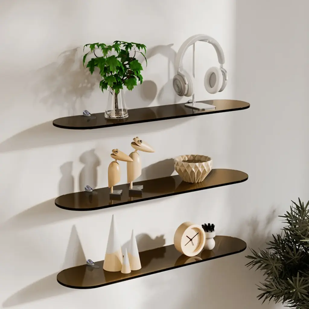 [Subtle Elegance in Simplicity] Our shelves embody the beauty of minimalism, where less is more. The unadorned aesthetic allows the functionality of the 3-tier design to shine, providing practical storage without compromising on style. [Rich Dark Brown Hue] Immerse your space in a luxurious ambiance with the deep, dark brown color of our floating shelves. This exquisite shade adds a touch of warmth and complements a variety of interior styles, from modern to traditional. [Soft Round Edges] The round edges of these shelves not only enhance their visual appeal but also contribute to a safe and comfortable user experience. Enjoy a design that is both stylish and user-friendly. [Premium Acrylic Construction] Crafted from high-quality acrylic, these shelves are built to last. The dark brown color enhances the material's richness, providing a durable and aesthetically pleasing storage solution.