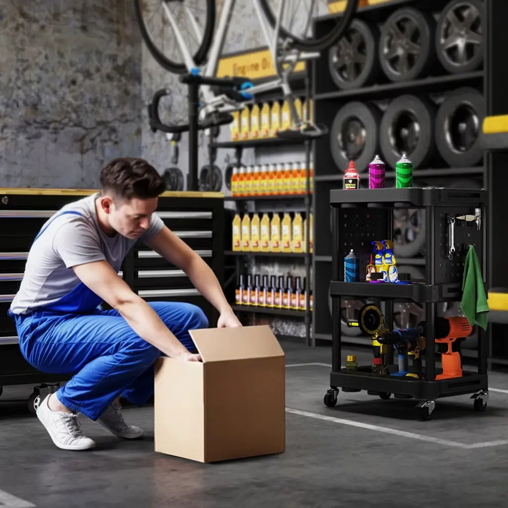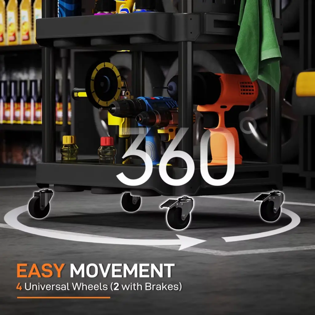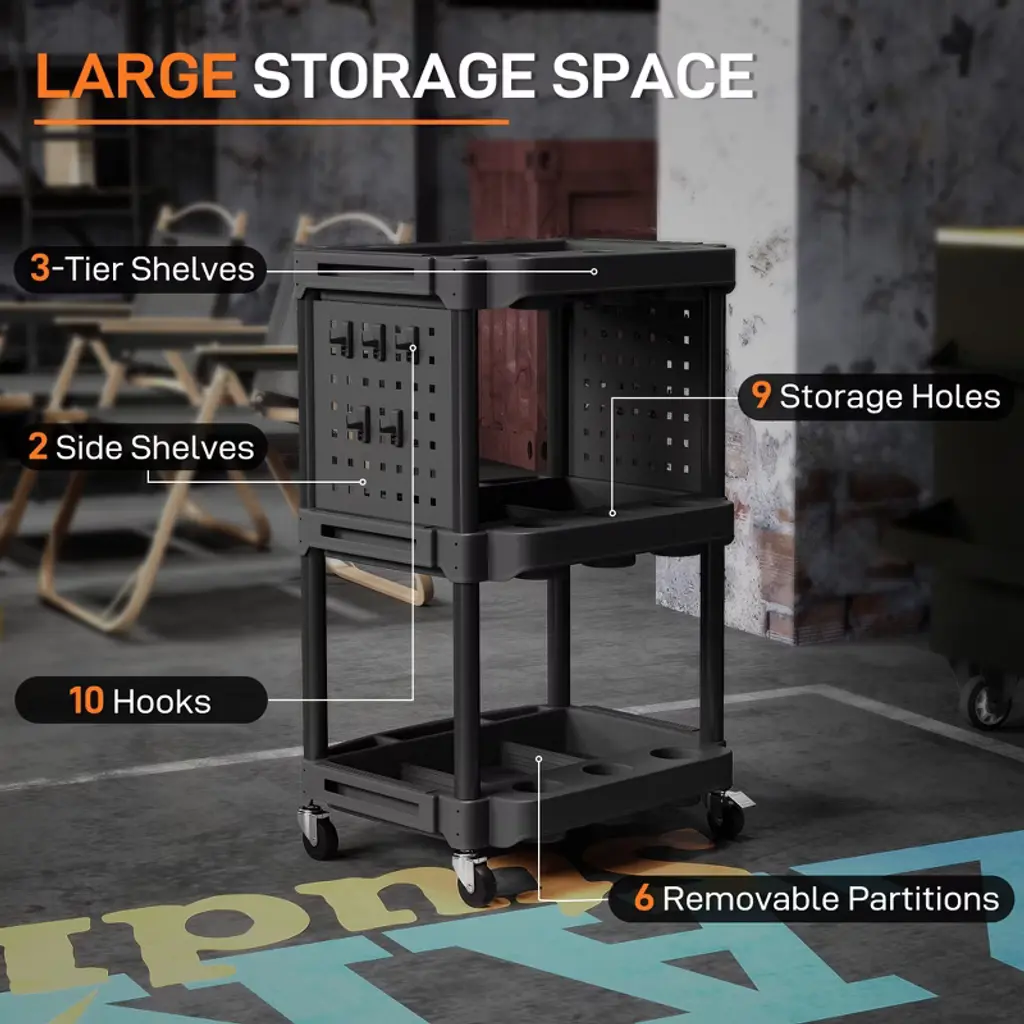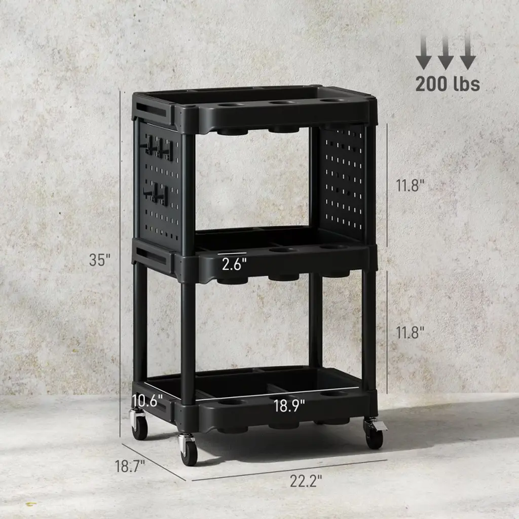 Transform your workspace with the HOMCOM utility cart. Glide effortlessly with four universal wheels, two of which can be securely locked in place with brakes while working. Maximize your organization with three-tier shelves, side-hole shelves, and ten hooks. Suitable for garages, workshops, and warehouses, this rolling tool cart keeps tools tidy and accessible, making every project a smoother, more well-organized experience.Features:- Three-tier shelves, side hole shelves, ten hooks provide lots of storage- Nine storage holes provide lots of space for organization- Four wheels, two with brakes, ensure easy mobility- Plastic construction ensures lightweight durability- Great for garages, workshops and warehouses- Shelves feature two optional partitions for versatility in your setup- Easy to assembleSpecification:- Color: Black- Material: Plastic- Overall Dimensions: 22.2" W x 18.7" D x 35" H- Each Shelf Size: 18.9" L x 10.6" W x 11.8" H- Weight Capacity: 200 lbs.- Item Label: B20-115V00BKPackage Includes:- 1 x Rolling Tool Cart- 1 x Manual