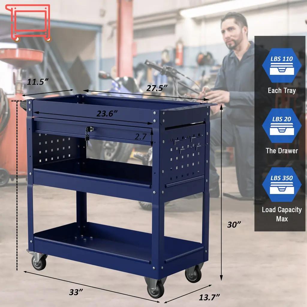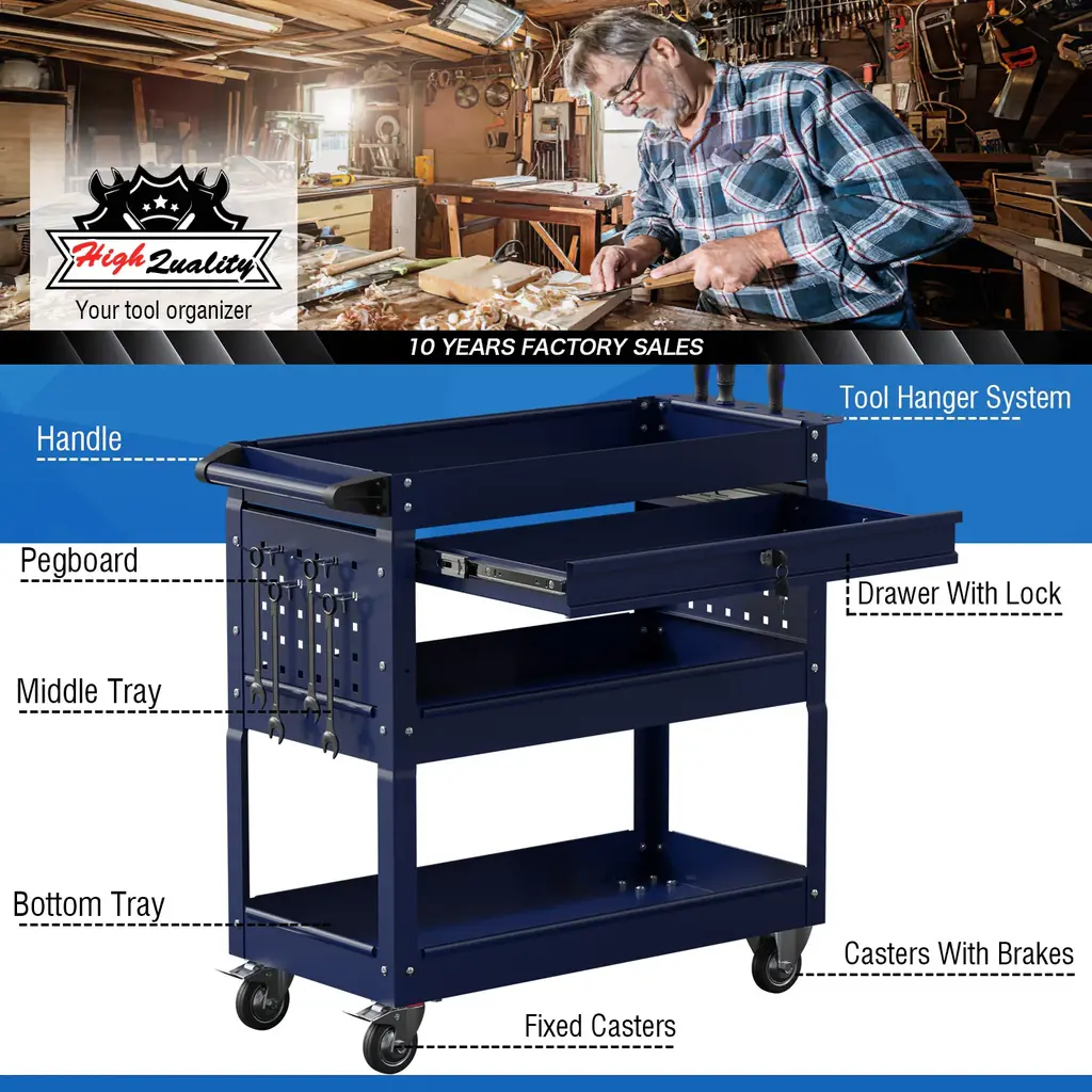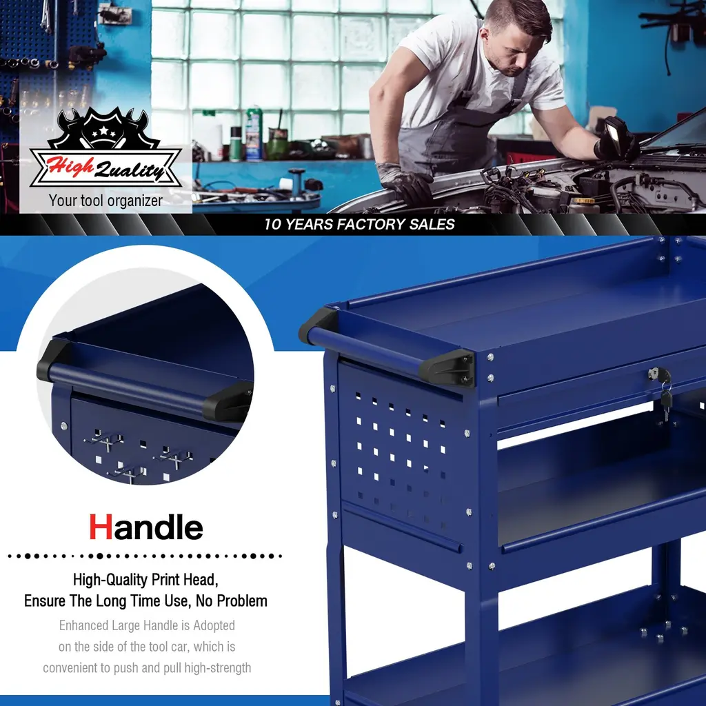 3-Tier Rolling Tool Cart On Wheels For Mechanics With Utility Drawer - Dark Blue