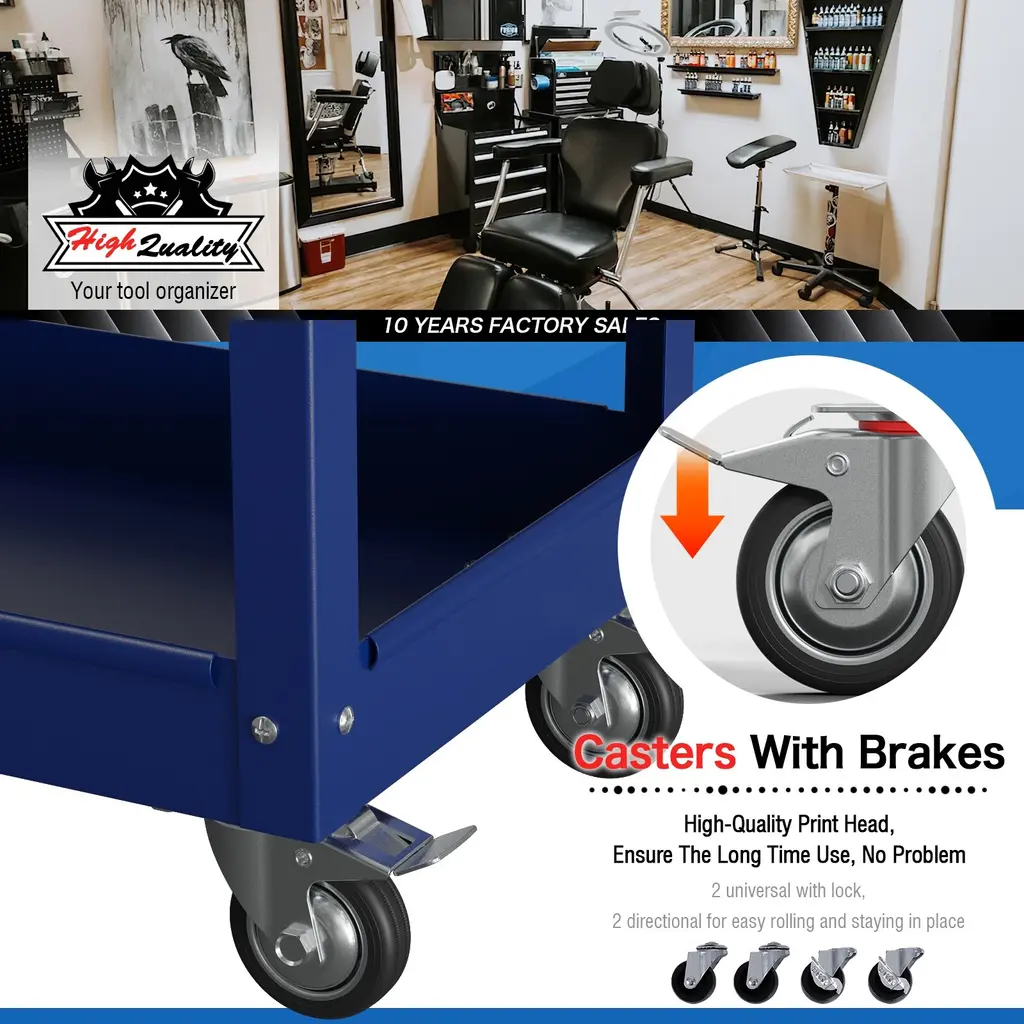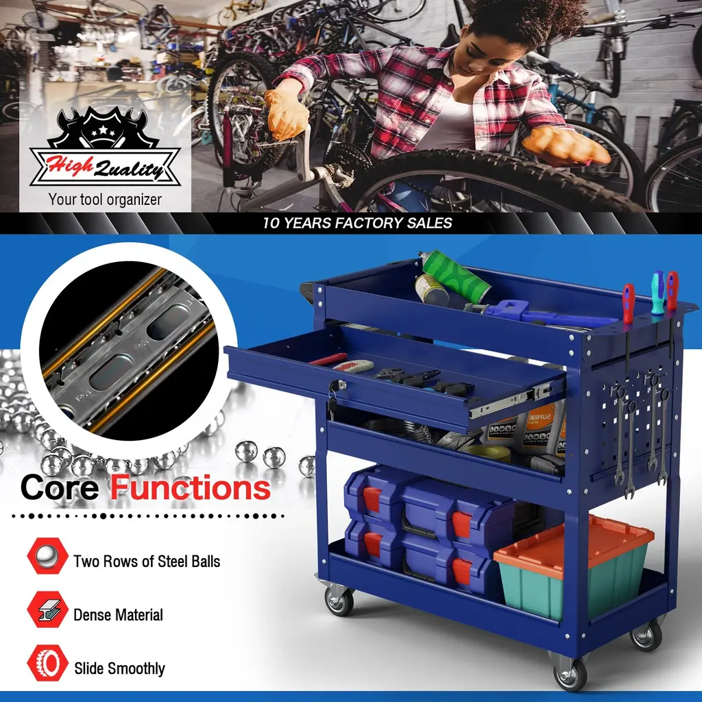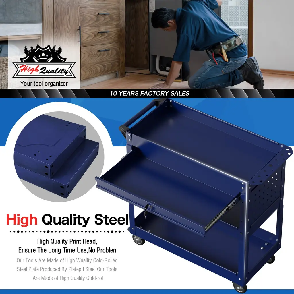 3-Tier Rolling Tool Cart On Wheels For Mechanics With Utility Drawer - Dark Blue