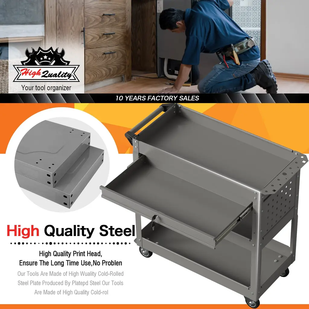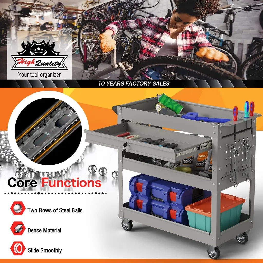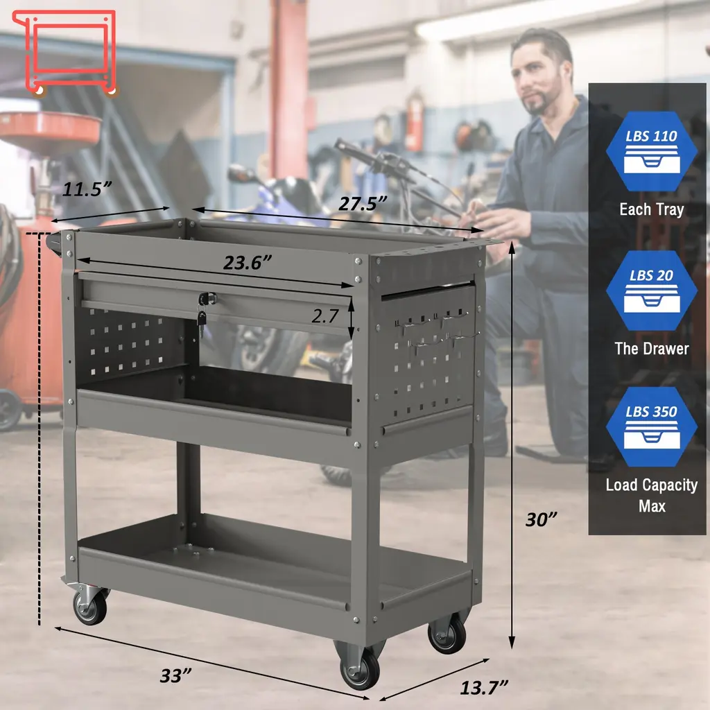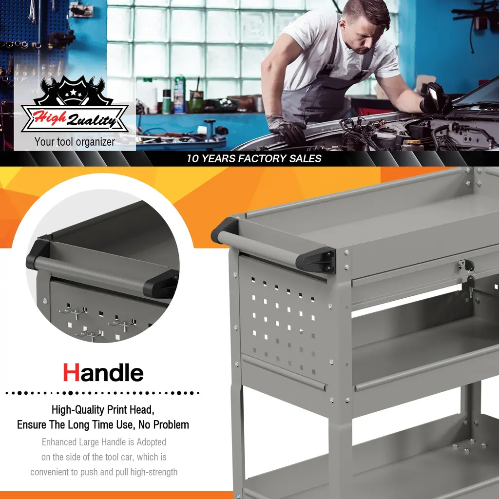 3-Tier Rolling Tool Cart On Wheels For Mechanics With Utility Drawer - Grey