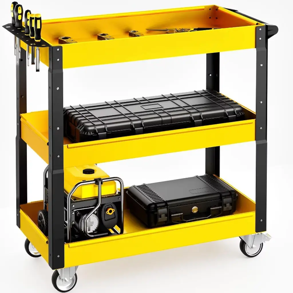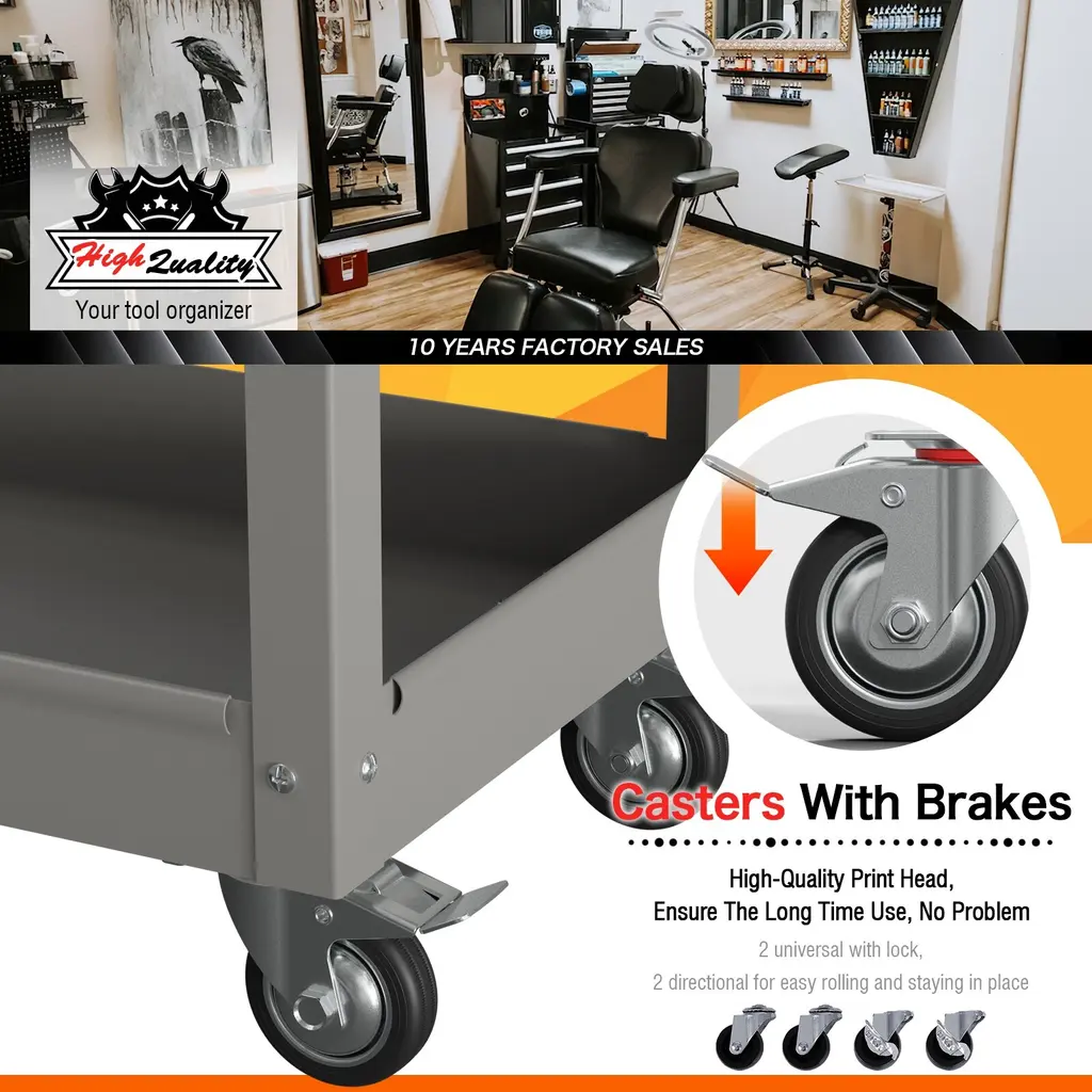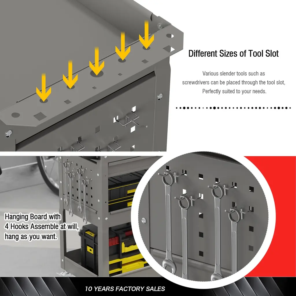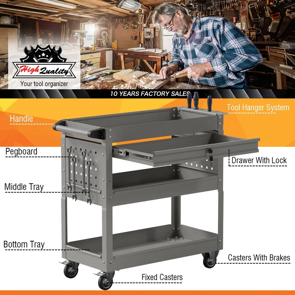 3-Tier Rolling Tool Cart On Wheels For Mechanics With Utility Drawer - Grey