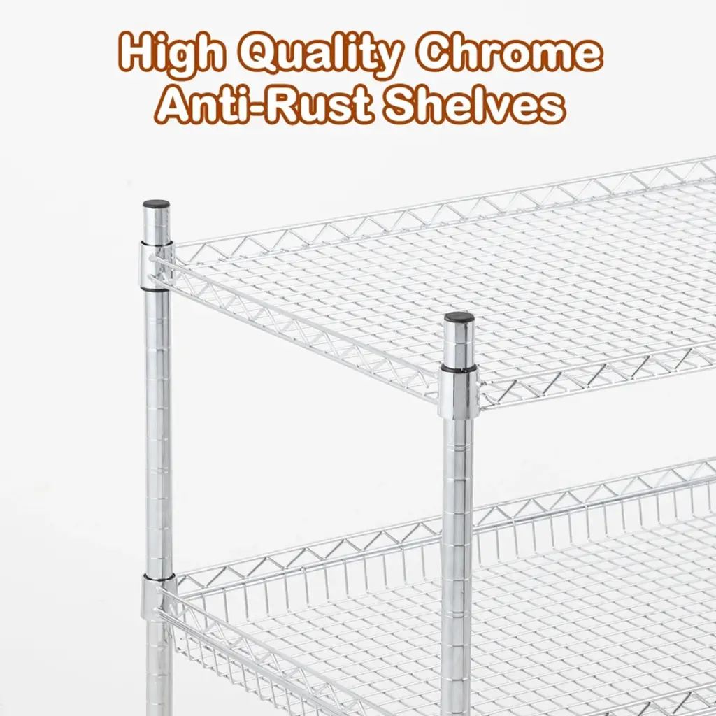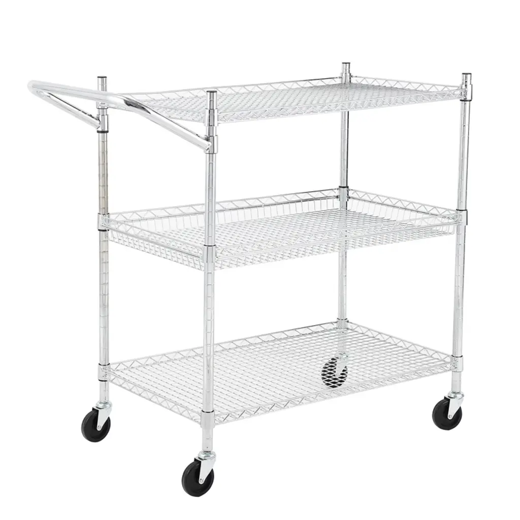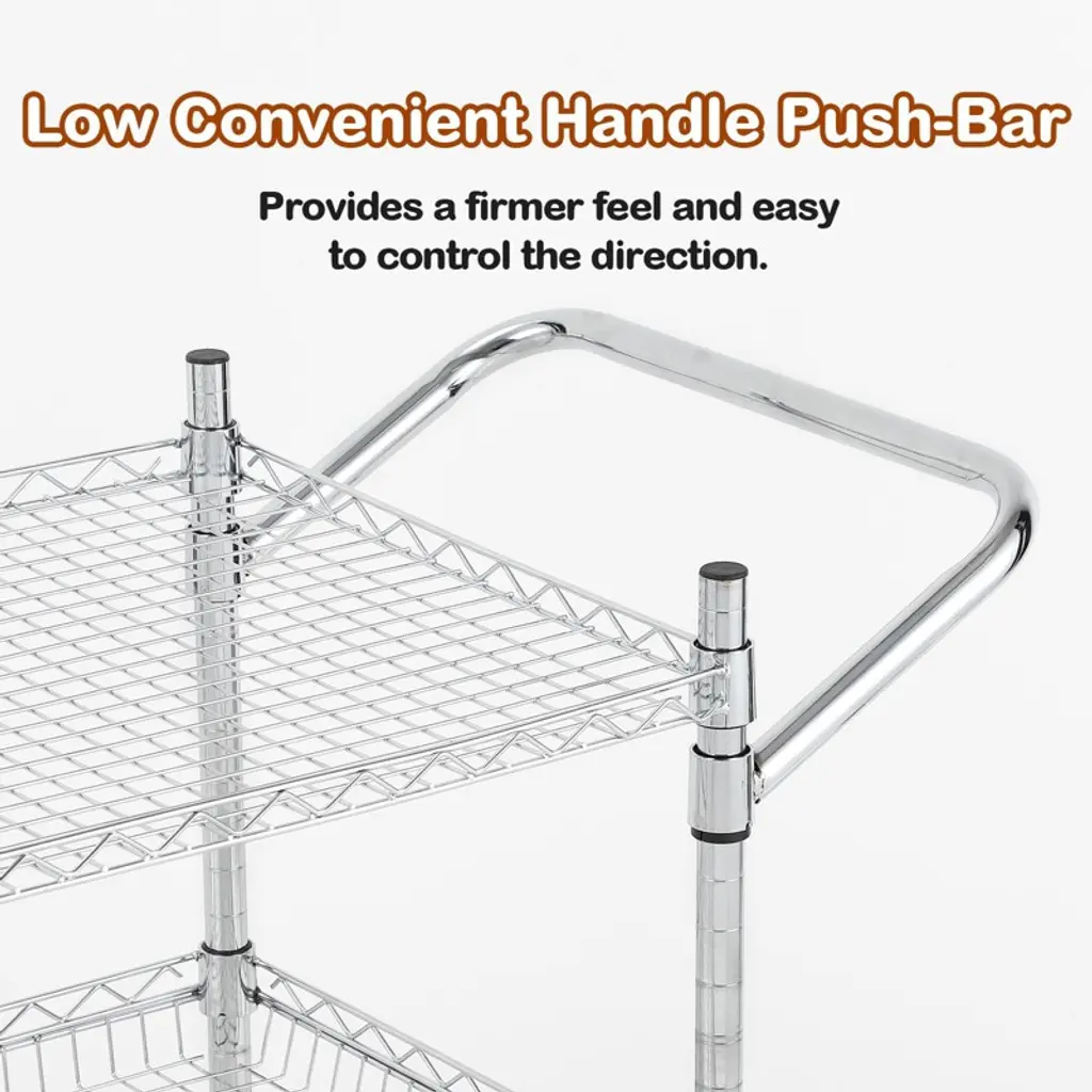 Designed for reliability and versatility, this heavy-duty metal utility cart features a robust three-shelf structure that can handle demanding storage and transportation needs. Each shelf is adjustable, allowing you to organize both small and large items with ease, while ventilated wire construction provides airflow to keep your goods fresh. The industrial casters ensure noise-free movement, and the locking feature provides stability during use. Assembly is fast and tool-free, allowing you to optimize your workspace in any commercial or home setting.