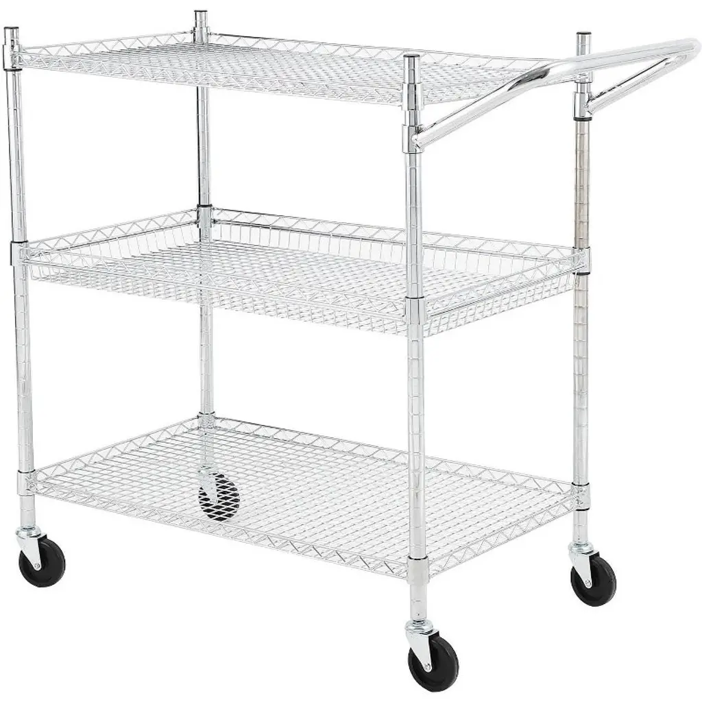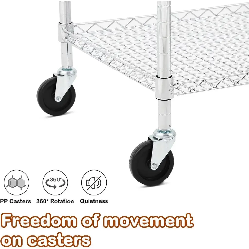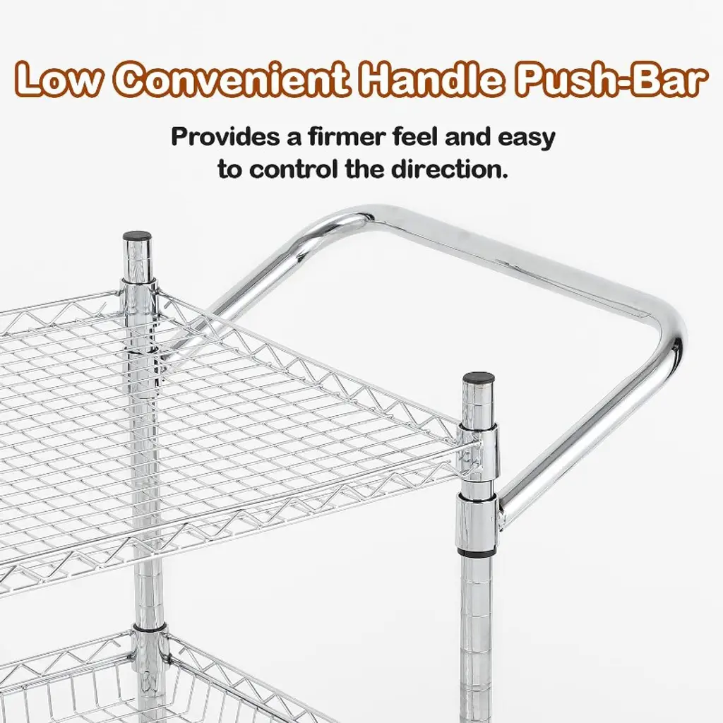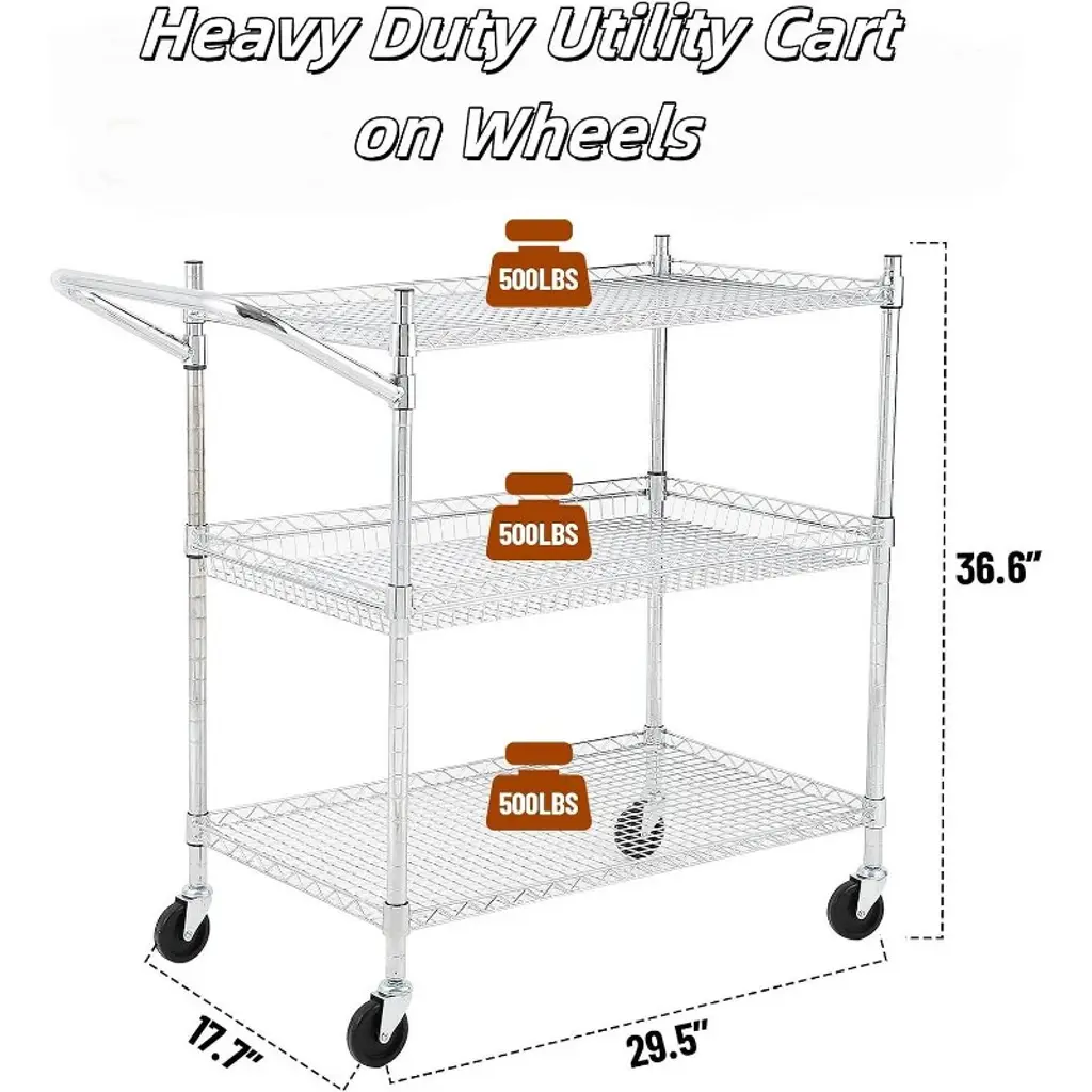 "Built for durability and versatility, this 3-Tier Utility Rolling Cart offers industrial-grade strength and flexible storage solutions for your kitchen, garage, warehouse, or office. Constructed from reinforced steel with a rust-resistant chrome finish, it comfortably supports up to 500 lbs dynamic weight (1500 lbs static tested). Featuring adjustable ventilated wire shelves and 360° silent lockable casters, this heavy-duty cart combines practicality with mobility, making it ideal for transporting tools, food, supplies, and more. Industrial-Grade Sturdiness: Crafted from high-quality reinforced steel with 69 thickened wires per shelf and 1” diameter poles, this cart resists deformation under heavy loads while offering rust and oxidation resistance with food-safe chrome plating—perfect for damp environments like kitchens and pantries. 360° Silent Lockable Casters: Equipped with smooth, silent industrial casters for noise-free rolling, two of which are lockable to secure the cart firmly in place when needed. These casters ensure safe, stable movement in busy commercial or industrial settings. Adjustable 3-Tier Shelves: Three adjustable wire shelves can be set at 1” intervals to accommodate items of varying heights—from small spices to large cookware. The ventilated design promotes airflow to keep perishable goods fresh and hot items safe. A push-bar handle provides easy control during transport. Tool-Free Assembly & Space-Saving: Assembles quickly without tools in about 15 minutes. The compact footprint (35.6” L x 18” W x 34” H) fits neatly into tight spaces like under shelves or between cabinets, maximizing vertical storage while minimizing floor space usage. Multi-Functional Use: Perfect for numerous applications including kitchen prep and produce cart, garage tool organizer, restaurant serving trolley, warehouse supply cart, or nursery storage. Adaptable to your storage and transport needs across all environments. Specifications: Load Capacity: 500 lbs dynamic weight (1500 lbs static tested) Material: Reinforced steel with food-safe chrome plating Shelves: 3 adjustable wire shelves with 1” height intervals Dimensions: 35.6” L x 18” W x 34” H Wheels: 4 industrial silent 360° swivel casters, 2 lockable Package Includes: 1 × 3-Tier Utility Rolling Cart with handle and wheels Customer Support: Available for assembly help and product inquiries