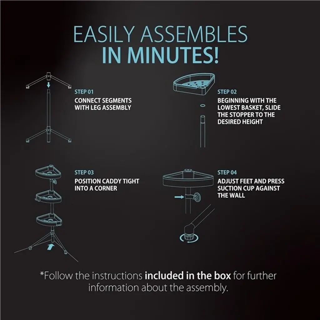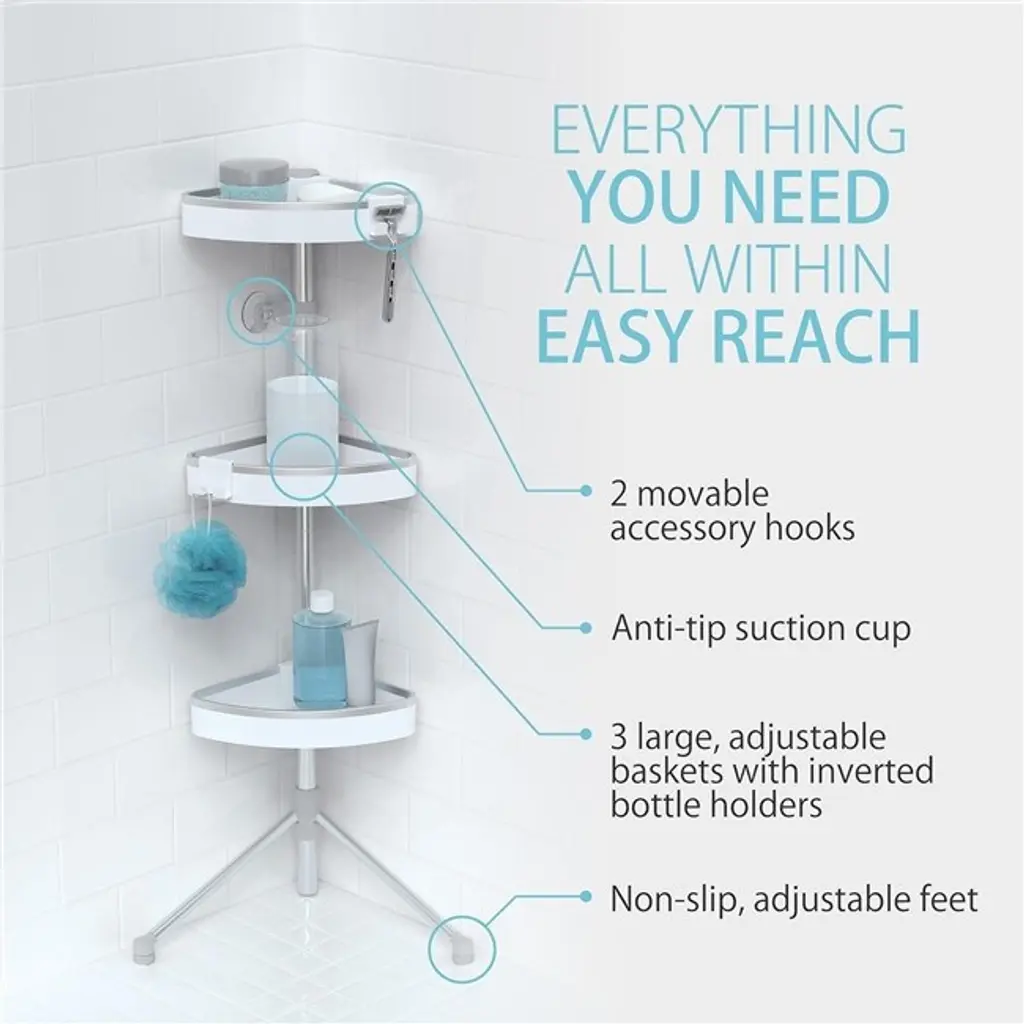 3-large adjustable baskets with drainage slots and inverted bottle holders Stabilizing corner contact bumpers and anti-tip suction cup Easy to assemble, no tools required for installation Two movable accessory hooks Non-slip, adjustable feet, Forever rust free