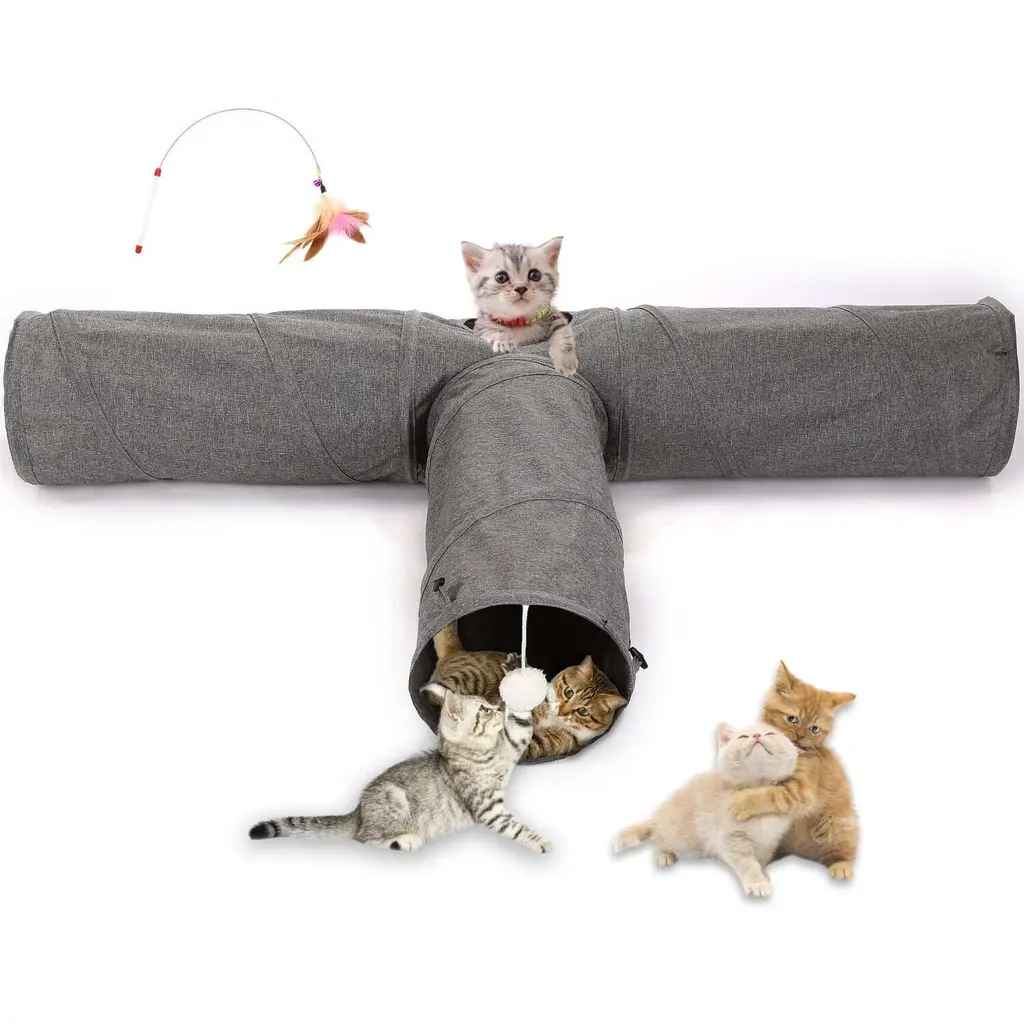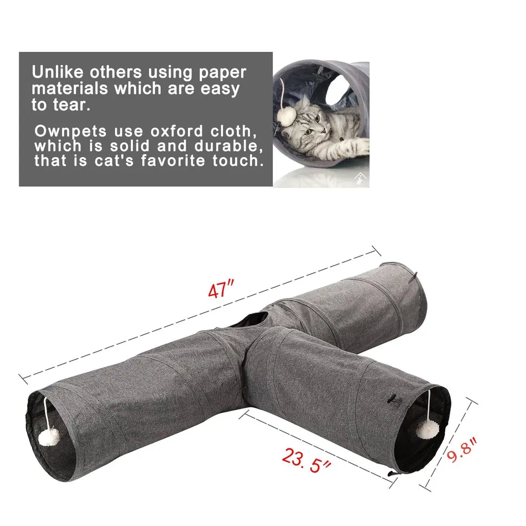 Description:TOUGH, SOLID & DURABLE:The cat tunnel is made out of oxford cloth and thus, creating a slightly thicker cloth with a fine texture and giving the fabric a unique checkerboard appearance. It is machine-washable, easy to maintain and ten to retain its shape. All in all, they can be used for a long-term period.KEEP YOUR CAT ACTIVATE:There are three approaches in total for your cat to have fun in daily routine. They are three-way channels, drop ball toys as well as peep holes. They are the best ways for your cat to have more fun and thereby, stimulating a cat's curiosity to look what inside the channel.PORTABLE DESIGN:This type of cat tube tunnel is collapsible, which means that it can be popped out and folded up easily within a few seconds. As a consequence, you can carry it around wherever you go. It is easy for storage when it is not in use.Feature:Specification:1.Color:Grey2.Material: Oxford Fabric3.Package Size: 530g4.Package Weight: 33.5x27x5cmPackage:1 * 3-WAY Cat Tunnel1 * Play with Cat Stick