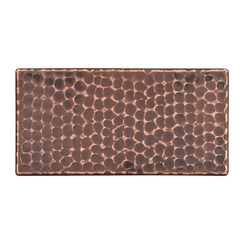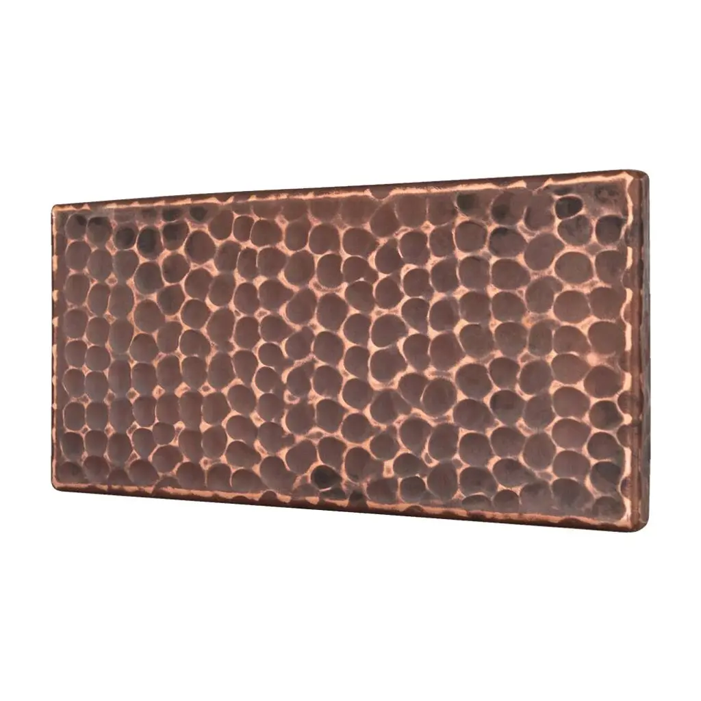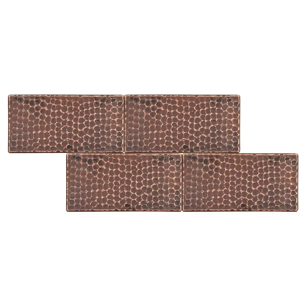 Copper Tiles are the ideal option to accentuate your home. You can create a focal point with an assortment of designs to choose from. Mix and match with our other sized tiles to create an eye-catching design.3" x 6" Hammered Copper Tile Package of 4 Features:IMPORTANT NOTE: DUE TO THE HANDCRAFTED NATURE OF THIS PRODUCT SMALL VARIANCES IN SIZE AND COLOR MAY OCCUR.Tile Packages Suggested Accessories: