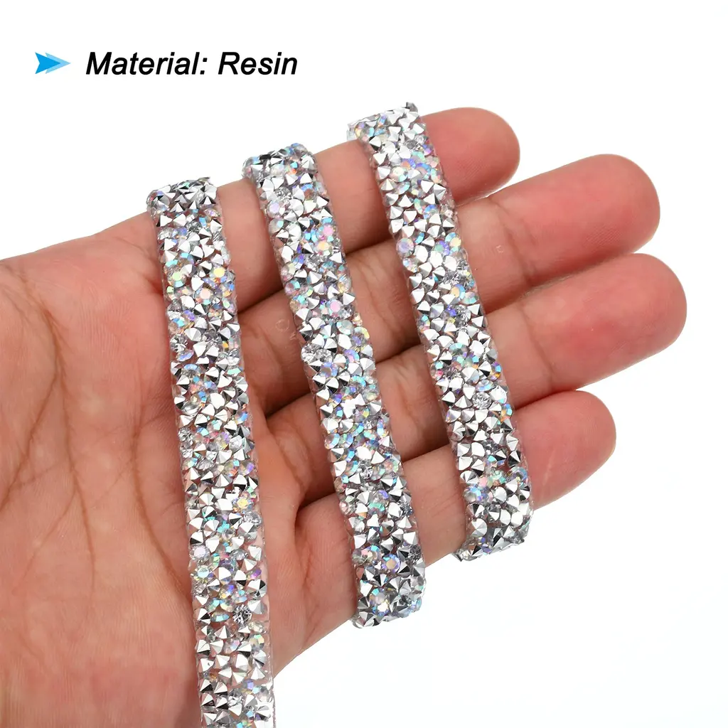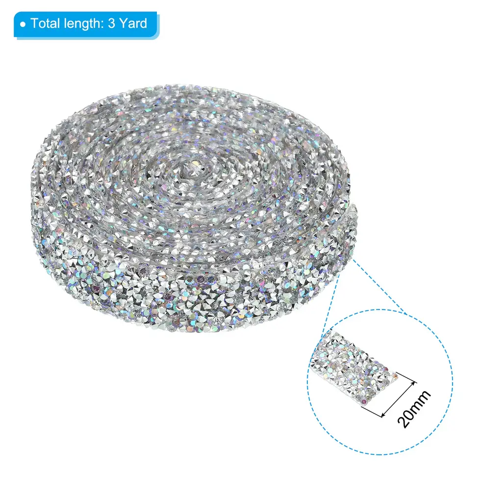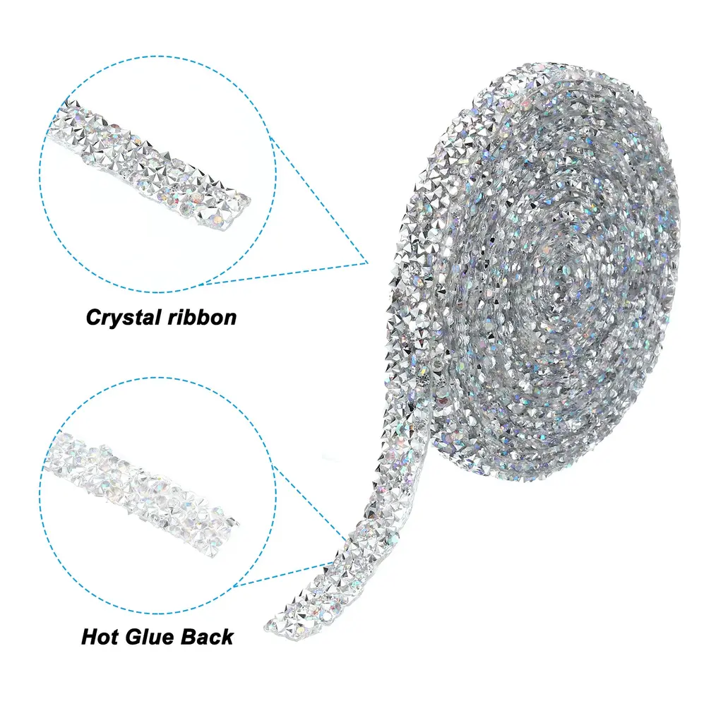 Crystal rhinestone ribbon is great for adding a touch of elegance to clothing, costumes, hair accessories, home decor, and DIY projects and art, offering endless creative possibilities. Suitable for Christmas, weddings, birthdays, parties, or any special event.SpecificationColor: Silver ToneMaterial: ResinSize: 3 Yard x 10mm(L*W)Packing List: 1 x Rhinestone RollAdvantageSparkling Effect: Crystal ribbon creates a stunning and radiant effect, catching the light and adding a luxurious touch to your creations.Durable Adhesive: The hot melt adhesive backing ensures effortless and secure attachment to various surfaces.Time-saving and Efficient: Applying the rhinestone ribbon roll is a breeze, saving you time and effort compared to individually attaching rhinestones.InstructionUse scissors to cut out the size you want. Apply heat using a heat press or ironing machine and it can stick.NOTE: The rhinestone strip comes with a layer of hot melt adhesive, but cannot be pasted directly. If you want to stick it directly, you can apply glue.