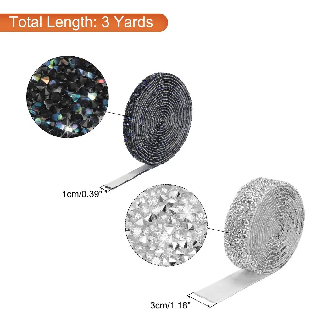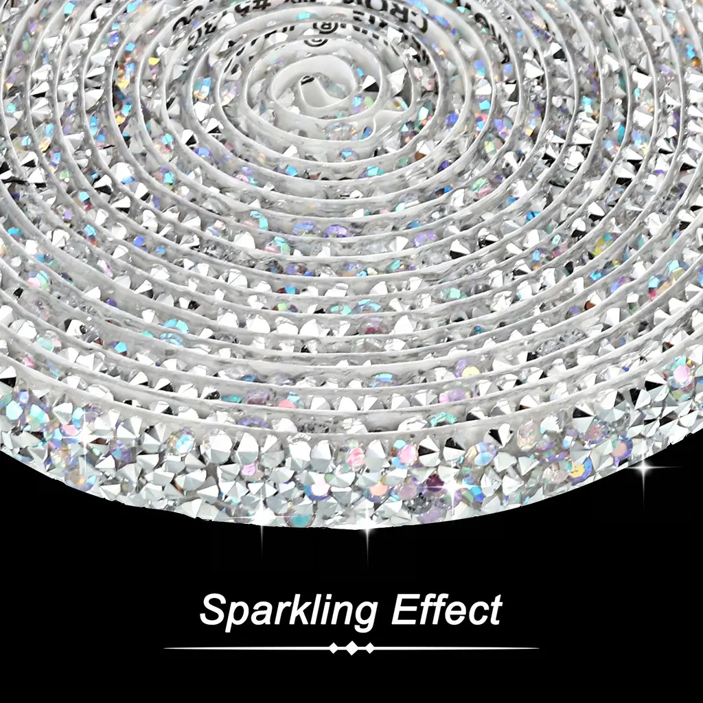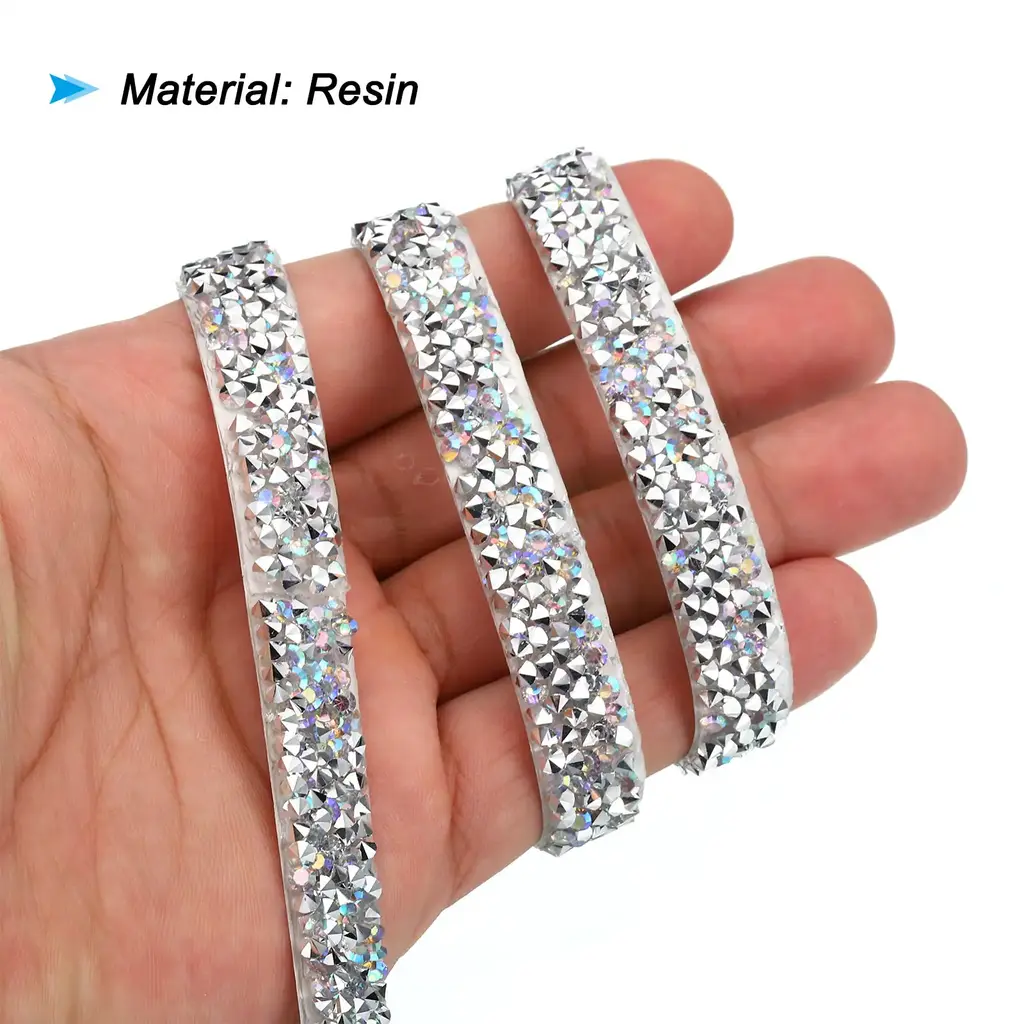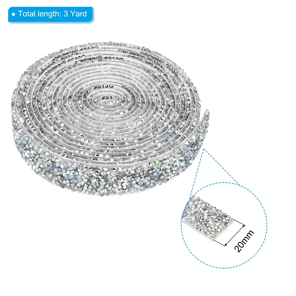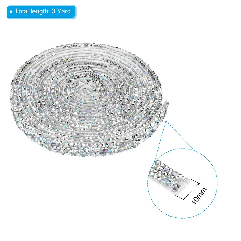 Crystal rhinestone ribbon is great for adding a touch of elegance to clothing, costumes, hair accessories, gifts, furniture, suitcases, phone cases, window, home decor, and DIY projects and art, offering endless creative possibilities. Suitable for Christmas, weddings, birthdays, parties, or any special event.SpecificationColor: Silver ToneMaterial: ResinSize: 3 Yard x 10mm(L*W)Packing List: 1 x Rhinestone RollAdvantageSparkling Effect: Crystal ribbon creates a stunning and radiant effect, catching the light and adding a luxurious touch to your creations.Durable Adhesive: The self-adhesive backing ensures effortless and secure attachment to various surfaces.Time-saving and Efficient: Applying the rhinestone ribbon roll is a breeze, saving you time and effort compared to individually attaching rhinestones.InstructionUse scissors to cut out the size you want. Tear off the stick on the back. Paste on the item you want to decorate.NOTE: Measure the size of the surface before cutting the rhinestone strip.