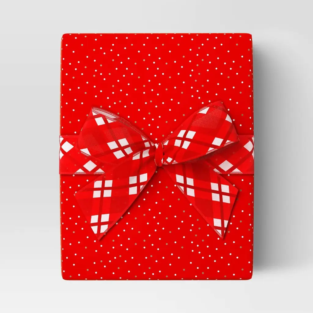 Decorate your gifts in the colors of the season with this Christmas Candy Cane Wishes Premium Red White Dot on Red from Wondershop™. Adorned with white glittering dots on a red background, this festive gift wrap adds the perfect holiday cheer to your gifts. This paper gift wrap comes in a 120-inch length roll, making it ideal for wrapping a variety of holiday presents.Welcome to the Wondershop™.