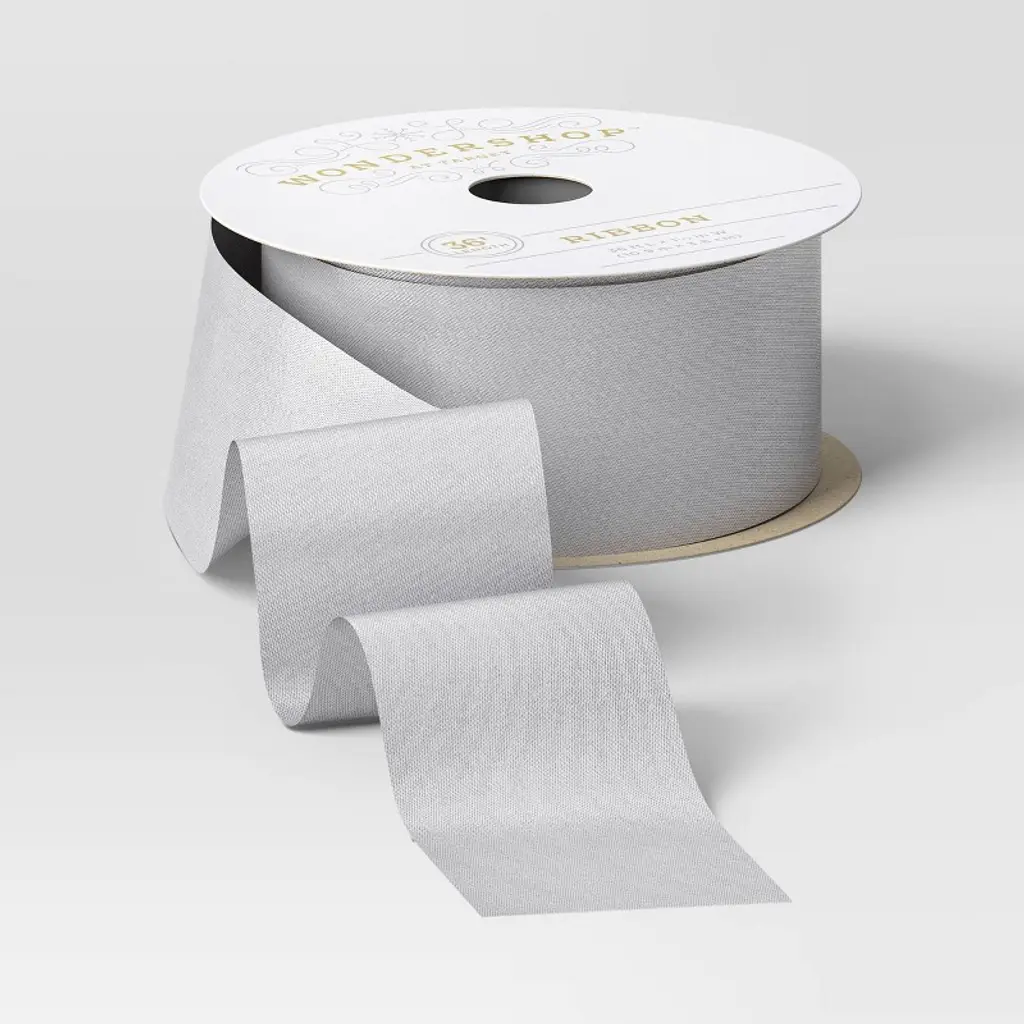 Make your holiday presents sparkle with this Christmas Fabric Ribbon from Wondershop™. Made of satin, this silver-tone Christmas ribbon has a shiny finish that beautifully reflects the light, bringing a glam touch to your holiday celebrations. Plus, this wired ribbon comes on a 30-foot roll, giving you plenty to accent the gifts for everyone on your list.Welcome to the Wondershop™.