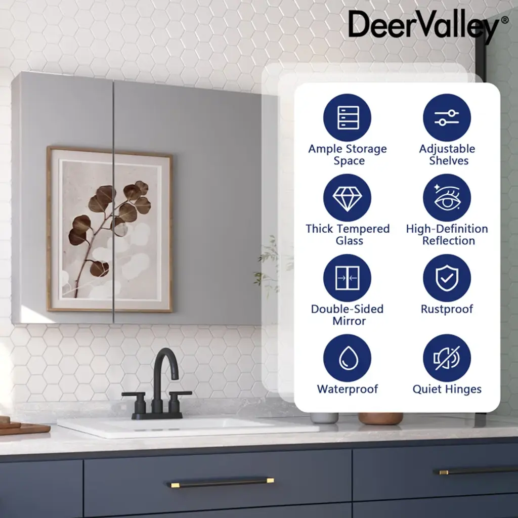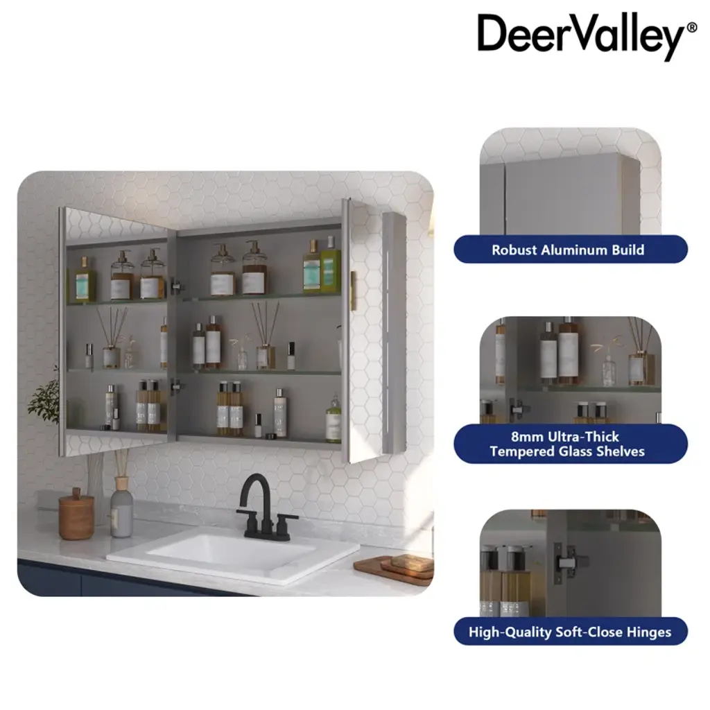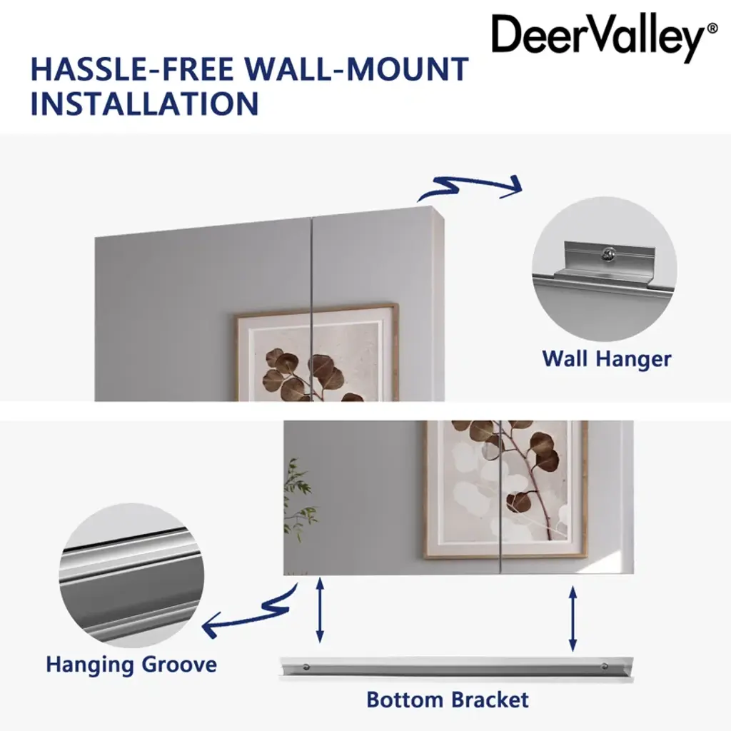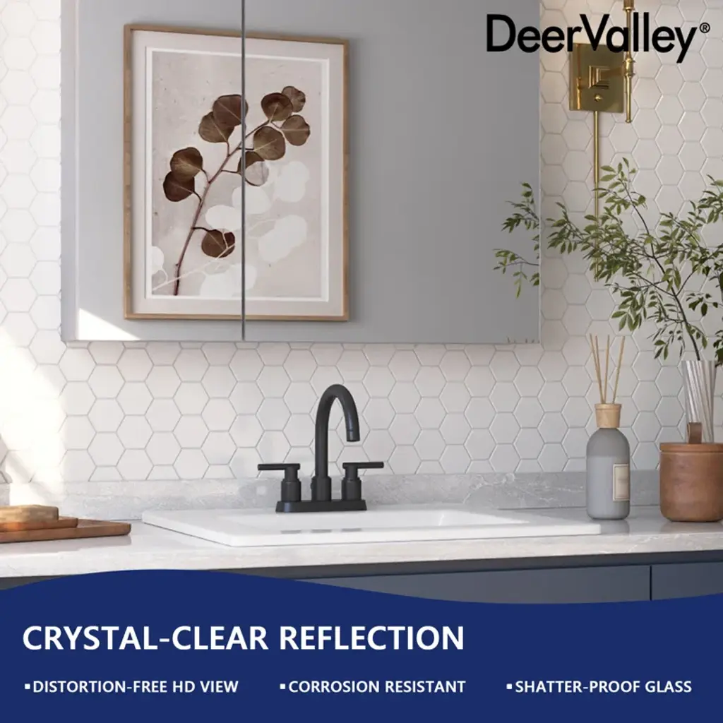 The DeerValley frameless medicine cabinet combines sleek, minimalist lines with an easy wall mount design, adding a touch of understated luxury to any bathroom. With a frameless construction and mirrored surfaces on the inside and outside, it seamlessly integrates into any bath or powder room, enhancing the overall aesthetic. The adjustable interior glass shelves provide versatile storage space for toiletries, ensuring they are conveniently organized and easily accessible. Its elegant design and hidden storage capability create a neat and clutter-free environment, elevating the functionality and appearance of your bathroom.