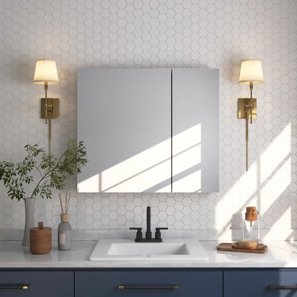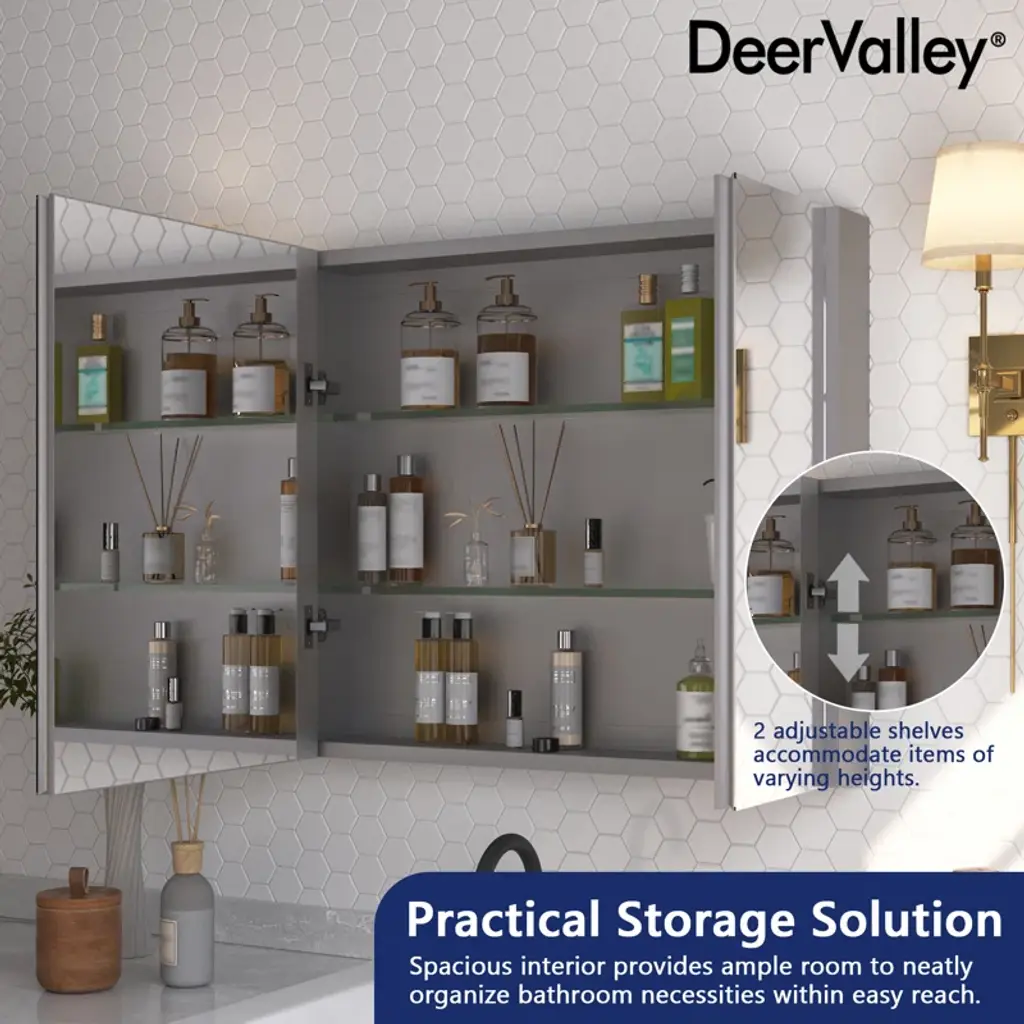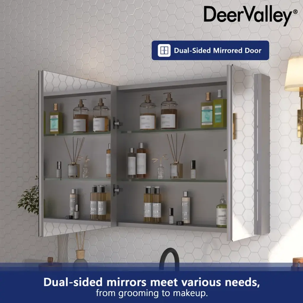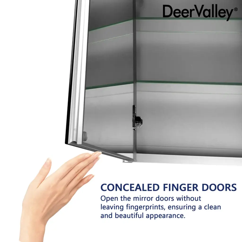 The DeerValley frameless medicine cabinet combines sleek, minimalist lines with an easy wall mount design, adding a touch of understated luxury to any bathroom. With a frameless construction and mirrored surfaces on the inside and outside, it seamlessly integrates into any bath or powder room, enhancing the overall aesthetic. The adjustable interior glass shelves provide versatile storage space for toiletries, ensuring they are conveniently organized and easily accessible. Its elegant design and hidden storage capability create a neat and clutter-free environment, elevating the functionality and appearance of your bathroom.