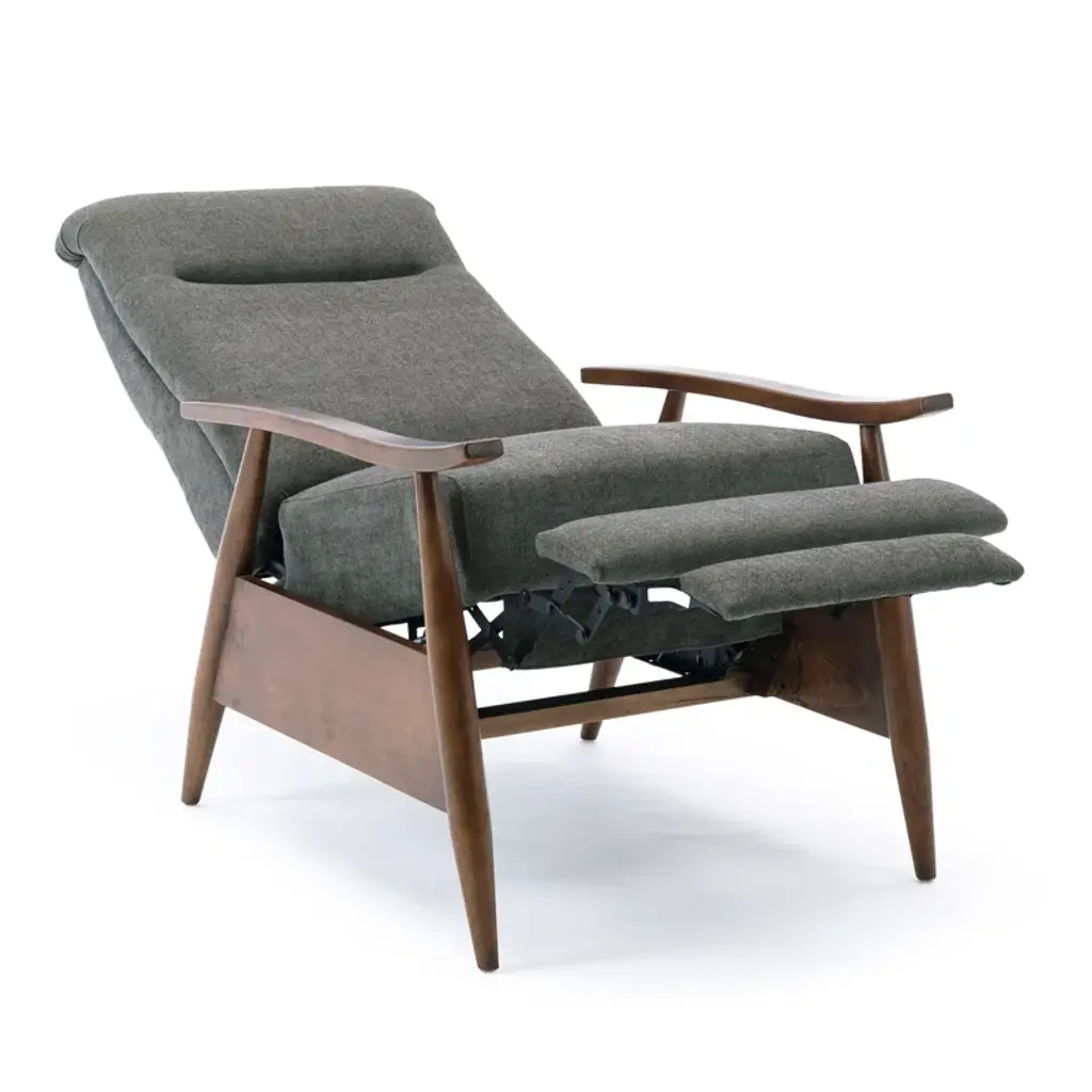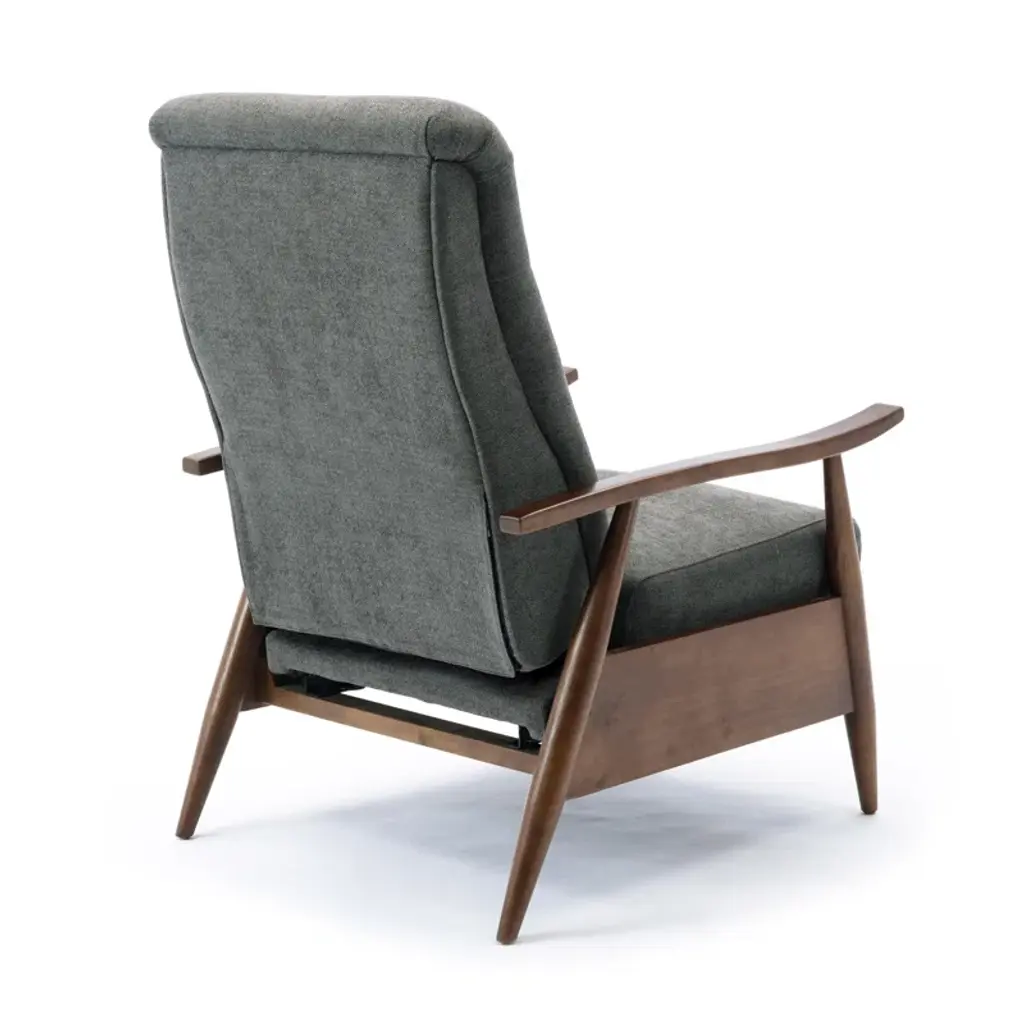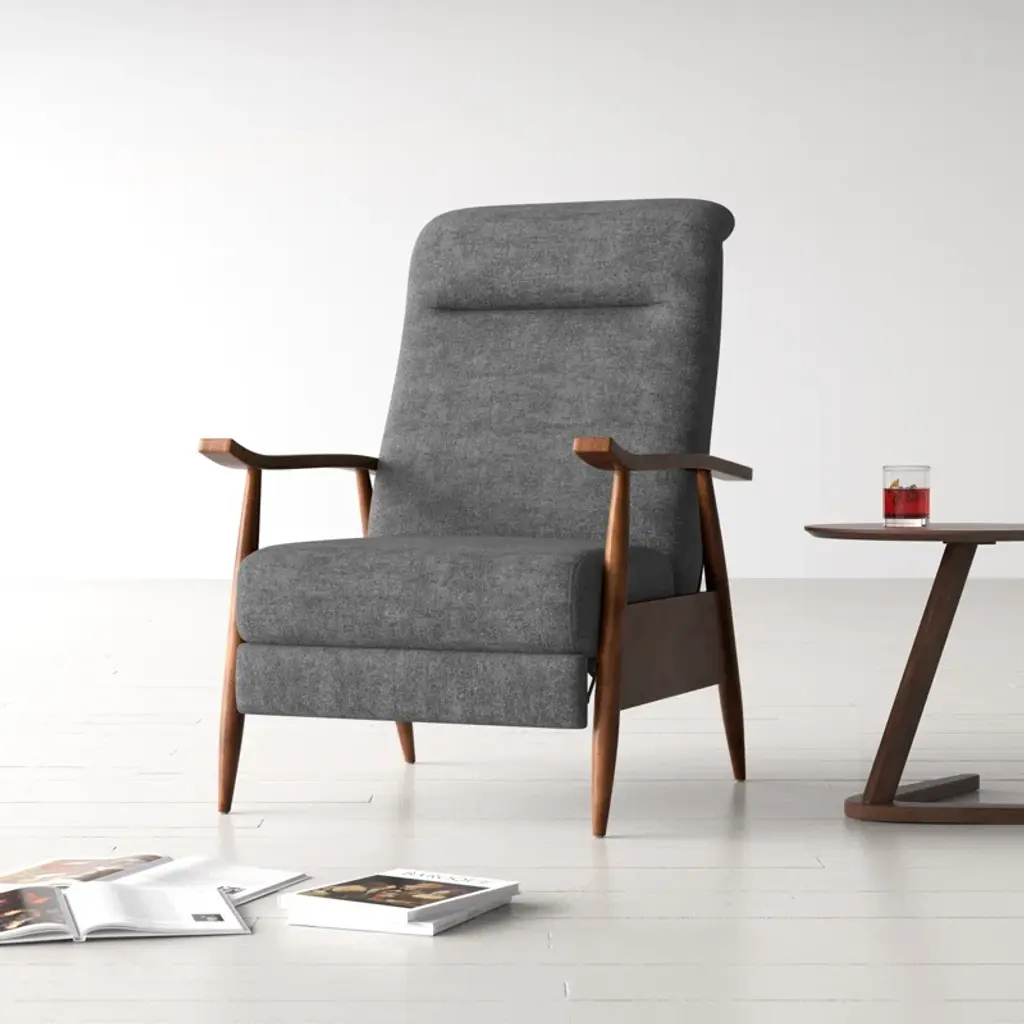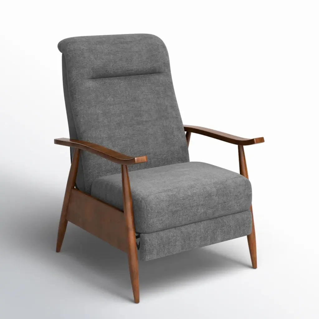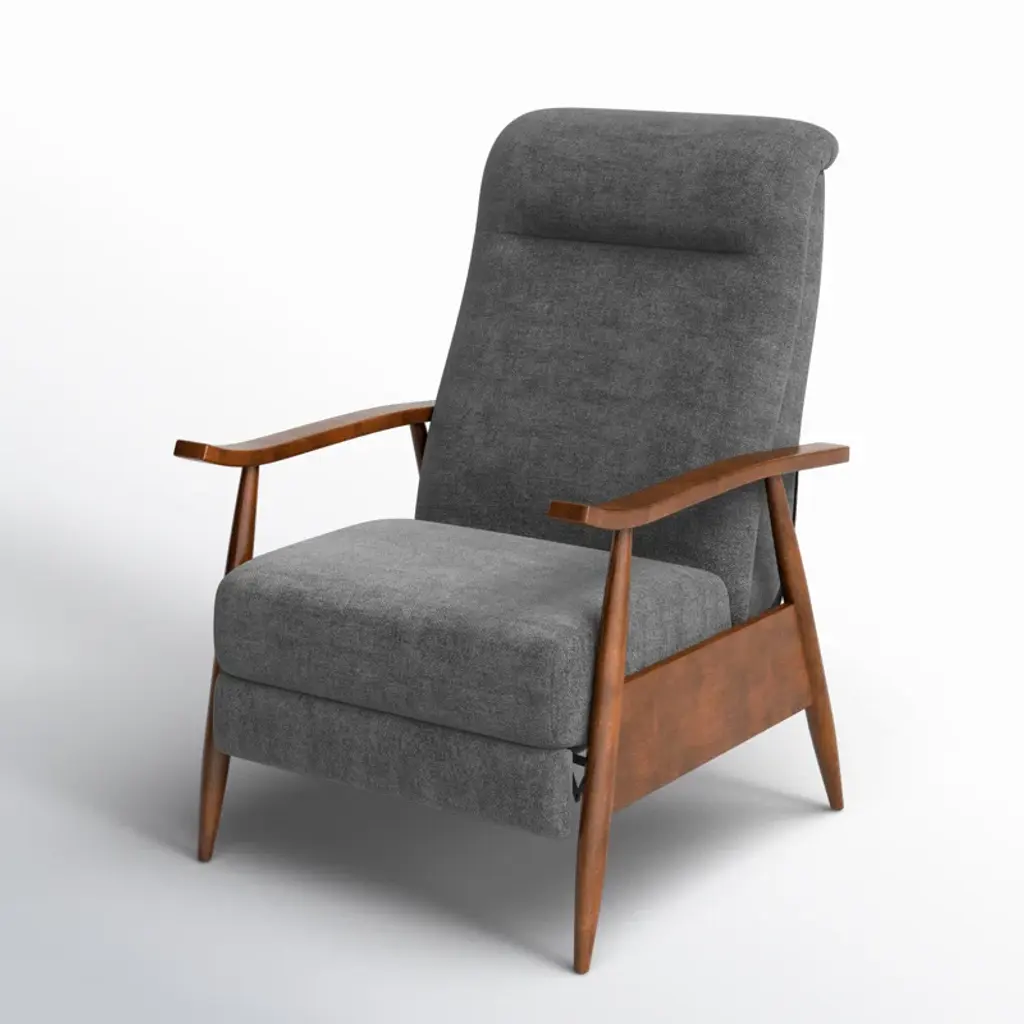 Kick back and relax in your living room or office with this contemporary recliner. Taking inspiration from mid-century modern designs, it's crafted with a blend of solid and engineered wood. It features a clean-lined design with A-frame supports creating splayed legs, flat-top arms, and a split back. It's wrapped in foam over coil springs, which create a supportive seat, while 100% polyester fabric adds a cohesive feel. Best of all, it's stain-resistant, so it holds up in busy homes.