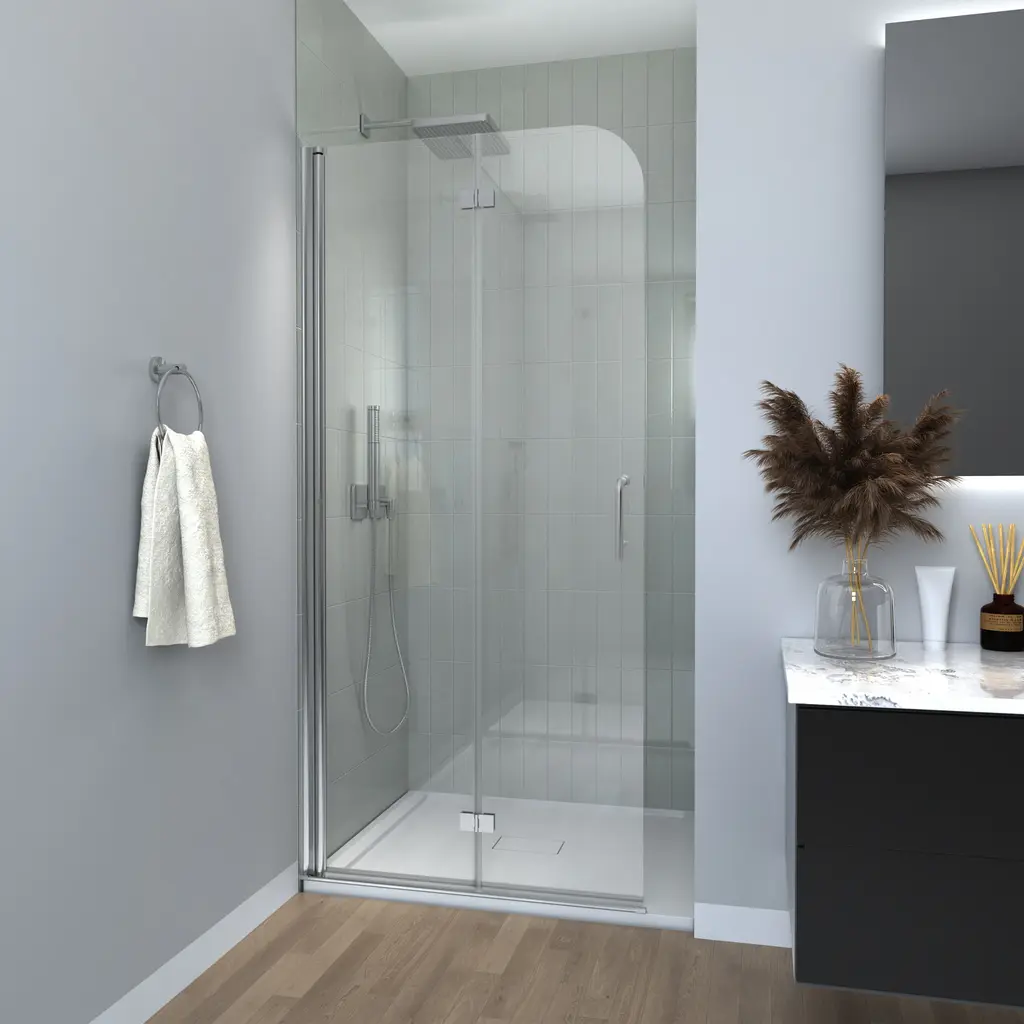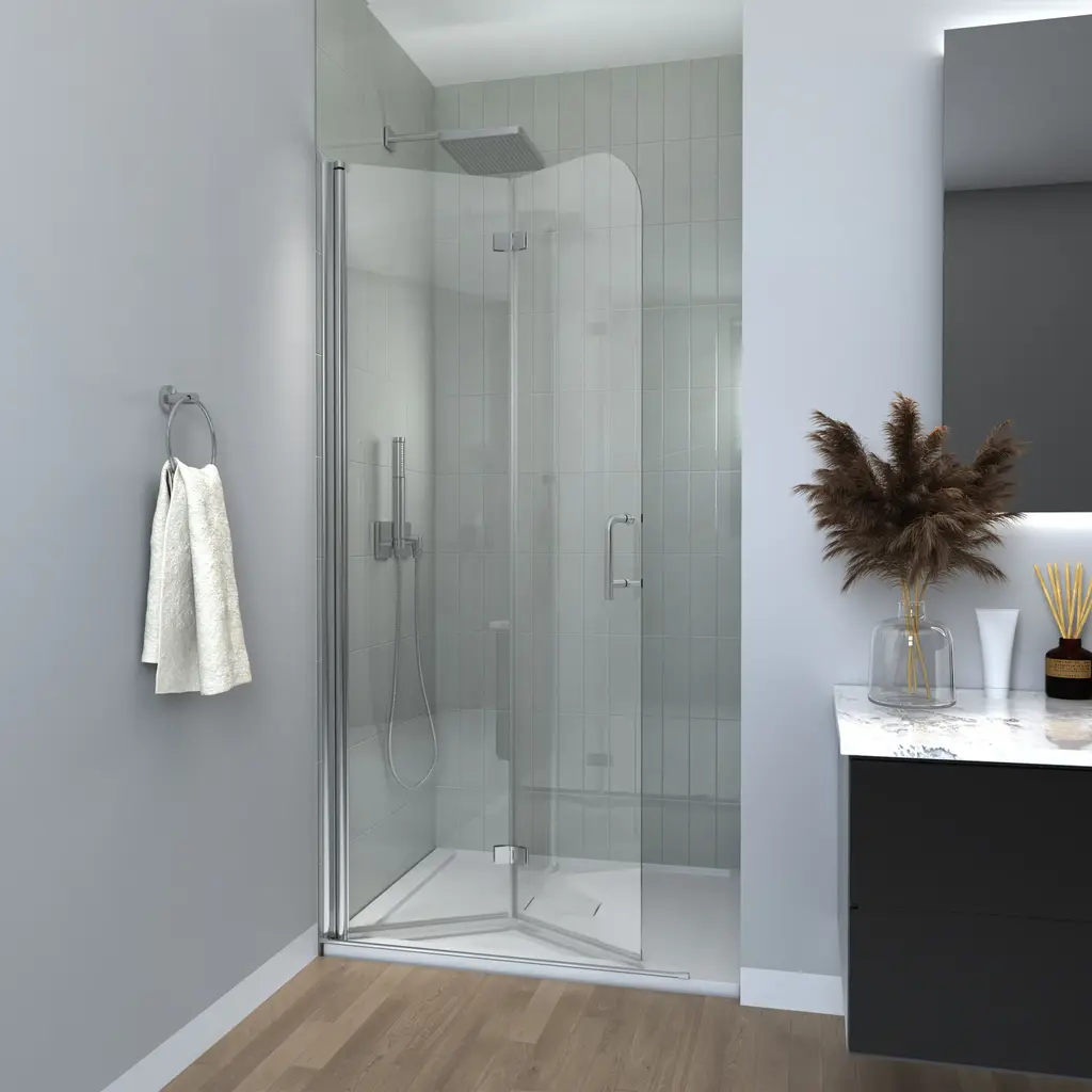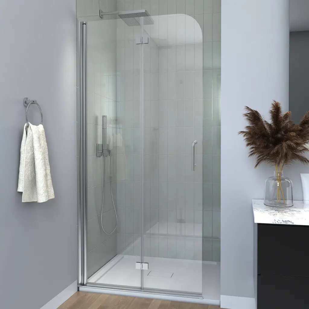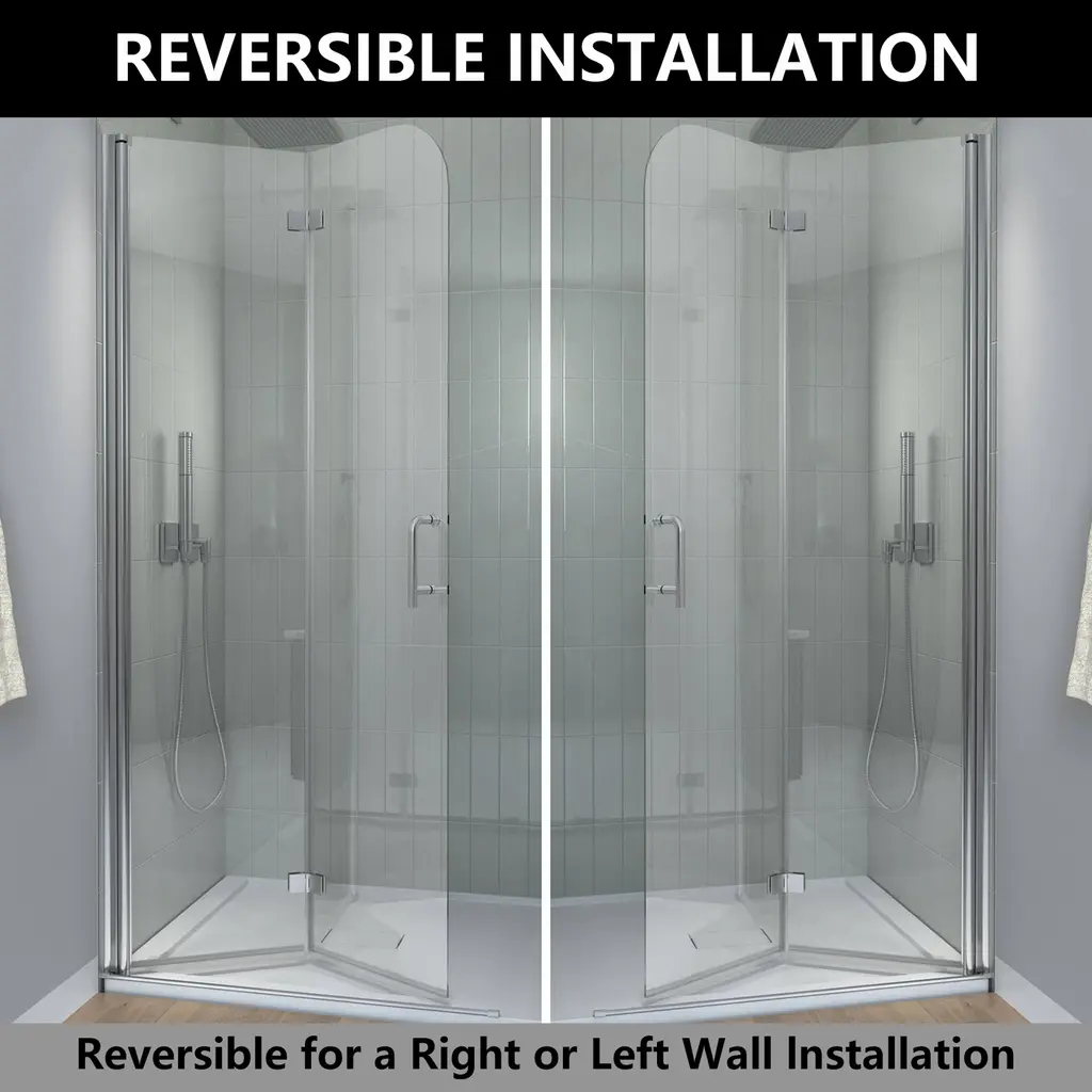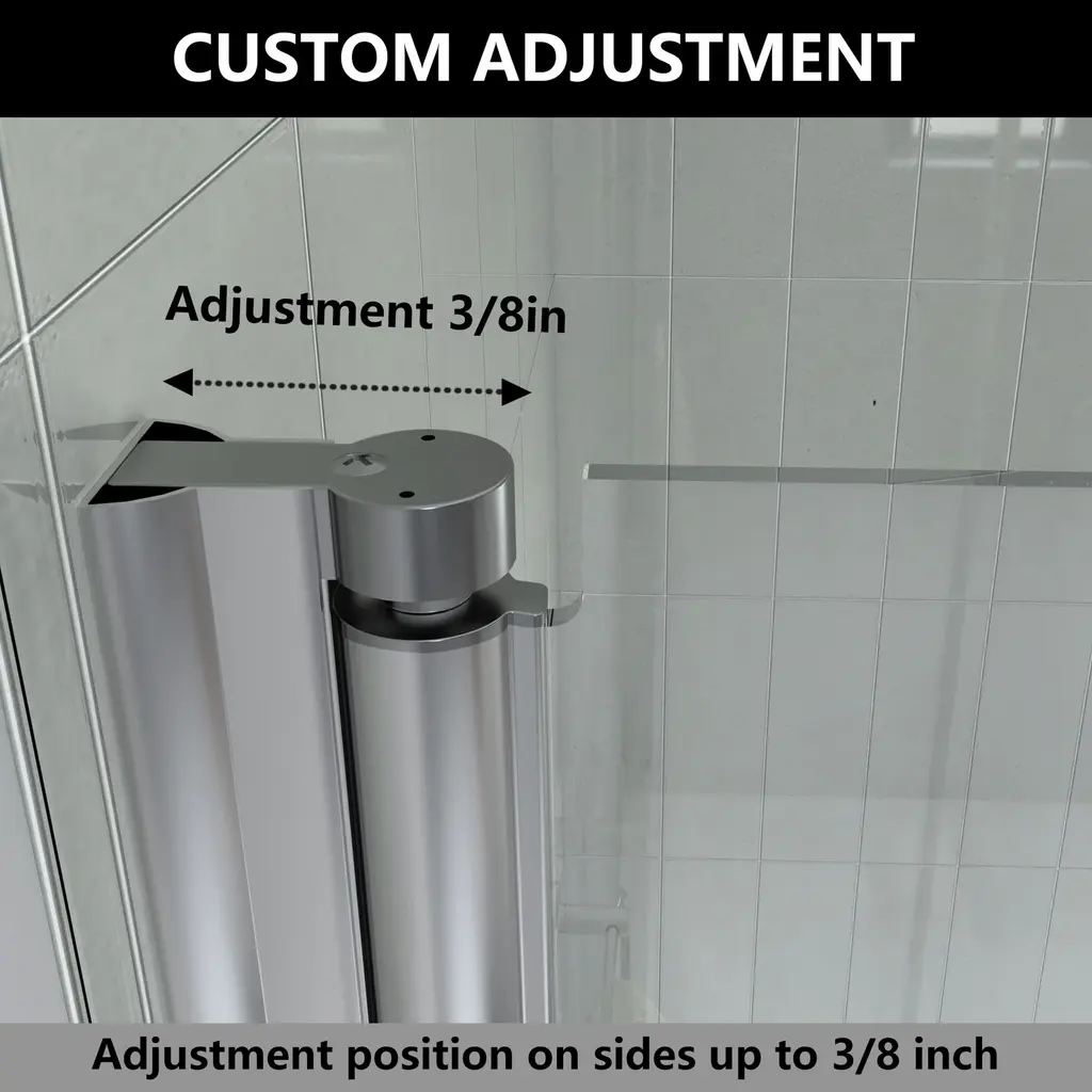 This minimalist shower door features 6mm transparent tempered glass and chrome accents, giving it a sleek and modern look. It can be installed on either side for added flexibility. The shower door is designed to be foldable, which helps to save space when not in use. Additionally, it comes equipped with a stainless steel handle that is both stylish and practical. Its clean and modern style, combined with its multifunctional design, effectively meets various needs.Features: Specifications: Shower Door Dimension:
