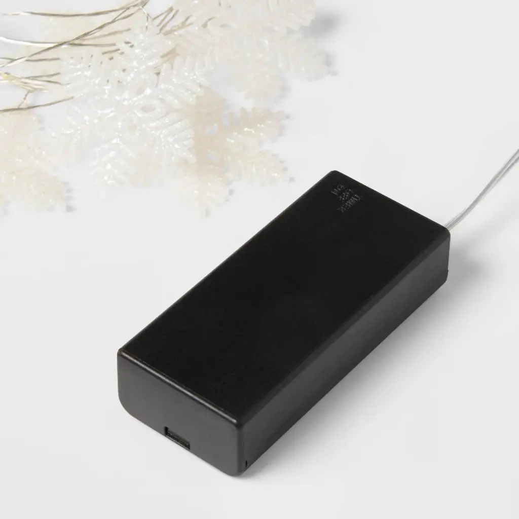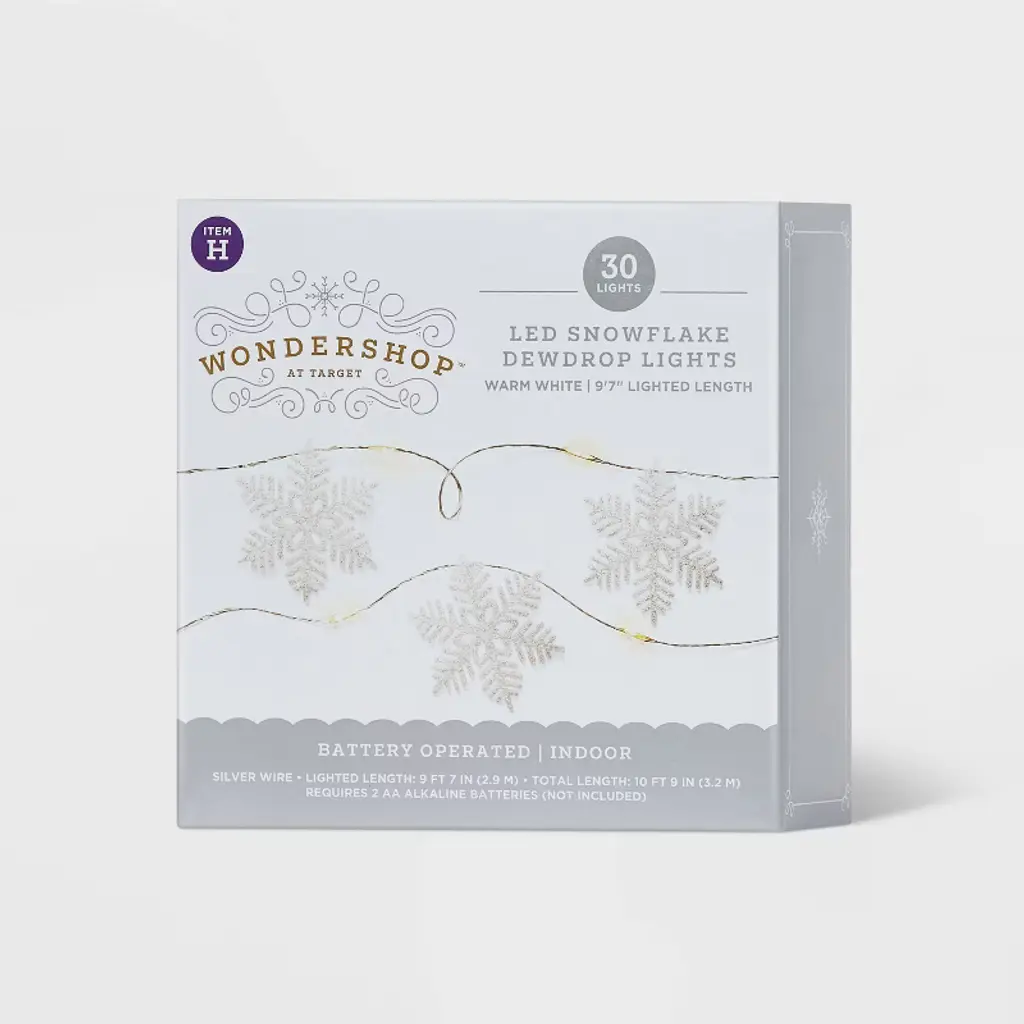 Illuminate your indoor space for the holiday season and beyond with this 30-Count LED Dewdrop with Glittered Snowflakes Christmas Indoor Novelty String Lights from Wondershop™. This string of LED lights features a silver wire that suspends glittered snowflake accents along with tiny dewdrop bulbs in warm white to cast a festive glow. This seasonal lighting accessory requires batteries for operation and the 9.7-foot lighted length lets you display the lights just about anywhere you please. Welcome to the Wondershop™.