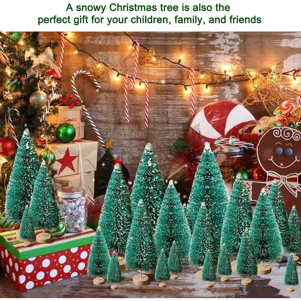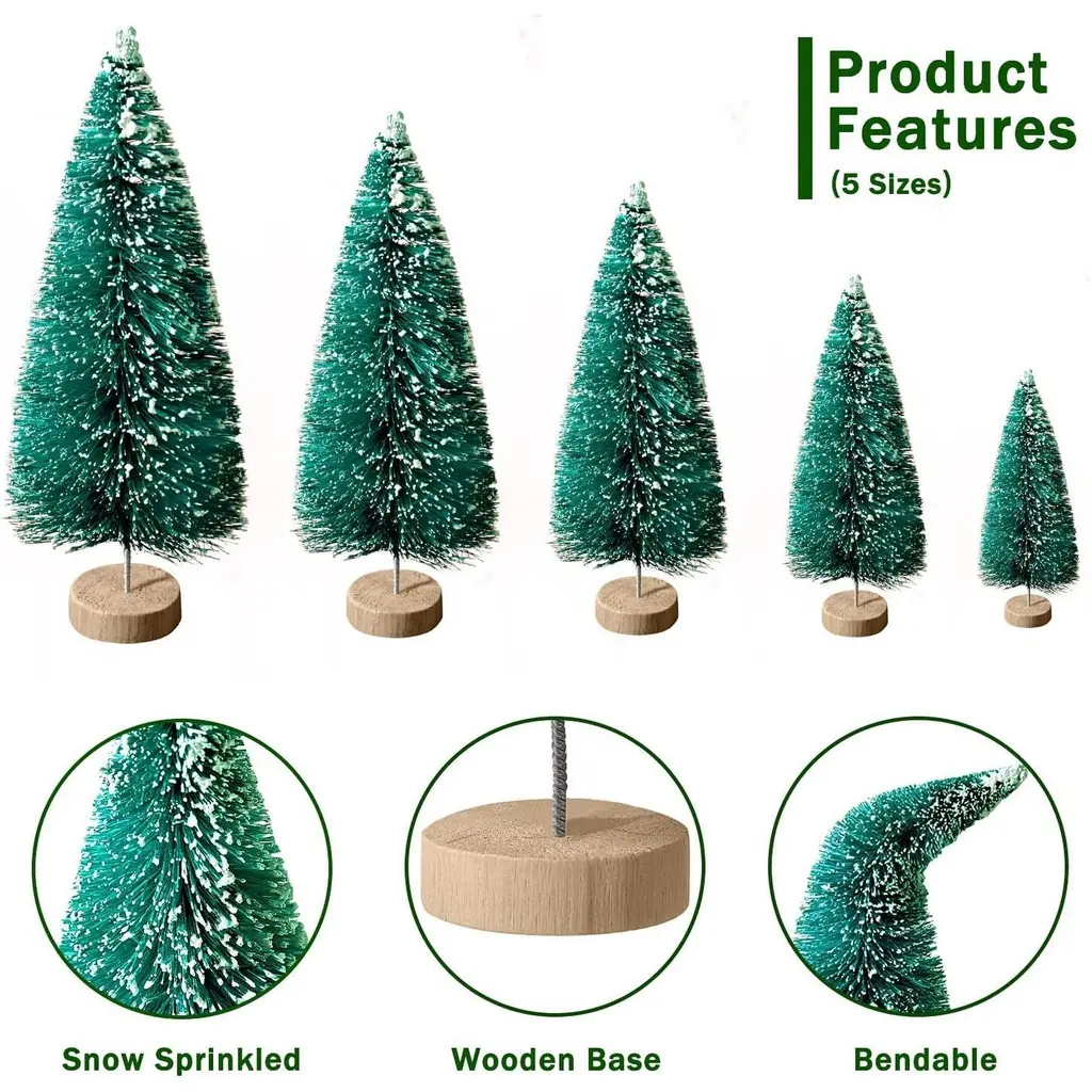 Colorful and Cute Design: The miniature fake Christmas tree set including beige Christmas trees. The tabletop Christmas tree covered with snow, looks like so realistic that you can use for craft DIY winter scenes, Christmas ornaments, Christmas party theme, beautify and bring more festival atmospherePackage Included: You will get 30pcs little Christmas trees with 5 sizes 2.3-5.2 inch. Different styles and sizes to meet your different need for holiday decor and Christmas room decorPremium Material: bottle tree is made of sisal silk and plastic with durable wooden base, easy to stand .The small Christmas tree is soft and bendable, suitable for create a snow white party decorations or vintage Christmas decorationsWide-ranging Usage: Table top Christmas trees are suitable for decorating Christmas party, home, office, living room, tabletop,window and other occasions