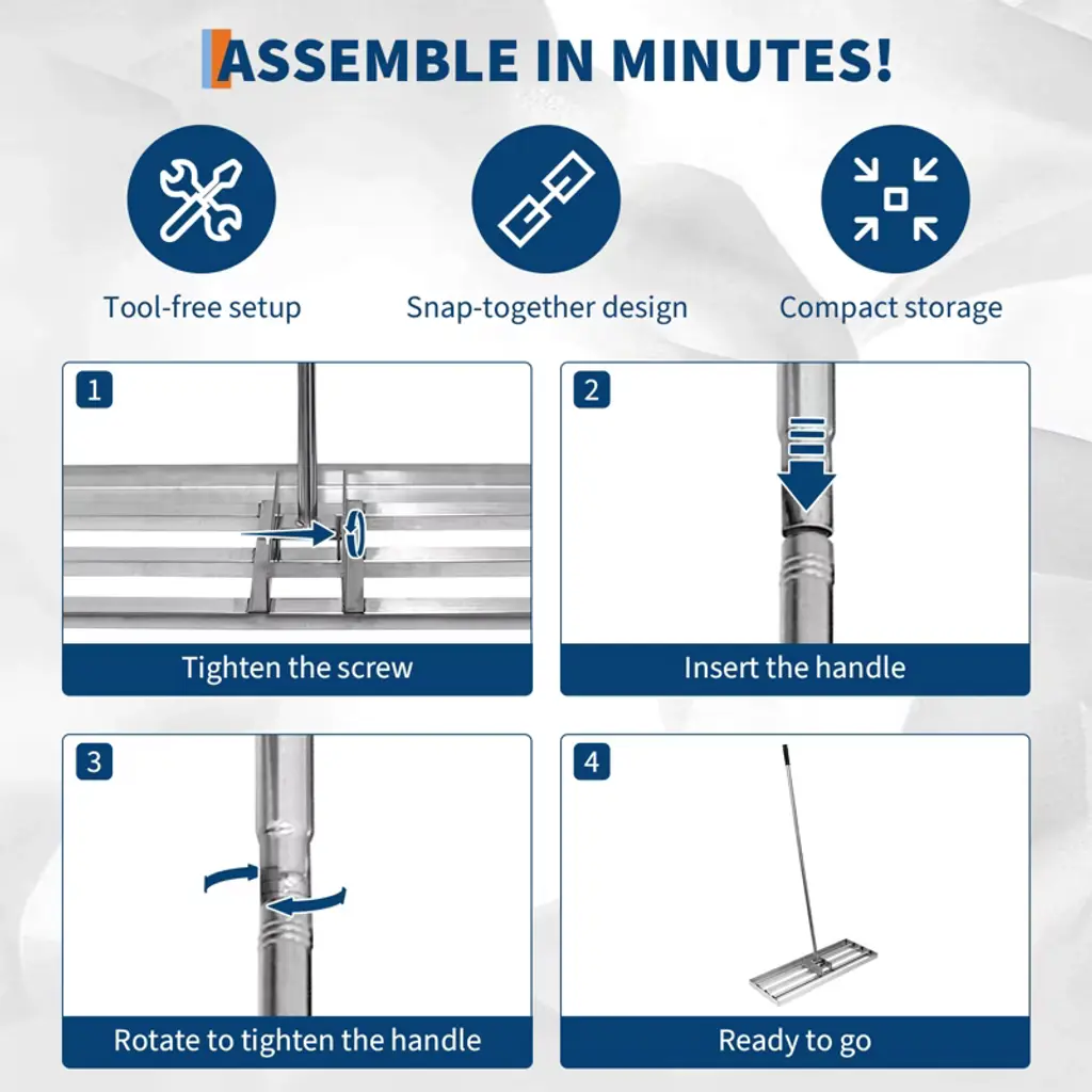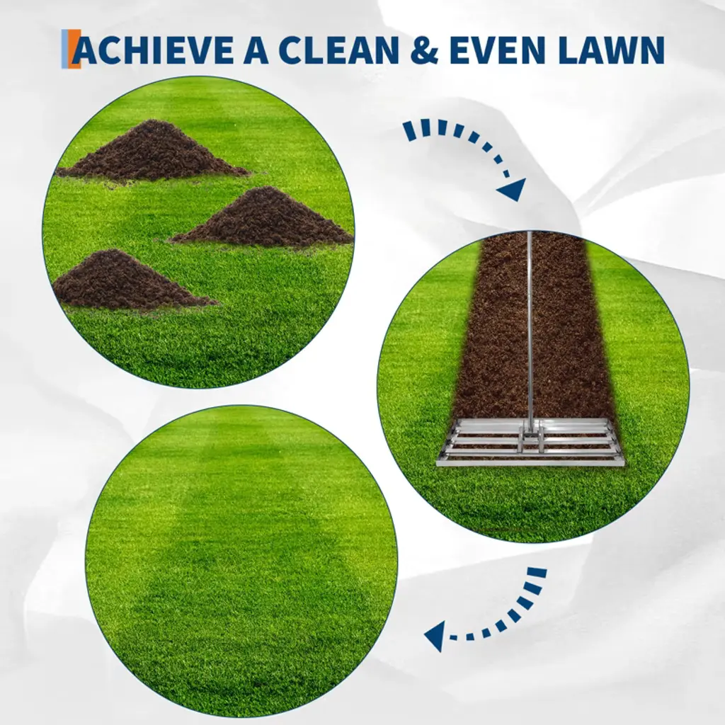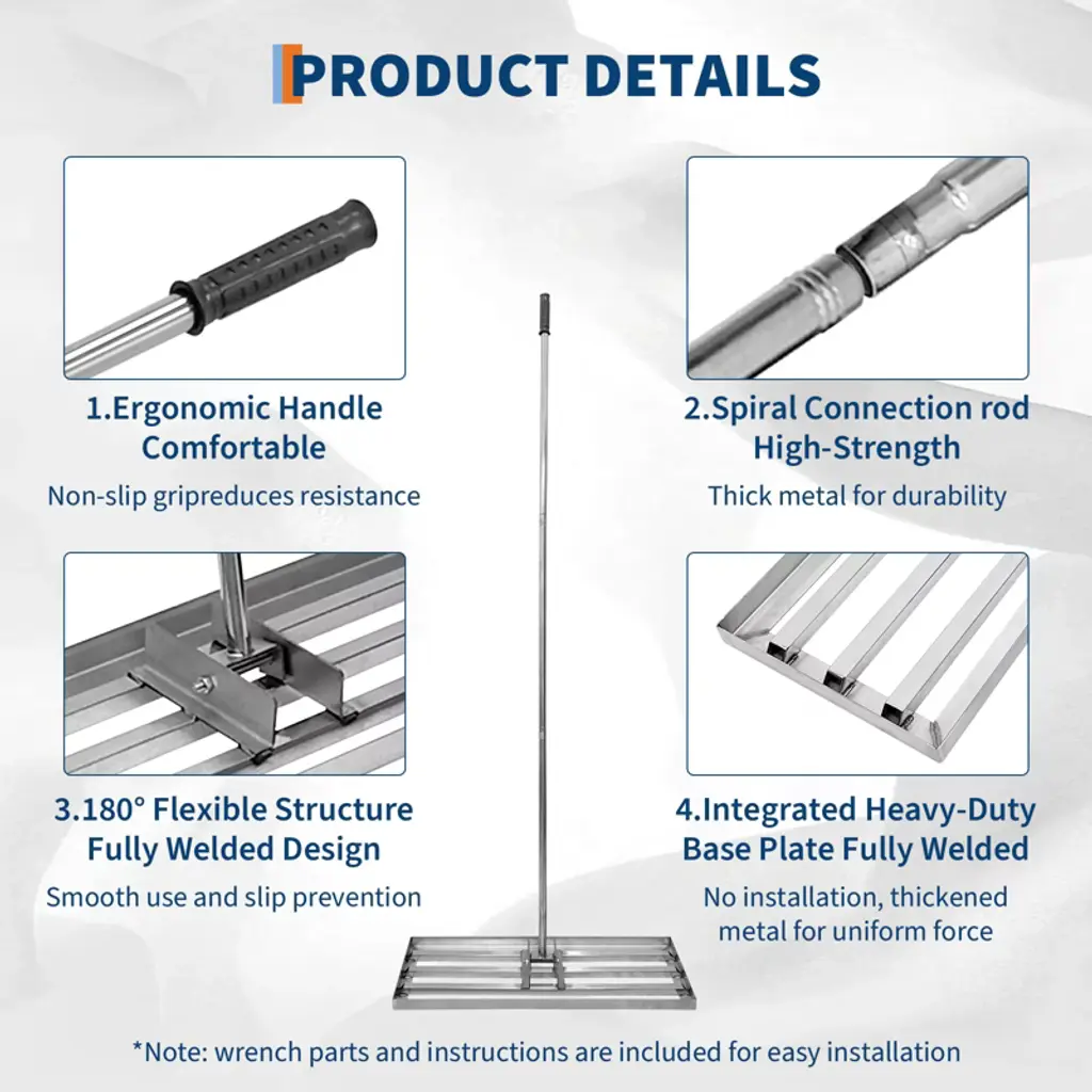 Level large lawns 3X faster with this pro-grade stainless steel rake! Features a 30" extra-wide plate for rapid soil/top-dressing coverage, an anti-flip curved edge for snag-free gliding, and an adjustable 35–72" handle to eliminate back strain. Built with reinforced 201 stainless steel for lifelong rust resistance. Perfect for golf courses, sports fields, and backyard renovations. Includes wrench + manual.Key SpecsPlate Size: 30" L x 10" WMaterial: 201 Stainless Steel (2.0mm)Handle: 3-Section Adjustable (35–72")Weight: 12.1 lbsIncluded: Rake, Wrench, Assembly ManualPro Tips:Work Smarter: Cover 500 sq. ft. in 15 minutes with overlapping passes.Easy Maintenance: Hose off debris after use; stainless steel won’t rust.Golf Prep: Use wide plate for flawless top-dressing on greens.⚠️Note: Avoid rock terrain. Store dry. Not for asphalt/concrete. Grass >1.5" reduces effectiveness.