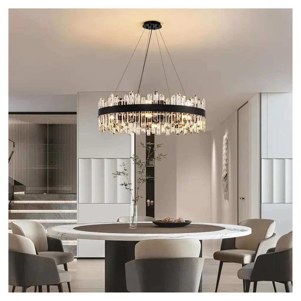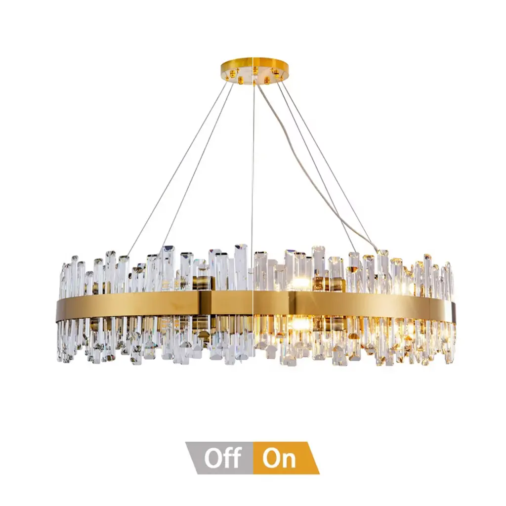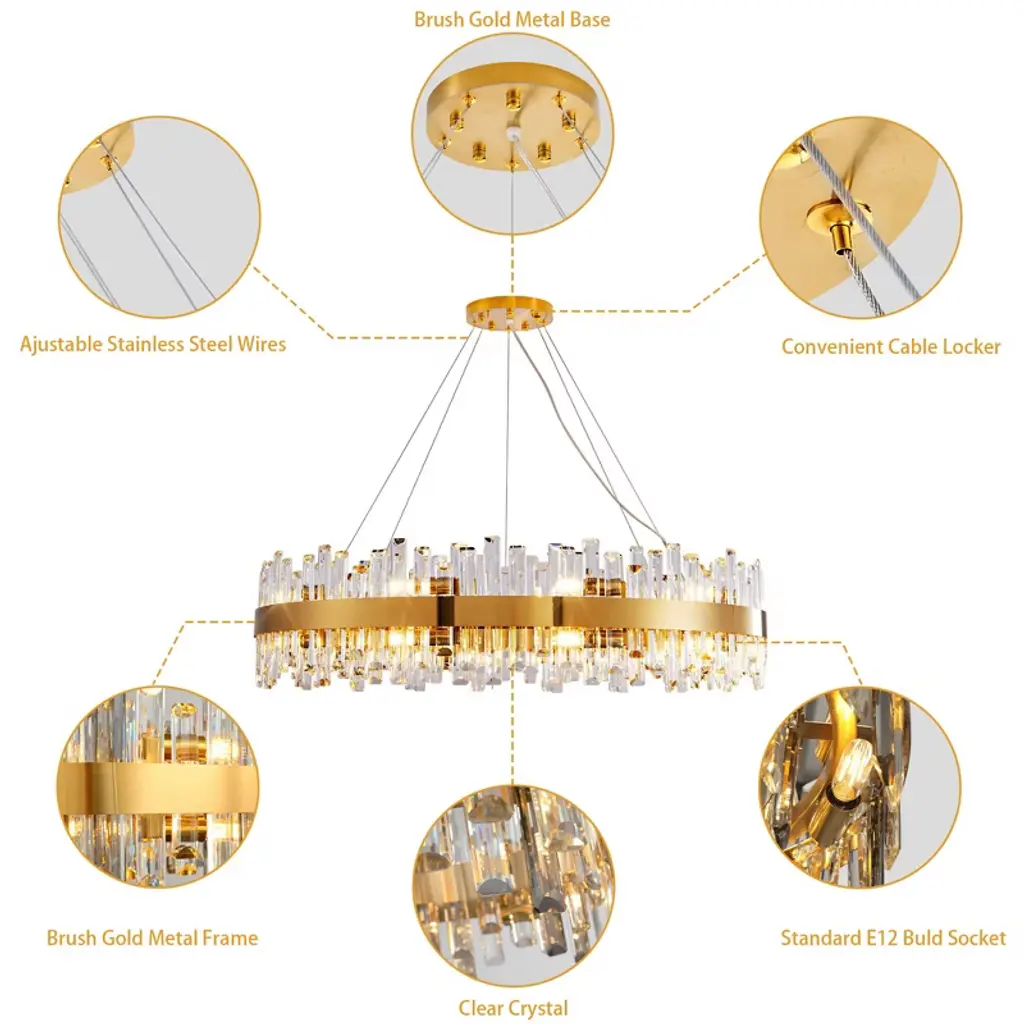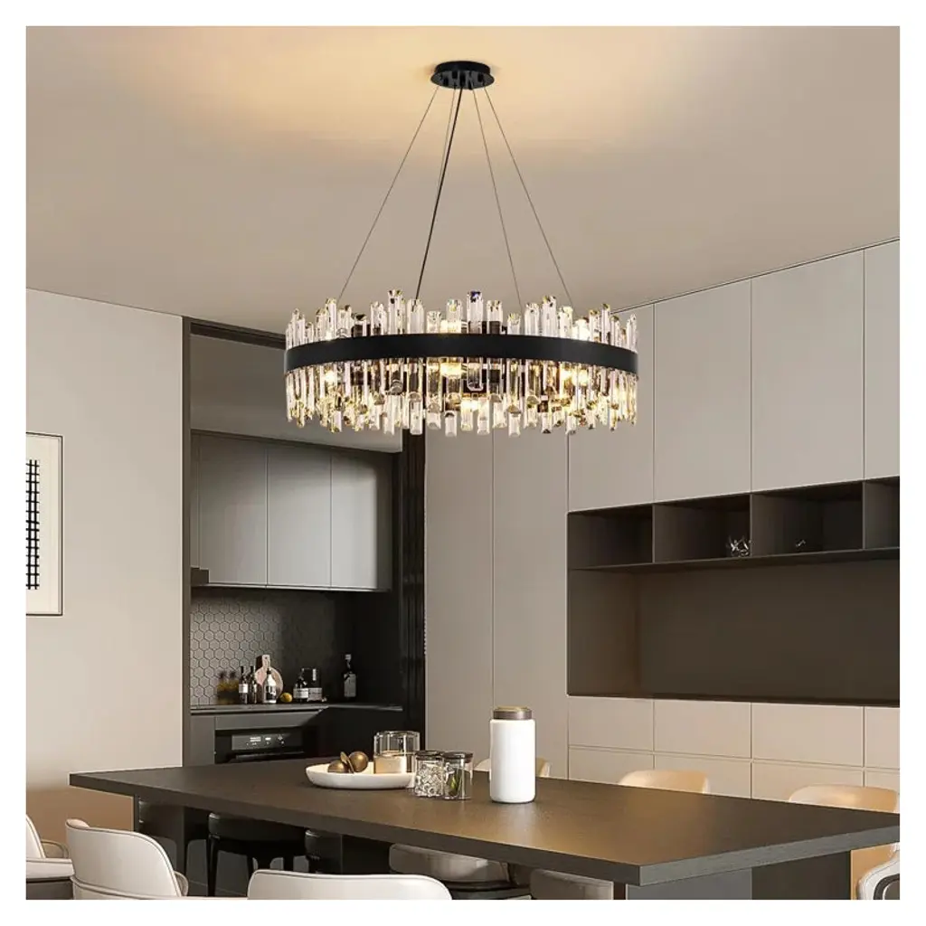 This modern crystal chandelier, made of high-quality metal and transparent k9 crystal, is very unique and luxury. The k9 crystals are unevenly surrounded by the metal frame, creating a colorful lighting under the refraction of light. Sparkling and dazzling, illuminating the entire room in all directions, adding a touch of luxury and elegance to the room.