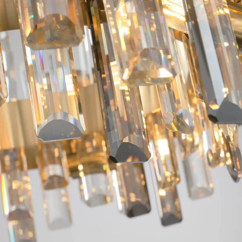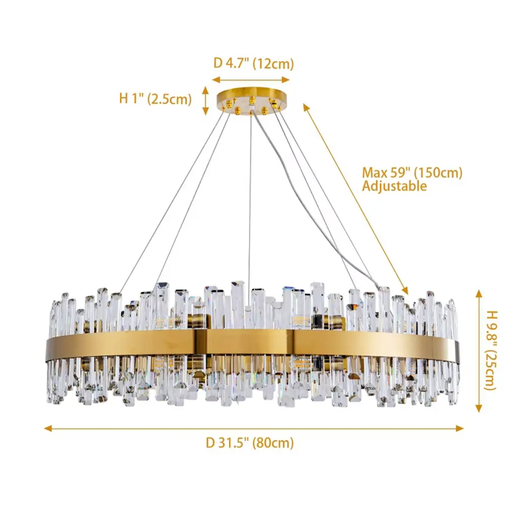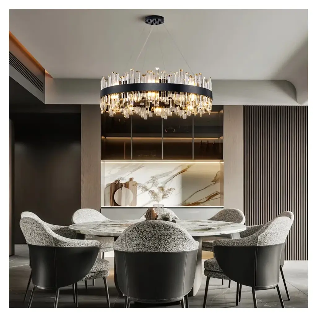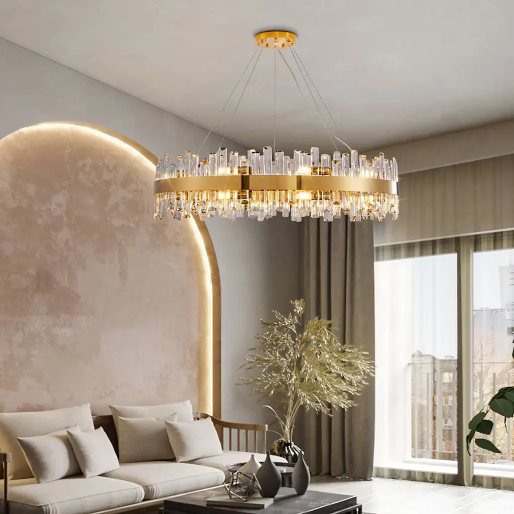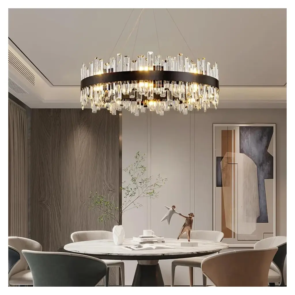 This modern crystal chandelier, made of high-quality metal and transparent k9 crystal, is very unique and luxury. The k9 crystals are unevenly surrounded by the metal frame, creating a colorful lighting under the refraction of light. Sparkling and dazzling, illuminating the entire room in all directions, adding a touch of luxury and elegance to the room.