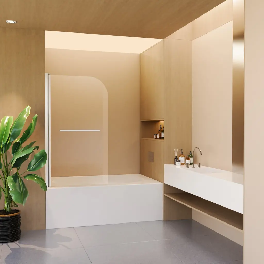 Upgrade your bathroom with the 31"W x 55"H frameless folding pivot bathtub door. Its frameless design adds a contemporary touch, elevating the overall aesthetic of your shower space. The 1/4 inch (6mm) thick SGCC tempered glass door not only provides a clear view but also guarantees durability and safety. Frameless Design: Enhance the elegance of your bathroom with the 31"W x 55"H frameless folding pivot bathtub door. The sleek and modern design adds a touch of sophistication to your shower space. Tempered Glass Door: Made with 1/4 inch (6mm) thick SGCC tempered glass, this bathtub door provides strength, durability, and safety. Enjoy a crystal-clear view while ensuring a secure showering experience. Double Folding Door Panel: The innovative double folding door panel allows for convenient access to your bathtub. The doors can be folded inward at a 90-degree angle, providing flexibility and space-saving benefits. Reversible Installation: Customize the opening direction of the door panel to suit your preferences. Whether you prefer a left-hand or right-hand opening, this bathtub door supports reversible installation, offering versatility for any bathroom layout. Lightweight and Durable: The main structure of this bathtub door is constructed from lightweight and durable aluminum alloy, ensuring long-lasting performance without compromising on quality.