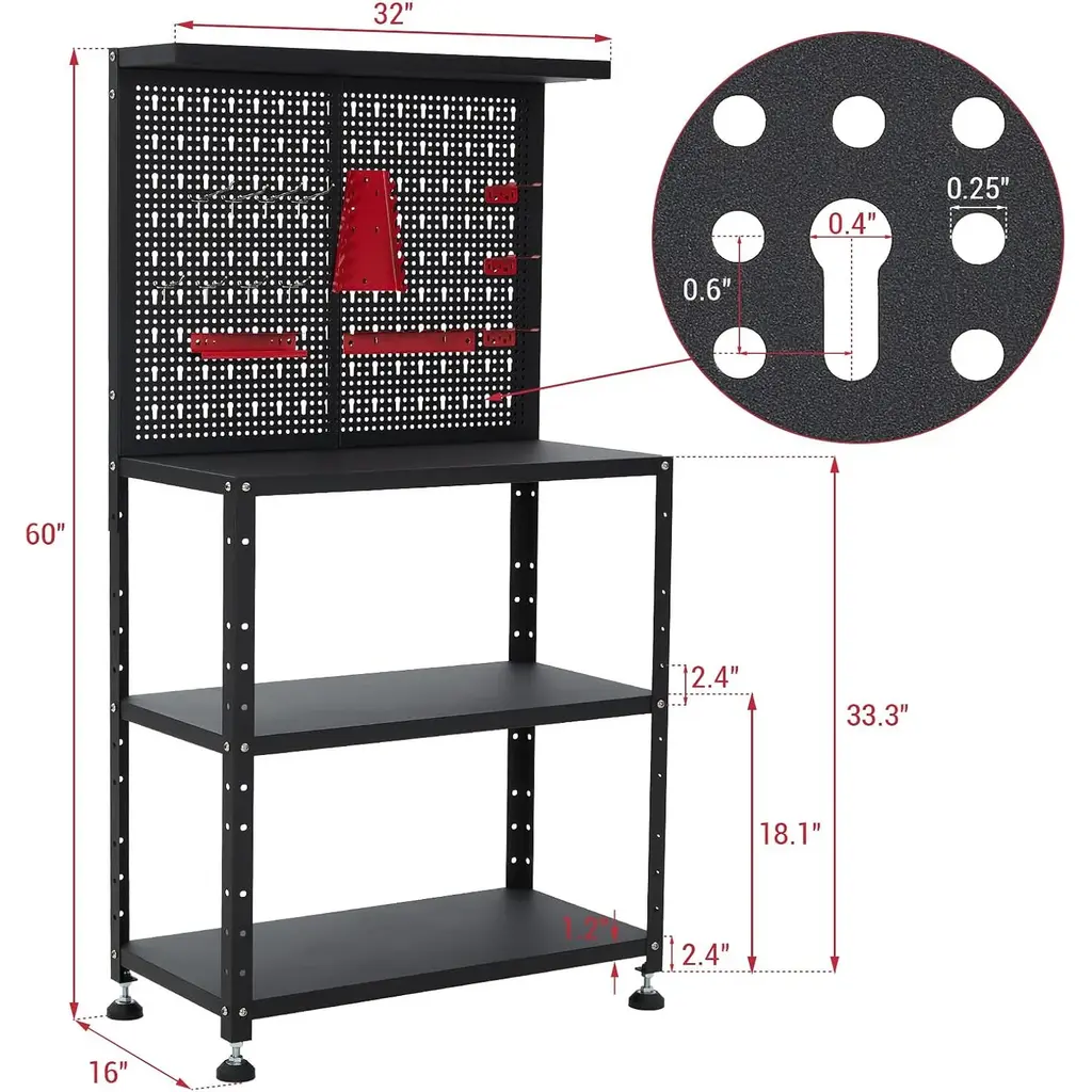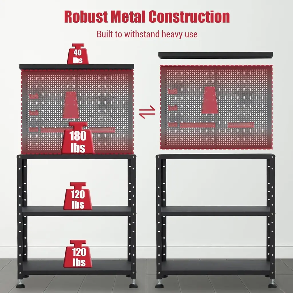 Introducing the Heavy-Duty Workbench, a robust and versatile solution for your workspace needs. Built with 1.2mm thickened steel tubes and cross-braced legs, this garage work table offers exceptional stability and load-bearing capacity (up to 460 lbs). Designed for industrial use, it features:• Adjustable Tool Storage: Each tier can be easily and securely adjusted with a hole design, accommodating a wide variety of items according to your needs.• Pegboard and Shelves: A large pegboard, hanging accessories, and 2-tier spacious lower shelves provide ample storage and organization, keeping your tools within easy reach for maximum efficiency.• Four Adjustable Legs: Equipped with anti-slip foot pads, this workbench is ideal for uneven floors and seated tasks, ensuring stability in any setting.• Effortless Assembly: With clearly marked parts and an easy-to-follow instruction manual, assembly is quick and hassle-free—no additional help required.Wide Application: Fit for garages, workshops, tool rooms, warehouses, and more, this 3-tier metal workbench is a practical and space-saving addition to your workspace. Keep your area clean, organized, and efficient with the Heavy-Duty Workbench.