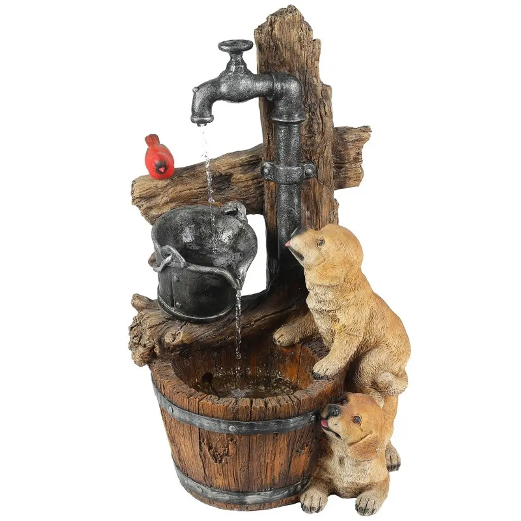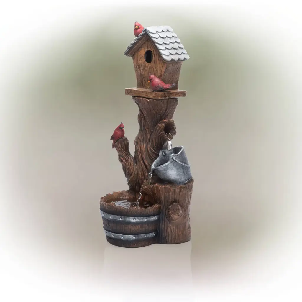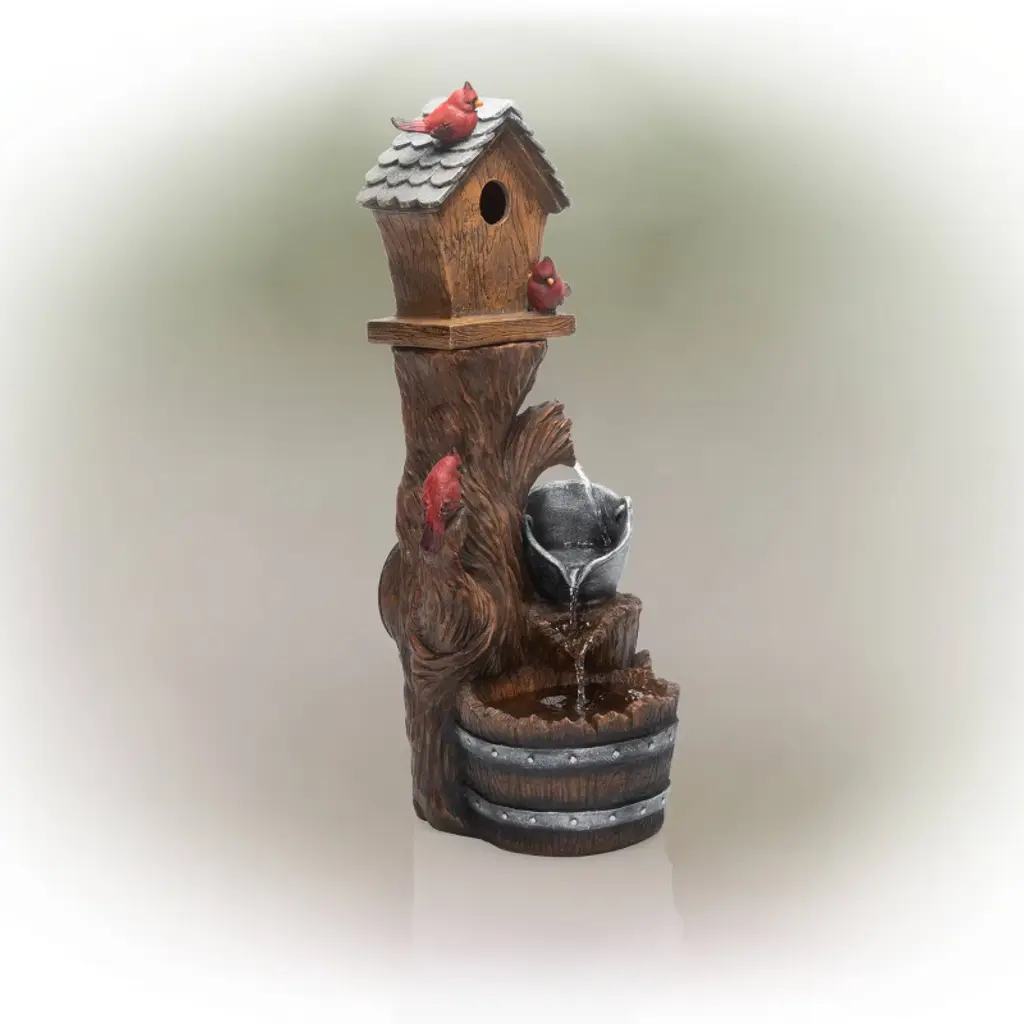 32" Resin Cardinal Birdhouse Cascading Barrel Fountain Brown - Alpine Corporation: Electric Polyresin Garden Decor With 2 Basins