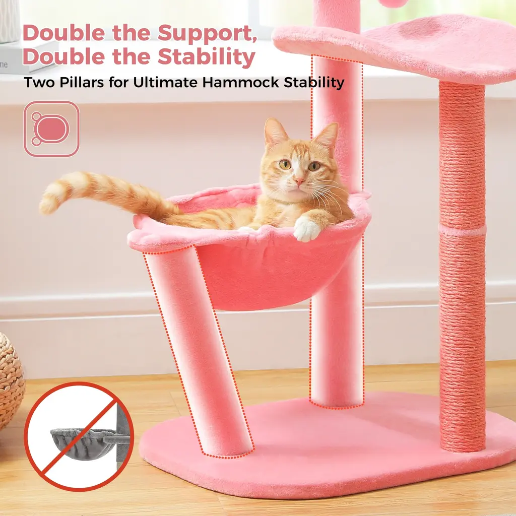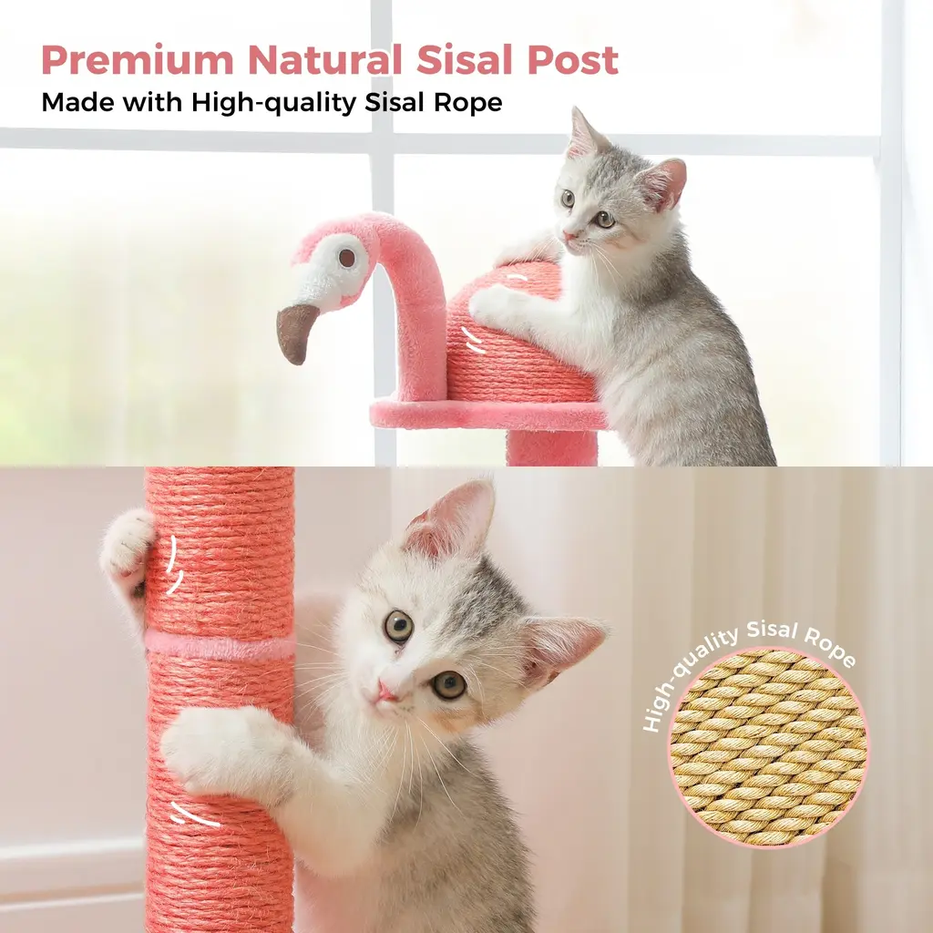 Flamingo Fancy Design - Inspired by the graceful pose of a lounging flamingo, this design blends artistic flair with practicality. It's like giving your cat a trendy hangout spot that's both stylish and functional—a perfect fusion of fashion and functionality!Flamingo Funhouse Climbing Tree - With two vibrant pink full-sisal scratching posts and a sizable 7.87-inch full-sisal ball, this cat tree shaped like a flamingo is the ultimate scratching paradise for your feline friend. The semi-circular body crafted from 100% natural sisal provides the perfect scratching posture and an unbeatable scratching experience. Say goodbye to scratched furniture and hello to happy, contented kitties!Flamingo Fantasy Playground - With its four-tiered design, this cat tree taps into your cat's instinctual love for climbing, while adding a touch of artistic flair with a plush flamingo toy. Complete with a cozy hammock and a spacious platform, it's a kitty paradise that's perfect for small to medium-sized cats.Flamingo-Inspired Packaging - Delightfully presented in a vibrant flamingo-themed box, this cat tree makes for a charming and eye-catching gift option. Perfect for any cat lover, it's a present that's as fun to give as it is to receive, adding a touch of whimsy to any feline's world.Rock-Solid Stability: Thanks to its enlarged base and three sturdy pillars, this climbing frame boasts unmatched stability, guaranteeing a safe and secure environment for your cat's adventures. Whether they're resting or climbing, even small to medium-sized cats can enjoy peace of mind knowing they're on a rock-solid structure built just for them.