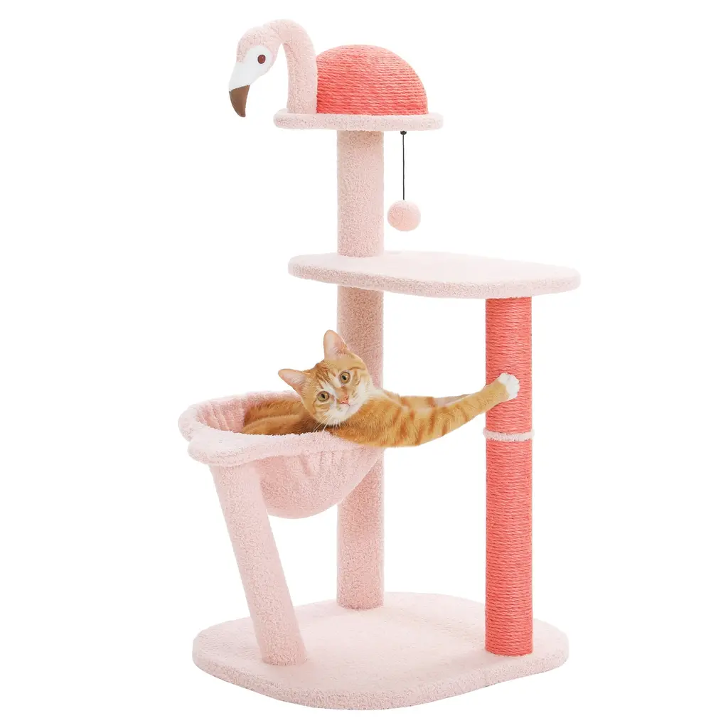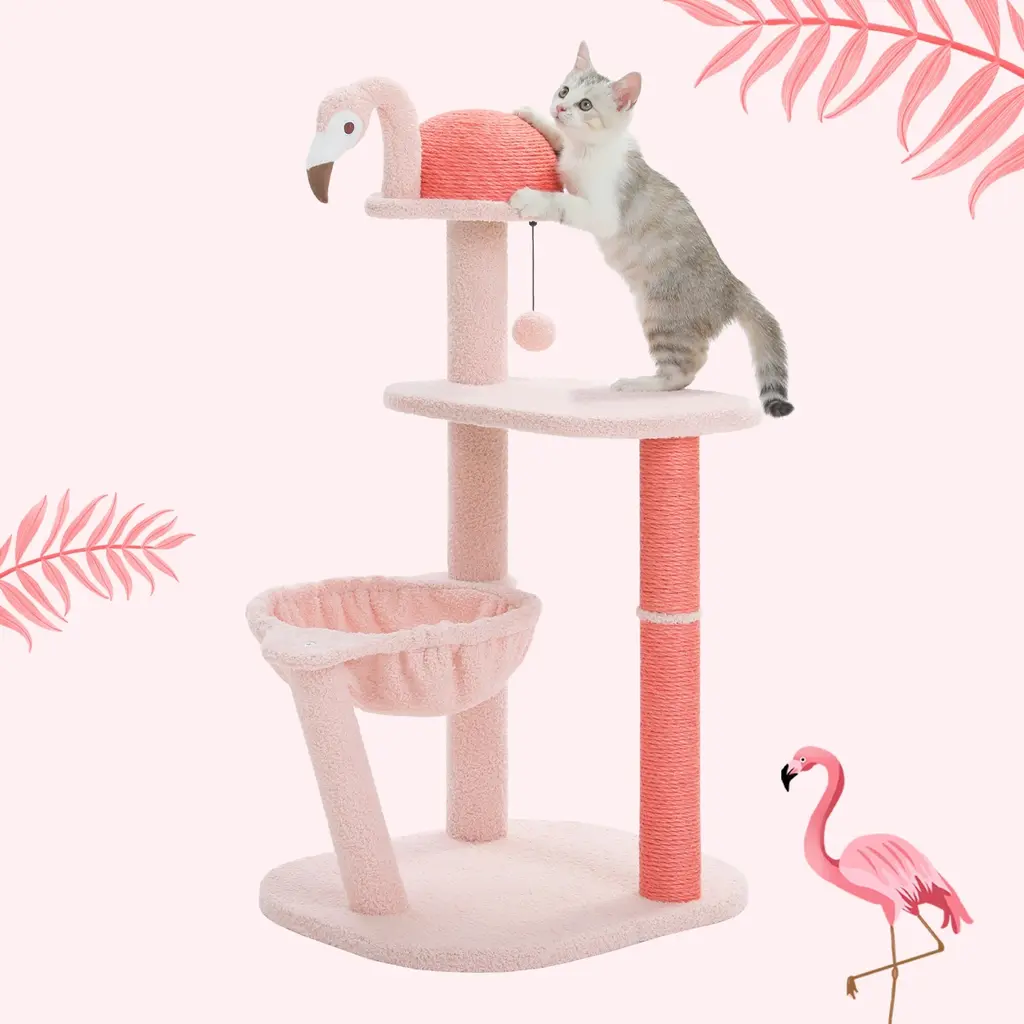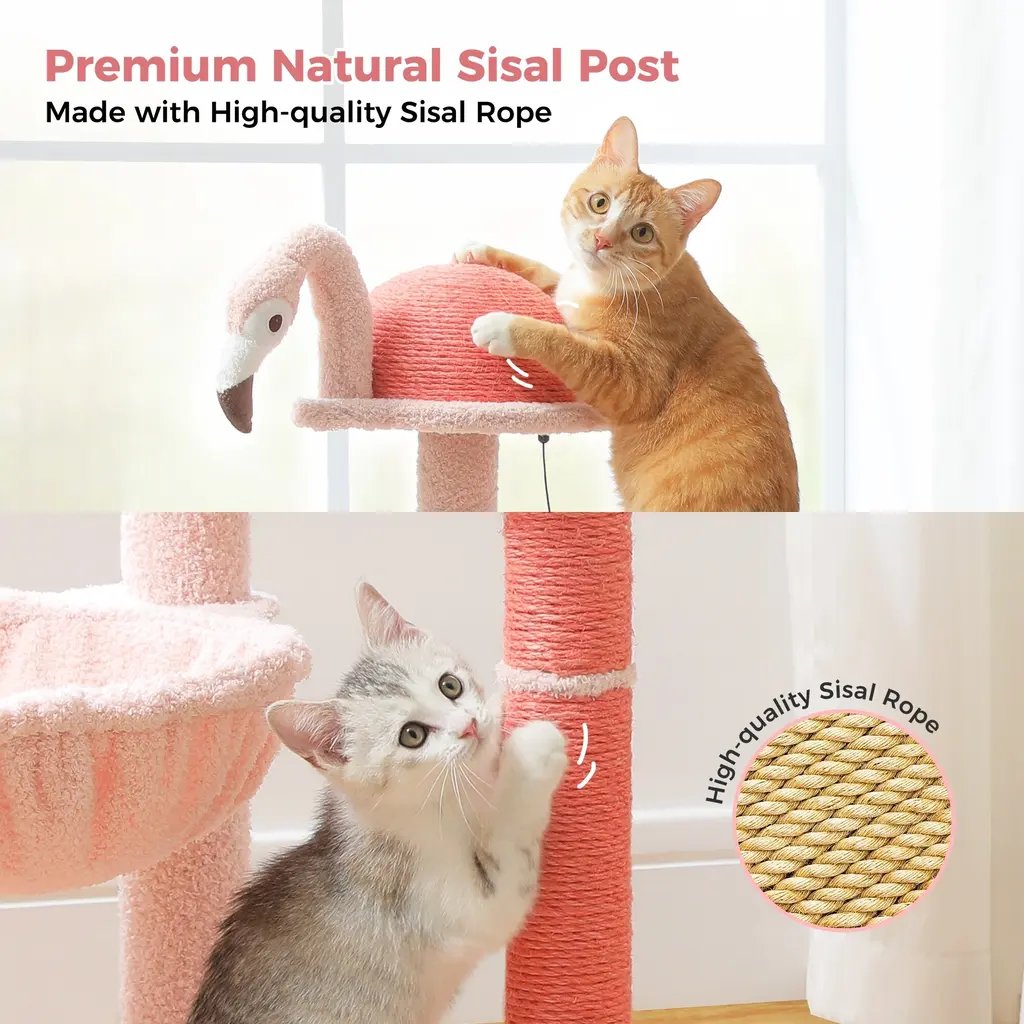 Flamingo Fancy Design - Inspired by the graceful pose of a lounging flamingo, this design blends artistic flair with practicality. It's like giving your cat a trendy hangout spot that's both stylish and functional—a perfect fusion of fashion and functionality!Flamingo Funhouse Climbing Tree - With two vibrant pink full-sisal scratching posts and a sizable 7.87-inch full-sisal ball, this cat tree shaped like a flamingo is the ultimate scratching paradise for your feline friend. The semi-circular body crafted from 100% natural sisal provides the perfect scratching posture and an unbeatable scratching experience. Say goodbye to scratched furniture and hello to happy, contented kitties!Flamingo Fantasy Playground - With its four-tiered design, this cat tree taps into your cat's instinctual love for climbing, while adding a touch of artistic flair with a plush flamingo toy. Complete with a cozy hammock and a spacious platform, it's a kitty paradise that's perfect for small to medium-sized cats.Flamingo-Inspired Packaging - Delightfully presented in a vibrant flamingo-themed box, this cat tree makes for a charming and eye-catching gift option. Perfect for any cat lover, it's a present that's as fun to give as it is to receive, adding a touch of whimsy to any feline's world.Rock-Solid Stability: Thanks to its enlarged base and three sturdy pillars, this climbing frame boasts unmatched stability, guaranteeing a safe and secure environment for your cat's adventures. Whether they're resting or climbing, even small to medium-sized cats can enjoy peace of mind knowing they're on a rock-solid structure built just for them.