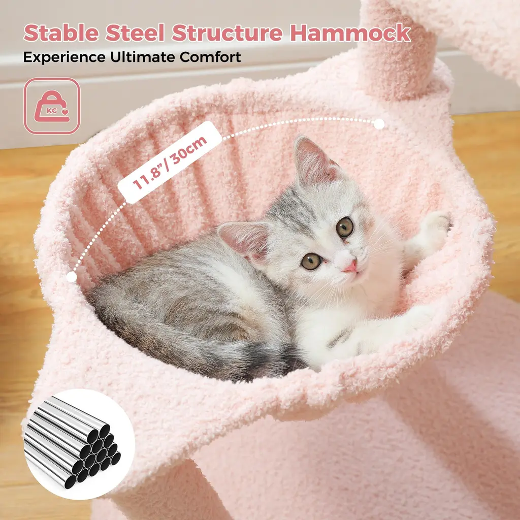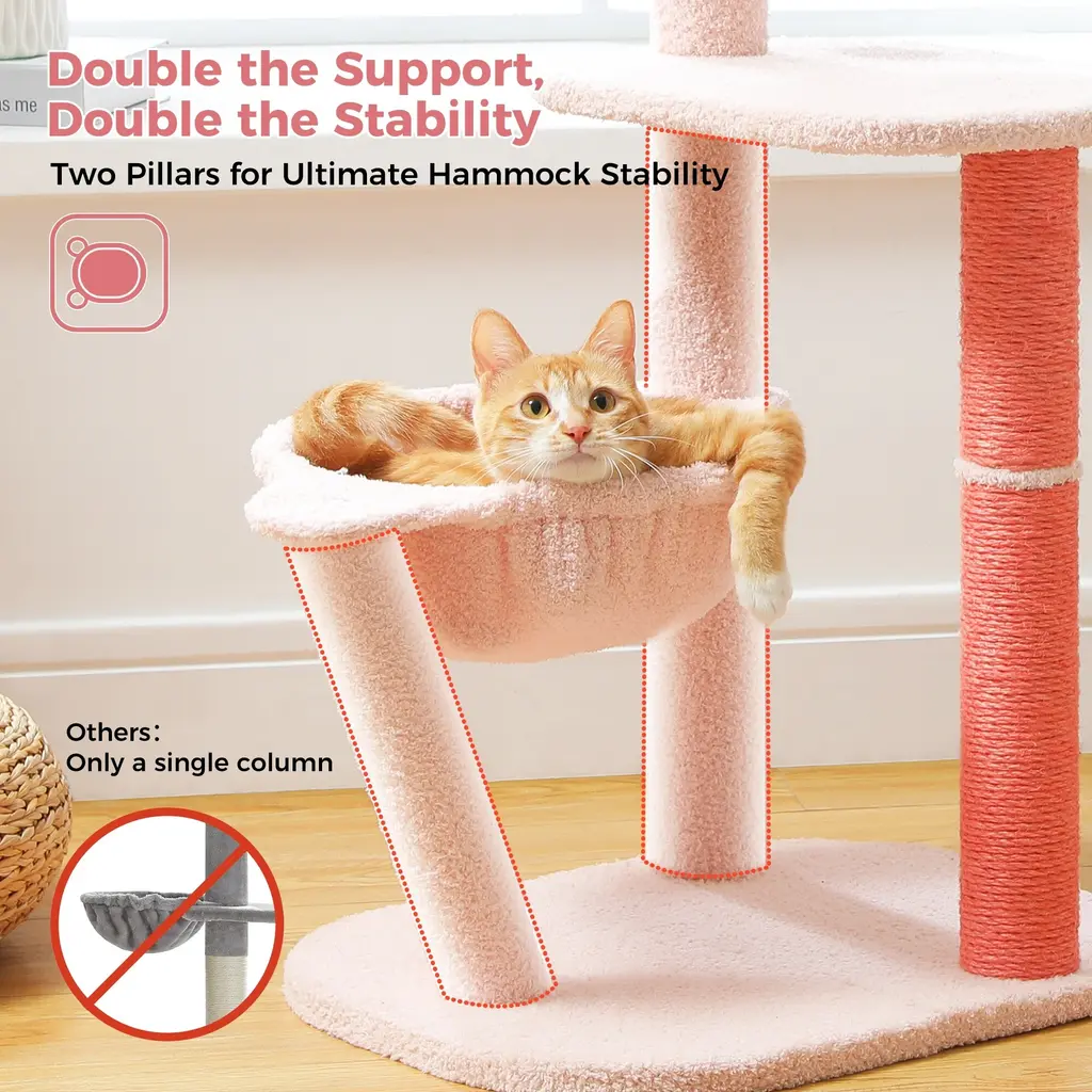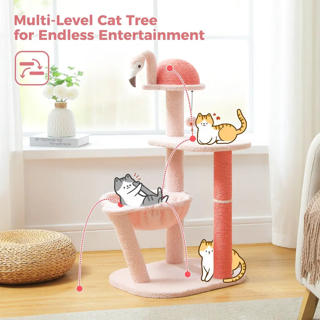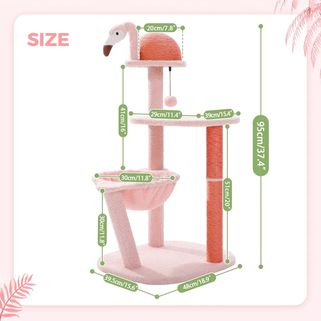 Flamingo Fancy Design - Inspired by the graceful pose of a lounging flamingo, this design blends artistic flair with practicality. It's like giving your cat a trendy hangout spot that's both stylish and functional—a perfect fusion of fashion and functionality!Flamingo Funhouse Climbing Tree - With two vibrant pink full-sisal scratching posts and a sizable 7.87-inch full-sisal ball, this cat tree shaped like a flamingo is the ultimate scratching paradise for your feline friend. The semi-circular body crafted from 100% natural sisal provides the perfect scratching posture and an unbeatable scratching experience. Say goodbye to scratched furniture and hello to happy, contented kitties!Flamingo Fantasy Playground - With its four-tiered design, this cat tree taps into your cat's instinctual love for climbing, while adding a touch of artistic flair with a plush flamingo toy. Complete with a cozy hammock and a spacious platform, it's a kitty paradise that's perfect for small to medium-sized cats.Flamingo-Inspired Packaging - Delightfully presented in a vibrant flamingo-themed box, this cat tree makes for a charming and eye-catching gift option. Perfect for any cat lover, it's a present that's as fun to give as it is to receive, adding a touch of whimsy to any feline's world.Rock-Solid Stability: Thanks to its enlarged base and three sturdy pillars, this climbing frame boasts unmatched stability, guaranteeing a safe and secure environment for your cat's adventures. Whether they're resting or climbing, even small to medium-sized cats can enjoy peace of mind knowing they're on a rock-solid structure built just for them.