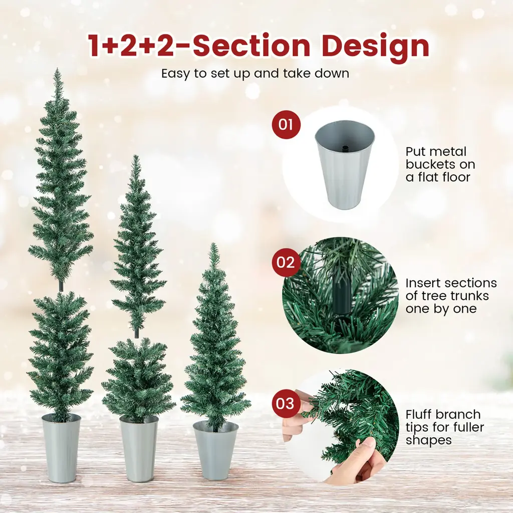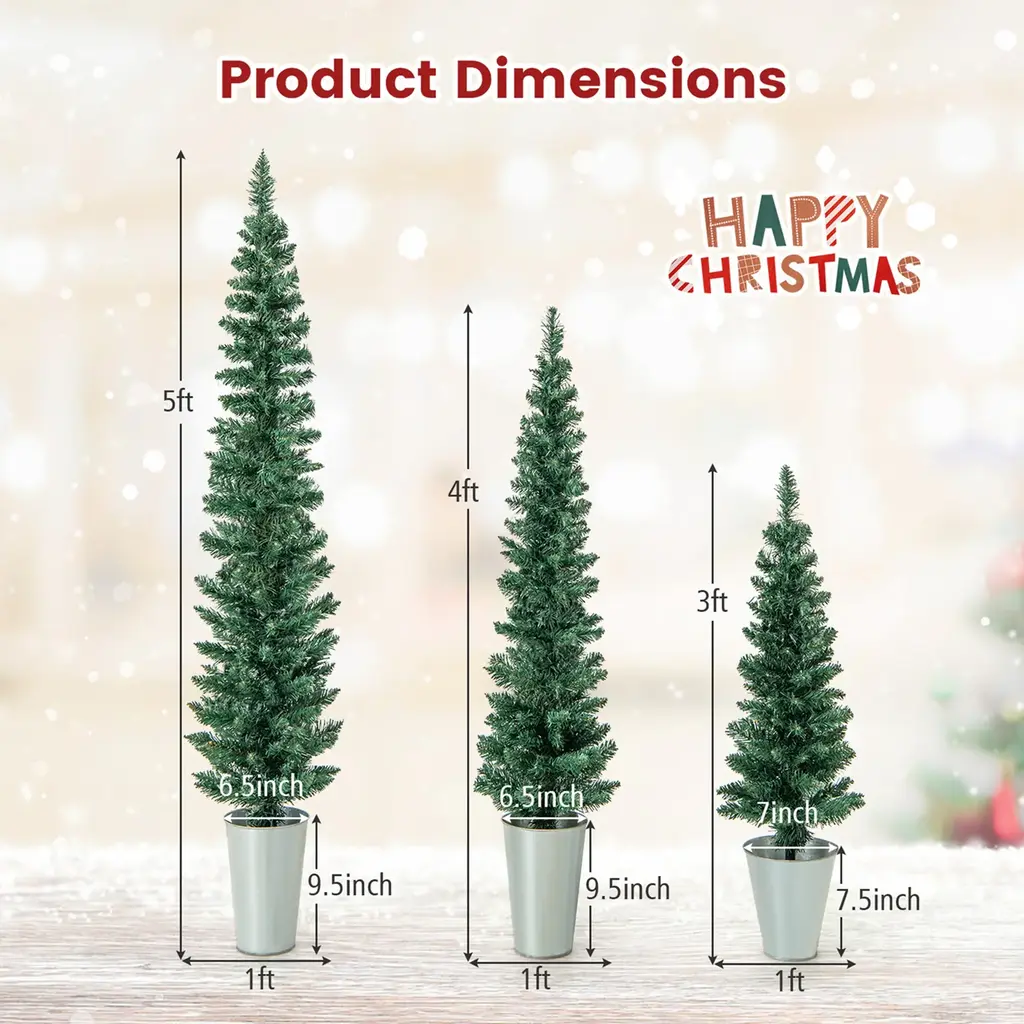 Stunning Xmas Decoration for Spreading Holiday Cheer & Spirit to Every Corner! The potted artificial Christmas tree set includes 3 trees of different sizes, allowing you the flexibility to arrange them together or separately, depending on your space and preference. Besides, featuring120+140+160verdant branch tips and silver metal buckets, these trees could add a touch of elegance to your festive display. Other than that, crafted with fire-resistant PVC material, these trees prioritize your safety. And the sturdy metal base, filled with cement, ensures stability and durability. And with their slender and slim shapes, these unique pencil Christmas trees are ideal for small spaces or those looking for a contemporary and minimalist holiday display! Features:Specification