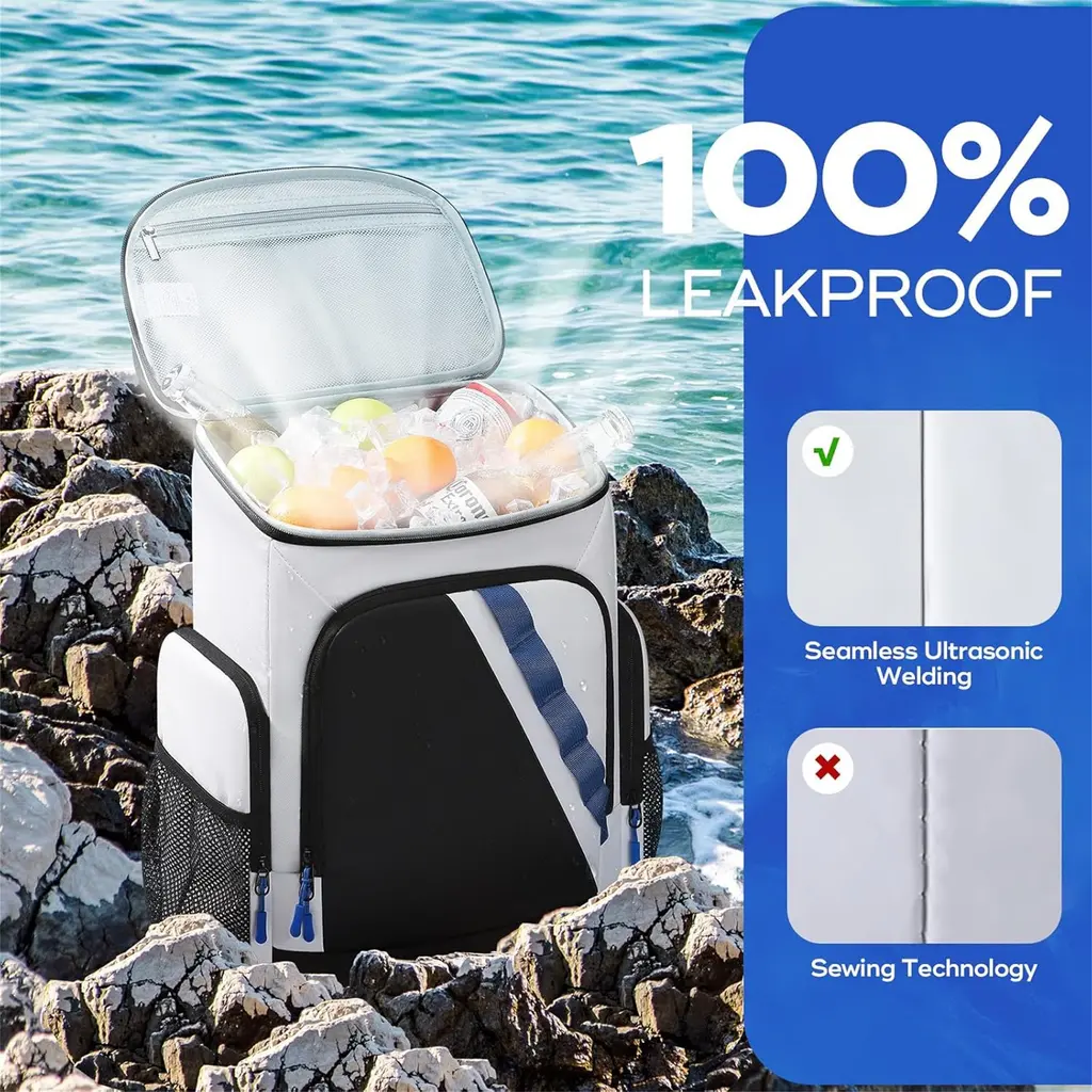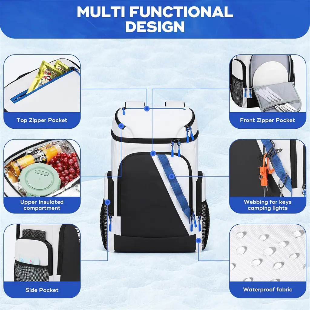 Leakproof and Insulated: Our Maelstrom backpack cooler utilizes advanced seamless hot pressing technology to ensure leak-proof performance. The insulated material effectively preserves the freshness of your food and drinks, keeping them cold for up to 16 hours. Spacious and Organized: The Maelstrom insulated cooler backpack offers ample storage with multiple compartments, measuring 13.65” x 7.8” x 19.11” (LxWxH) and accommodating 36 cans (34 L). Featuring double insulated compartments, a top zipper pocket, front cutlery storage bag, side pockets, and a hidden back zipper pocket, it ensures convenient and organized storage for all your essentials. Innovative Functional Design: Our soft cooler bag is equipped with a detachable bottle opener, providing convenient access to your drinks at any time and place. Additionally, the front side of the lunch cooler backpack features five webbing holes for hanging keys, camping lights, and other tools, while the shoulder strap includes a stretch cord for securing your sunglasses. Comfortable and Durable: Our lunch backpack is designed for comfort and endurance, featuring a padded back, and adjustable breathable shoulder straps. The adjustable chest buckle of travel cooler ensures stability and weight distribution, while also serving as a survival whistle for emergencies.
