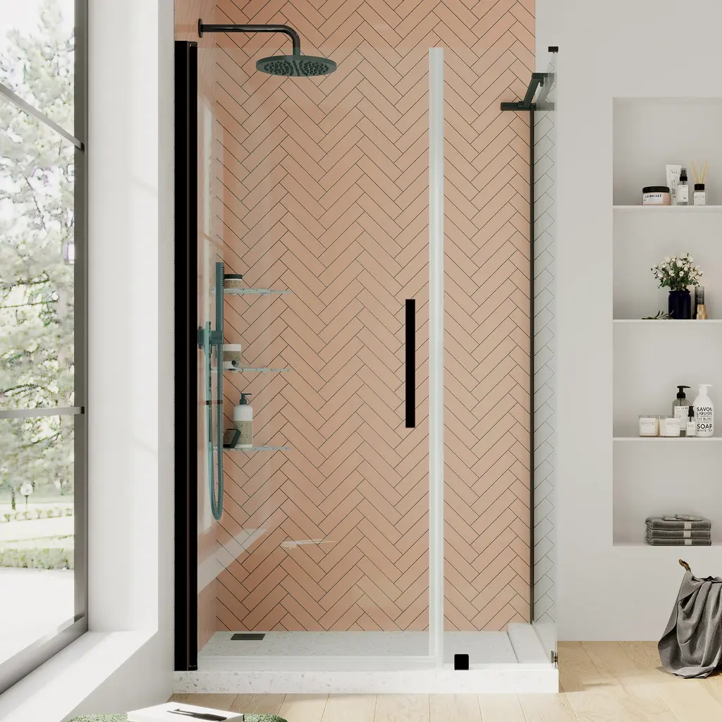 Our shower door is a top-notch addition to any bathroom, combining style, durability, and functionality. The alu wall channel, along with the high-quality #304 stainless steel handle, has undergone a rigorous 36,000 times open and close test, promising long-lasting use that can withstand daily wear and tear.Crafted with SGCC 1/4" tempered clear glass, installation is a breeze, saving you time and effort. Its smooth and comfortable pivot system enables effortless operation, adding a touch of luxury to your shower routine. You'll never have to worry about water seeping out, thanks to the excellent anti-leakage function that keeps your bathroom floor dry at all times.To further enhance stability, a stainless steel support bar is included. This not only fortifies the structure but also gives you peace of mind while using the shower door. With all these features, our shower door is the perfect choice for a seamless and enjoyable showering experience.