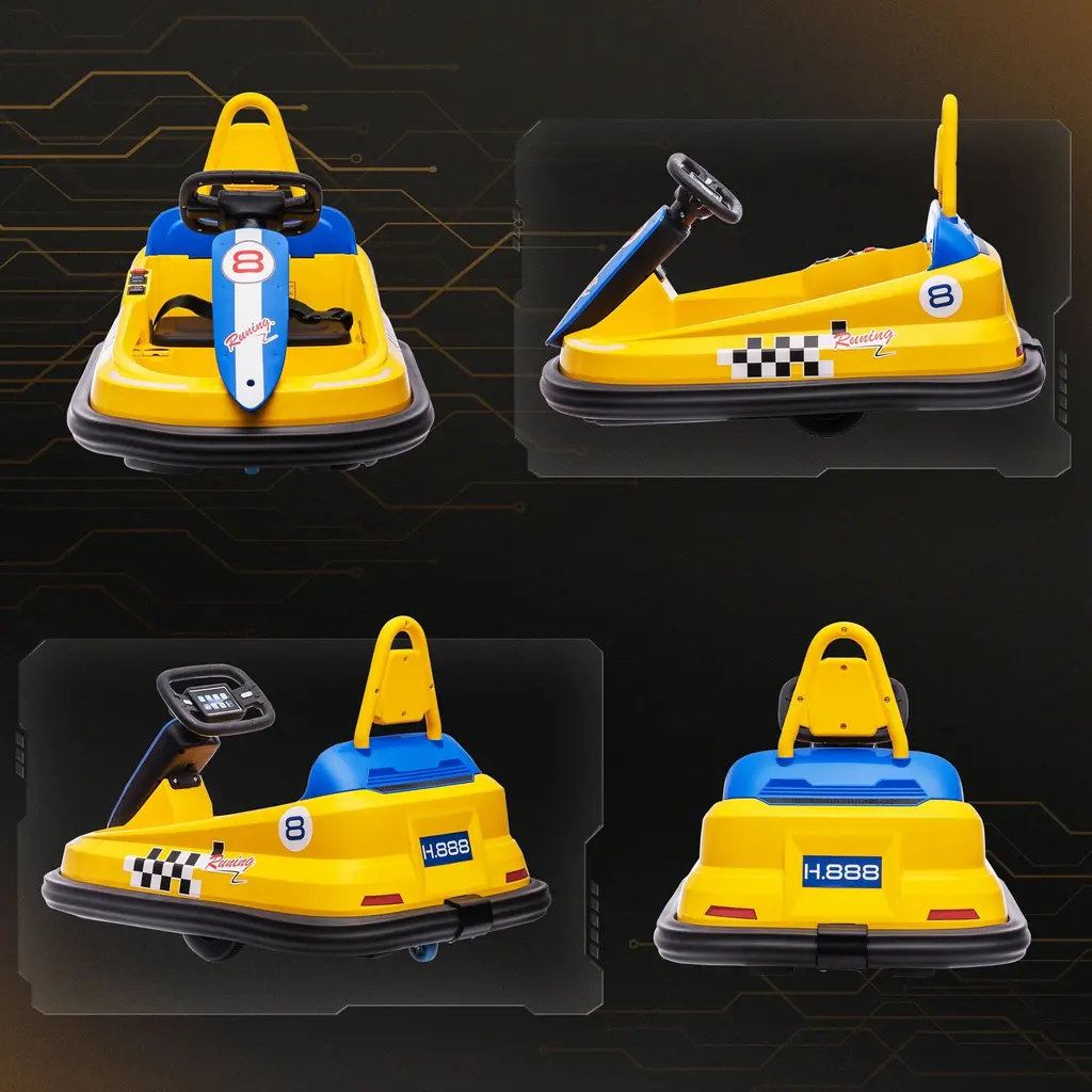 Overview: The 6V Electric Toddler Bumper Car is designed to bring the thrill of a real amusement park bumper car to your child's playtime. This ride-on car features a 360° spin capability, allowing your toddler to enjoy hours of exhilarating fun. The built-in music, horn, and LED lights make it even more exciting, offering an immersive experience that will keep them entertained. Suitable for toddlers aged 18 to 48 months, the speed range of 0.9-1.9 mph ensures a safe yet fun ride. The bumper car is built with safety in mind. The EVA bumper edges offer added protection, preventing injury while providing a fun, spin-filled ride. The seatbelt keeps your toddler secure, while the back handle allows parents to intervene if needed. Whether indoors or outdoors, this car can easily navigate a variety of flat surfaces like carpets, tiles, and concrete. Plus, the water-resistant wheels ensure durability and make this bumper car suitable for both indoor and outdoor fun. Key Features: