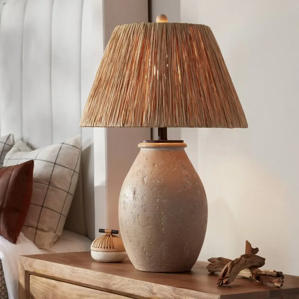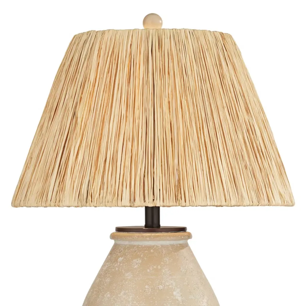 Add some coastal style to your decor with this handsome lamp design from the 360 Lighting brand. The base comes in a terracota sand finish that adds a rustic, organic look to seating areas. Up top is a raffia fabric shade styled to look like it's been crafted from palm fronds.