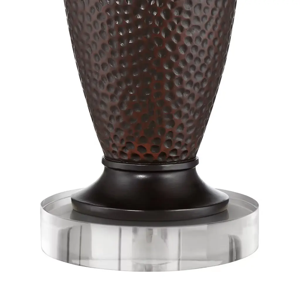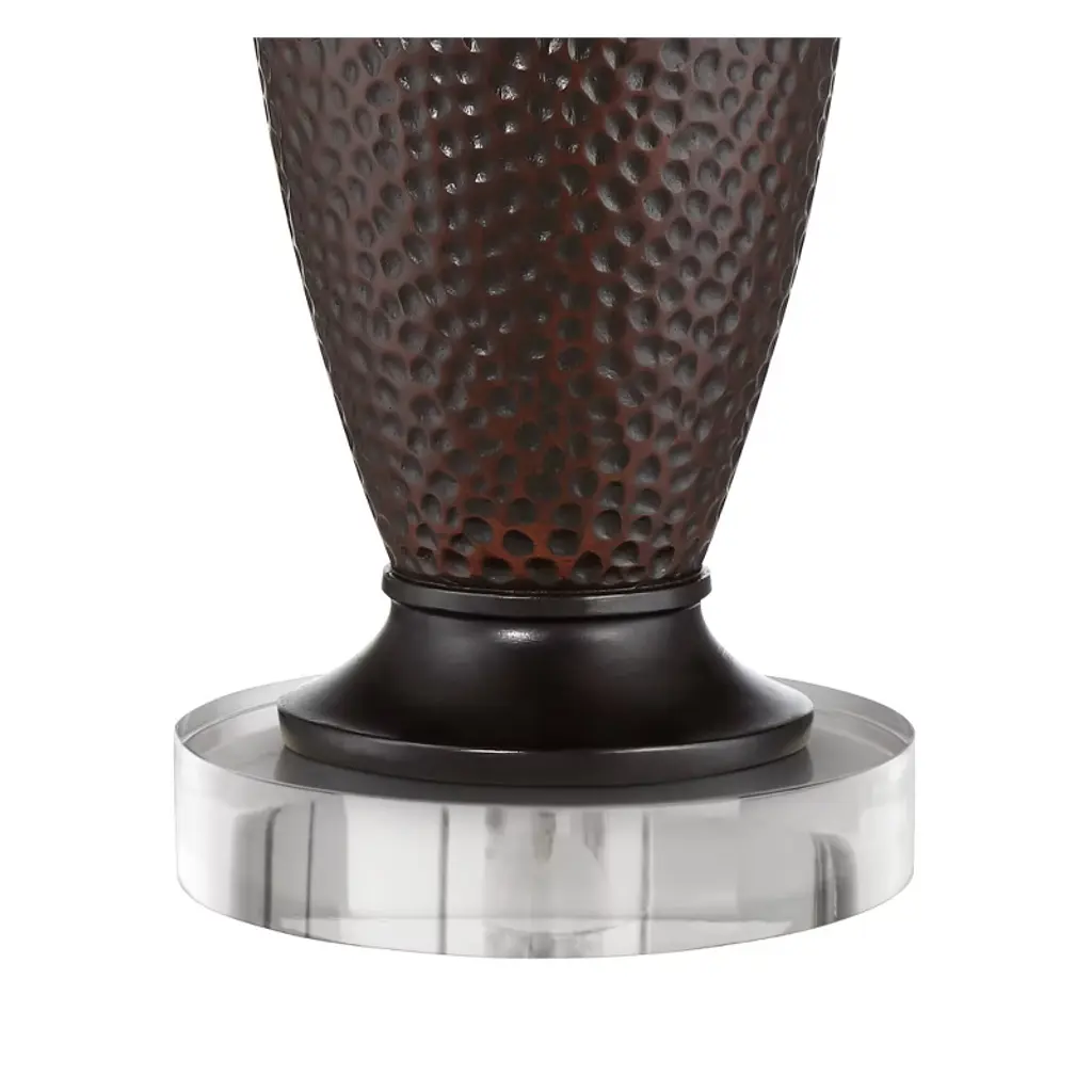 In a convenient set of two, each of these contemporary industrial table lamps comes in a hammered resin body with a rich textured feel. An oiled bronze finish adds warm, beautiful effect. These lamps are then topped by oatmeal linen drum shades, which only reinforce the look and feel of the overall design. Brimming with vintage character, they're sure to enhance any room. Each lamp has a 8" round riser.