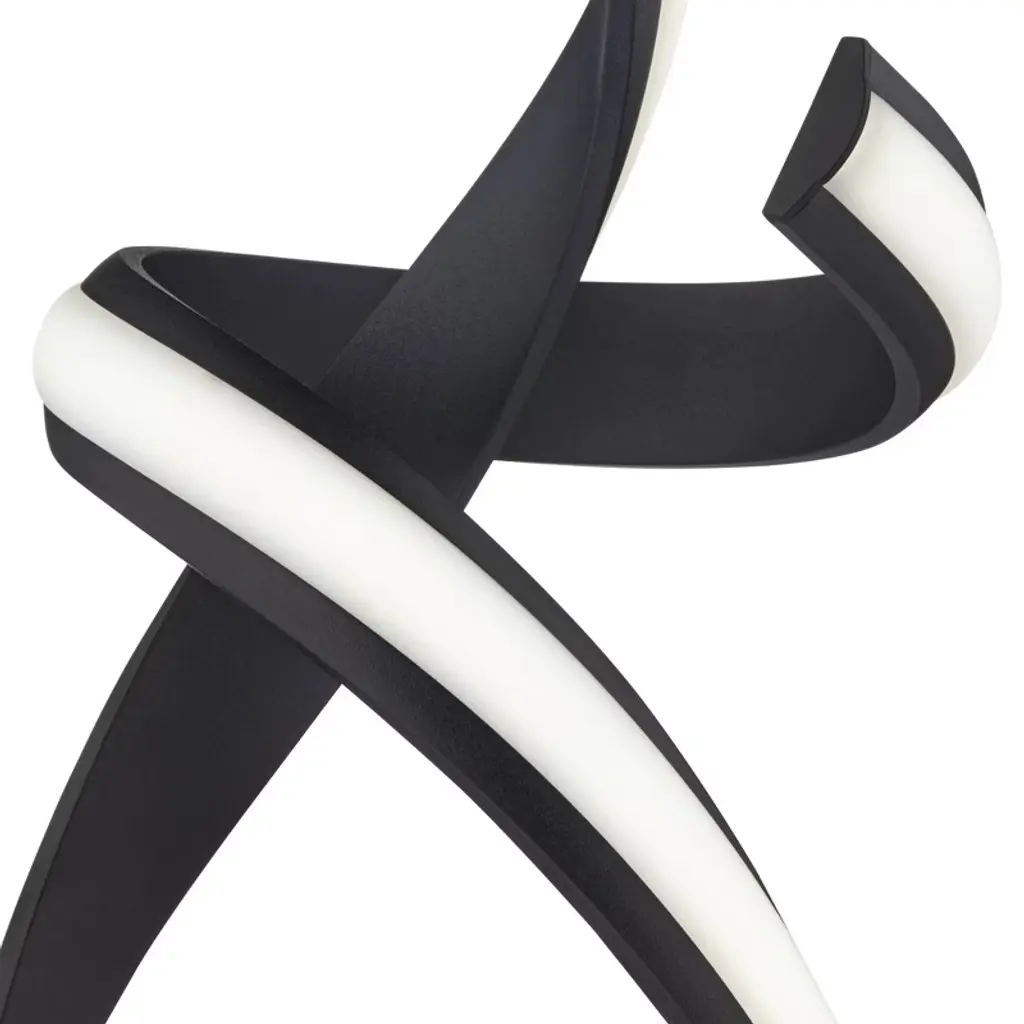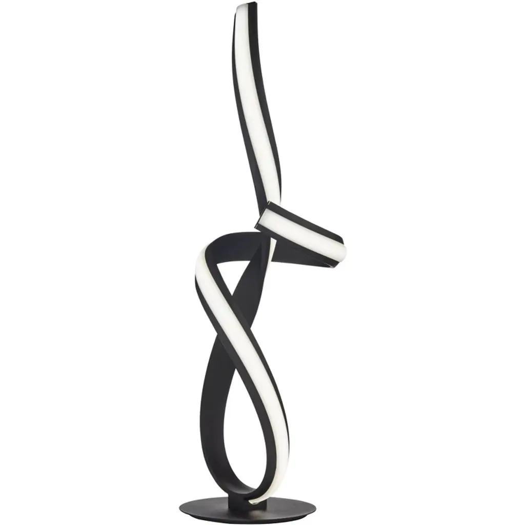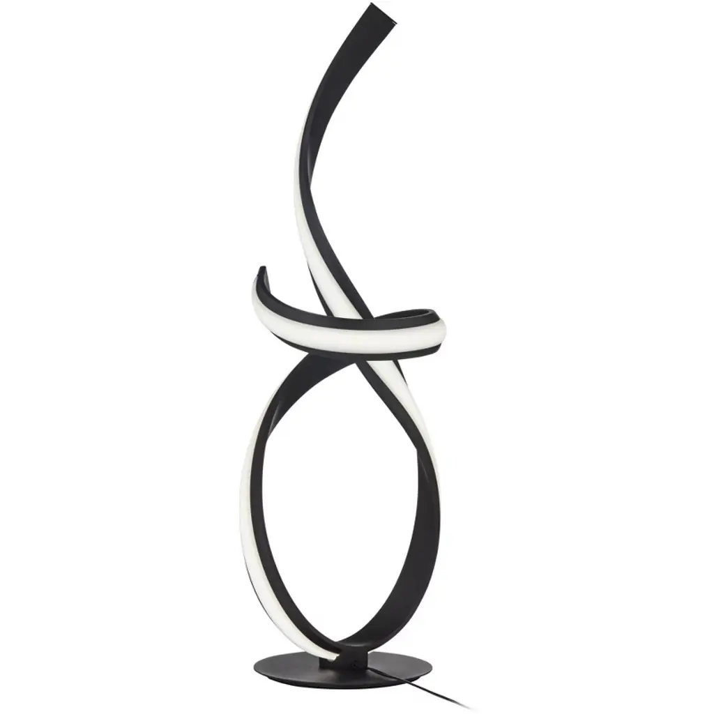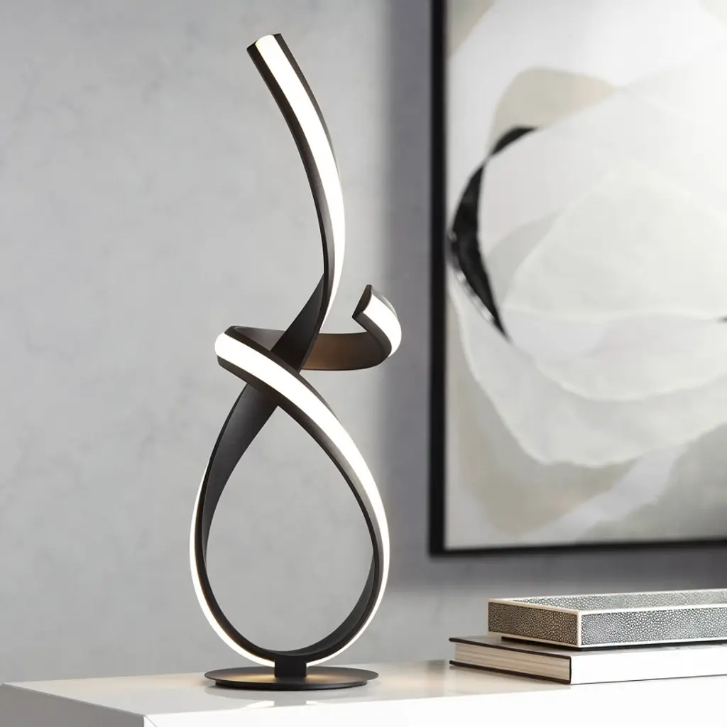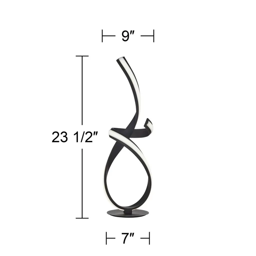 From the Possini Euro Lighting brand, the Avante accent table lamp is a modern statement piece for sitting areas, home offices, and more. The sculpture lamp base has a flowing curl ribbon profile with a strip of LEDs embedded on one edge. The black finish base and curling profile provides an eye-catching style accent for your home.