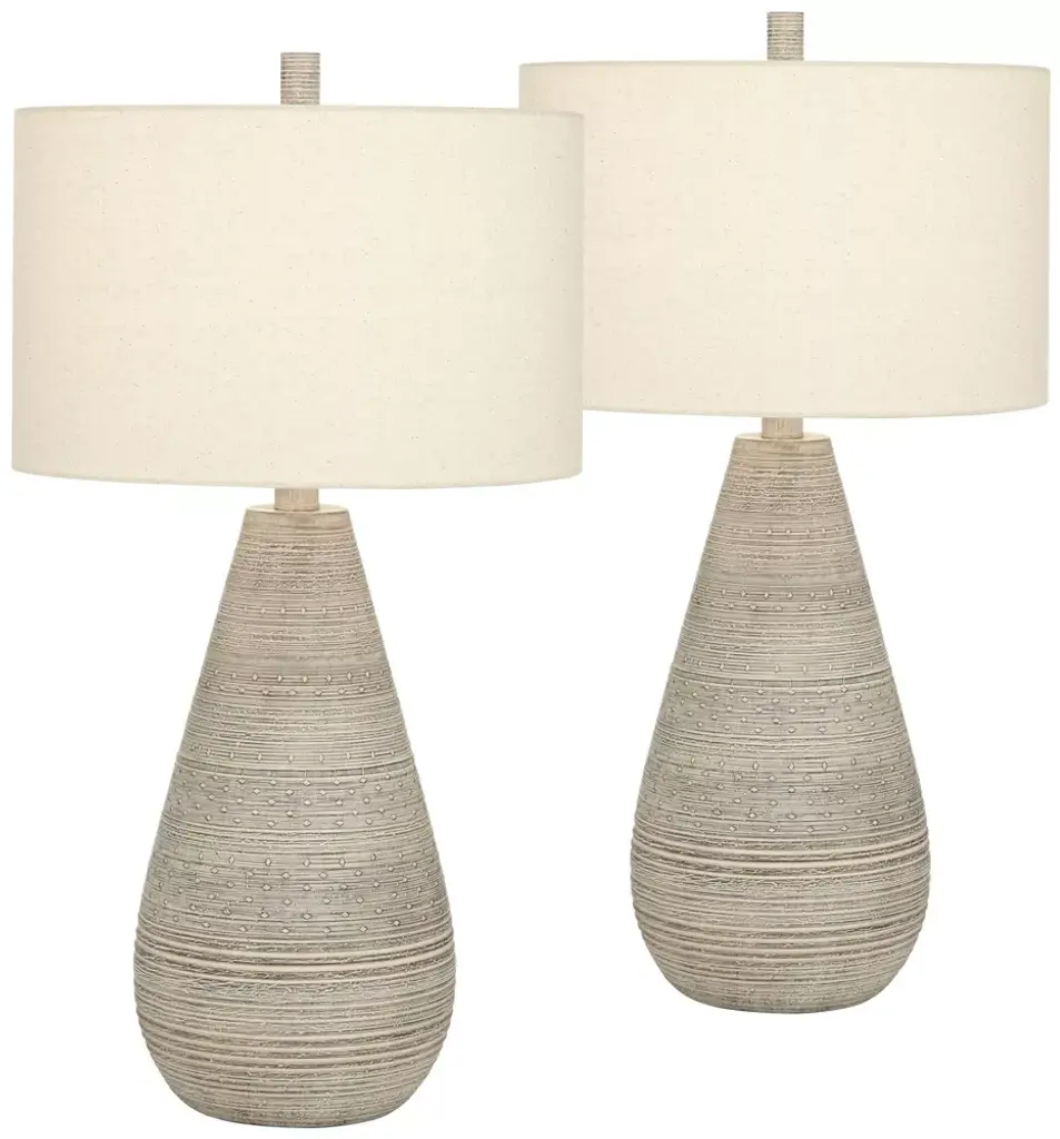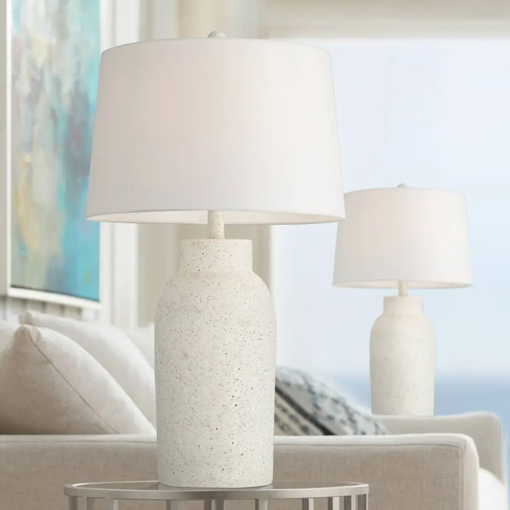 Add a refined touch of texture and symmetry to your décor with the 360 Lighting Jaime 3-way table lamp set. Each lamp features a sculptural base inspired by carved sandstone, finished in a soft faux white sandstone look that blends beautifully with coastal, minimalist, or transitional interiors. Topped with classic white drum shades, this set delivers balanced illumination and timeless style—ideal for nightstands, end tables, or living room accents. Whether you're styling a serene bedroom retreat or a bright and breezy living space, these lamps bring natural texture and clean design together in perfect harmony.