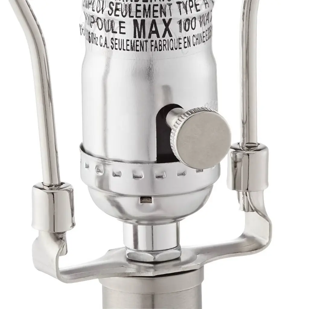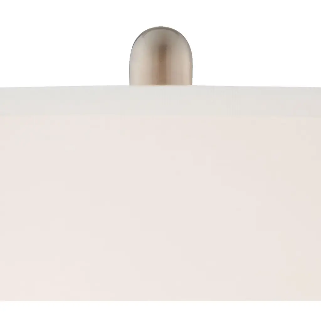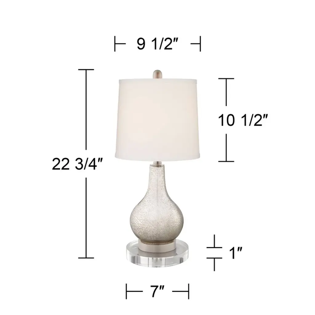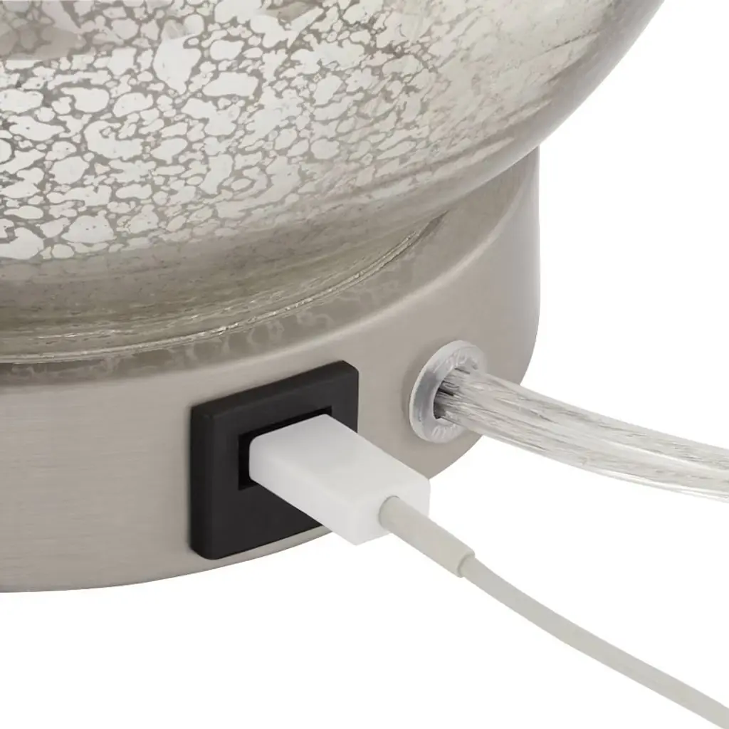 With a beautiful design and modern features, these accent table lamps are a wonderful addition to a living room or bedroom. In a convenient set of two, they come in curving mercury glass bodies that offer a shimmering effect. Brushed nickel finish accents and off-white drum shades add a classic effect to this contemporary design. Each lamp has a USB port built into the base, designed to charge smartphones and other handheld devices. Each lamp has a 7" round riser.