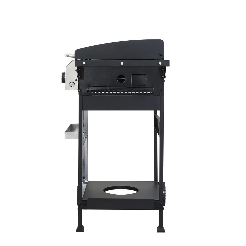 Firebox: EnamelWheel: 2 pcs 6 inch wheelsWire Enamel Cooking Grids: 1 pc 6.9 x 17.3 inch, 1 pc 8.9 x 17.3 inchWarming Rack: EnamelIgnition System: Push and turn, integrated automatic easy ignitionFlame Tamper: Enamel flame tamper, 3 pcsPower: 12300 BTU * 3 = 36900 BTUHanging Baskets: 14.9 x 3.15 x 1.57 inchSide Table: Steel, black powder coating, foldable, 11 x 17.7 inchHooks: 6 pcsSS Plancha: Stainless steel, 17.7 x 17.5 inchOil Pan: Collects grease from the grill for easy cleaning.