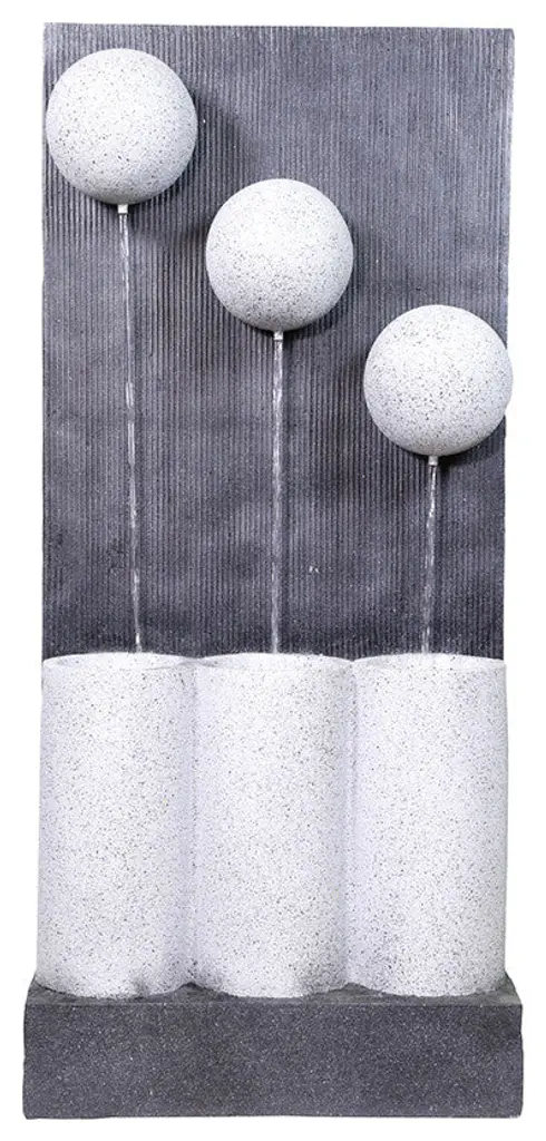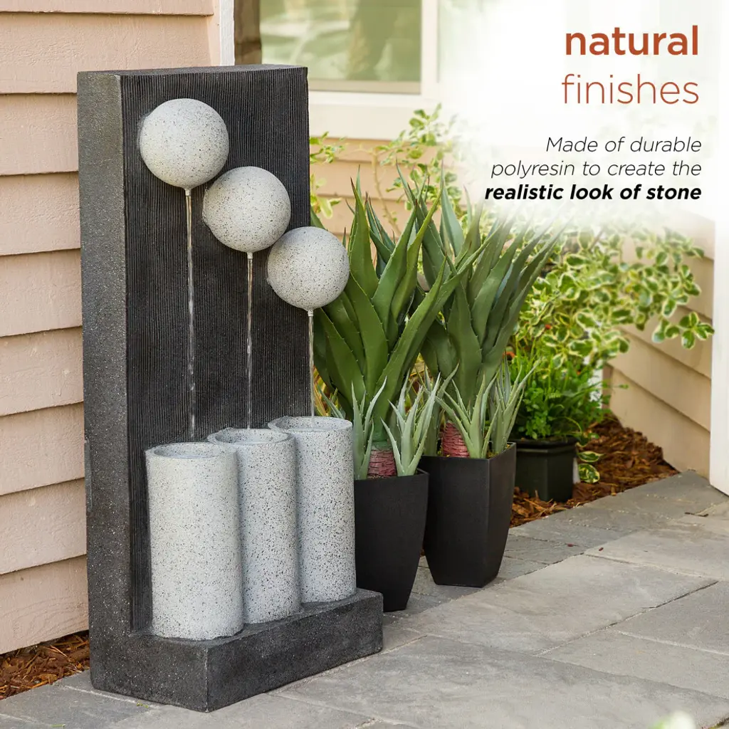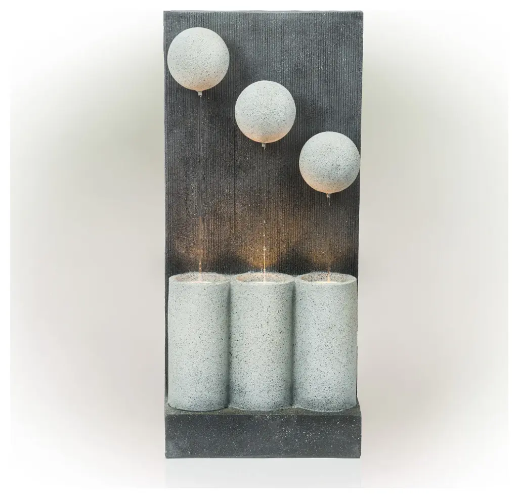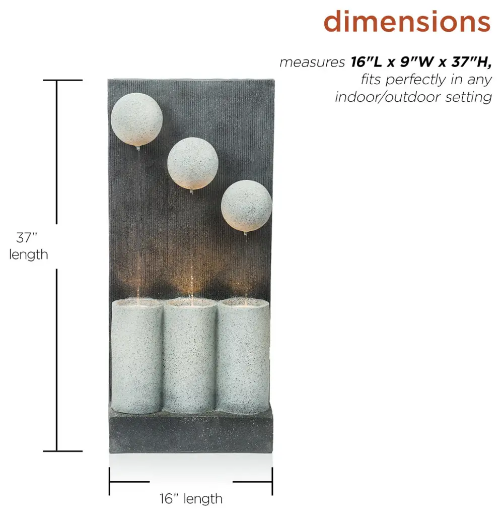 Enhance your indoor or outdoor living space with this 37" tall 3-Tier Modern Infinity Calming Floor Fountain with LED Lights from Alpine Corporation. This 3-tier modern waterfall fountain floor statue provides a tranquil and soothing addition to your porch, backyard, or lawn. Constructed from durable polyresin, this contemporary Zen water fountain is weatherproof, rust-resistant, and resilient. With a 5L water capacity, the water circulates freely. Relax to the sounds of the calming natural water stream as it flows from each orb in to the cylinder below it. The cylindrical columns have a rough texture that imitates natural stone. The fountain becomes illuminated with the 3 integrated warm white LED lights located on each column of the fountain, providing you an ambient light source to your home''s interior or exterior decor. Not only will the fountain offer you serenity, it will also attract birds to your outdoor area, which in turn promotes healthy gardens. This updated take on the classic Zen waterfall fountain provides an elegant addition to your courtyard, patio, or yard, and gives your garden visual interest with its sophisticated design and unique style. This standing fountain measures 16"L x 9"W x 37"H to fit almost any outdoor area and includes a one-year manufacturer''s warranty from date of purchase. ZEN FOUNTAIN: Contemporary cascading standing water fountain with 3 tiers of streaming water and LED lights that will provide a tranquil and soothing addition to your indoor or outdoor living space DURABLE GARDEN DECOR: Constructed from durable polystone, the fountain has a 12L capacity and is weatherproof, rust-resistant, and can be used in your home''s interior decor or outside NATURAL TRANQUILITY: Relax to the sounds of the calming natural water stream as it flows from each orb in to the cylinder below it, while adding visual interest to your outdoor garden or courtyard INTEGRATED LED LIGHTING: Create a relaxing and romantic ambiance to your patio, yard, or home with the 3 long-lasting LED lights featured on each cylinder of the modern Zen water fountain STANDING FOUNTAIN AND ONE-YEAR WARRANTY: Measures 16"L x 9"W x 37"H to fit almost any outdoor area, and includes a one-year manufacturer''s warranty from date of purchase