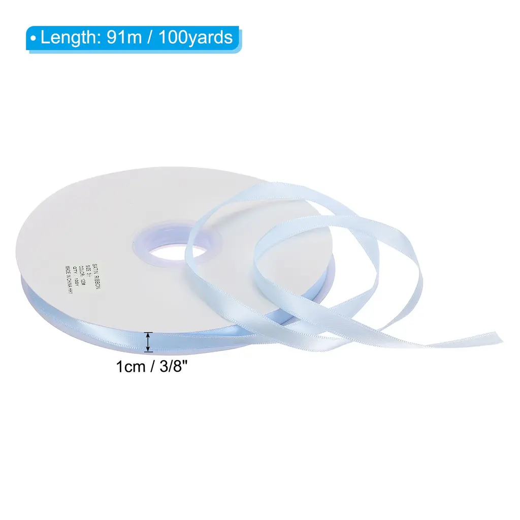Ribbons are suitable for various occasions, including craft projects, wedding and birthday party decorations, gift wrapping, cake baking, invitations and candy box bows, gift box gift packaging, clothing accessories decoration, graduations, Easter, Halloween, home decoration, etc. It is also an DIY exquisite accessory, such as DIY hair accessories.Specification Color: Sky BlueMaterial: PolyesterSize: 91m x 1cm / 100yards x 3/8inch(L*W)Package Contents: 1Pcs x Single Faced Polyester Satin RibbonAdvantage1. Made of 100% polyester, has a delicate feel, comfortable texture and good gloss, without wrinkles. Venues, gifts, and clothing decorated with ribbons will become high-end and fashionable2. Weather-resistant soft tenacity satin ribbon, not easy to break.3. The Satin Ribbon is protected by reel, which prevents the ribbons from being dirty, and well-packaged.Instruction Before use, determine the required amount, then cut it to avoid waste, and then decorate or fix it according to your needs.NOTE:please allow slight deviations in color kindly due to different camera lenses, photography environments and display screens.