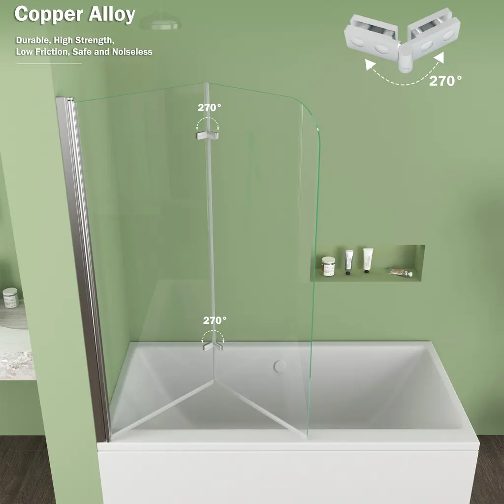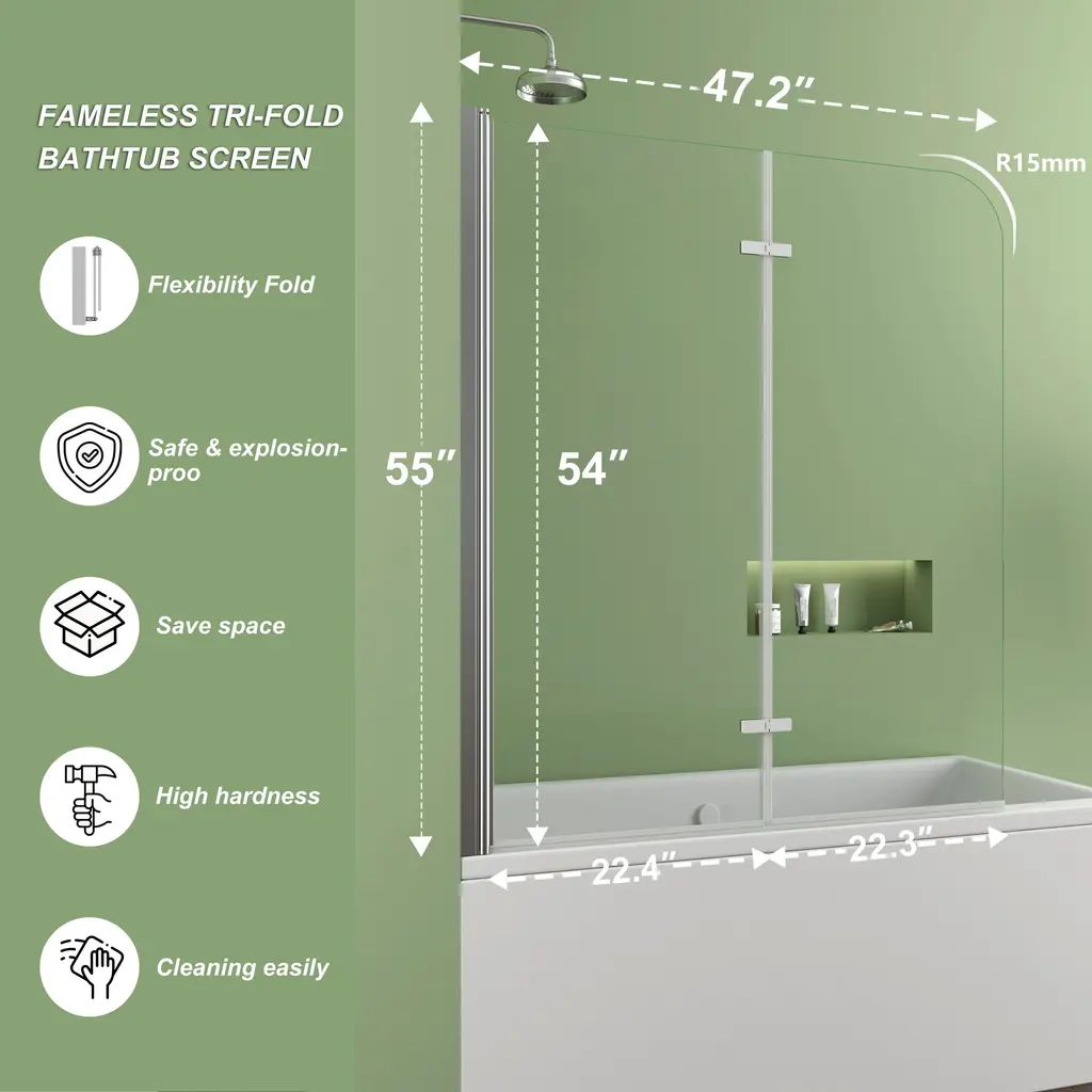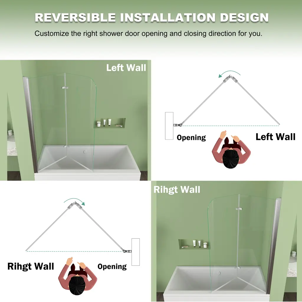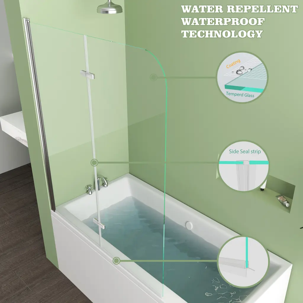 1.Dimensions-this bathtub shower door size is 39 in. W x 55 in. H, with thick 1/4 in. tempered glass panels this tub shower door is the perfect size to match with standard bathtub.2.Strong and safety-this tub door is made of 6mm tempered safety glass which prevent shatters from splashing in case of accidental breakage with safe round conner design offer you safe space.3.Keep clean and clear-this tub door glass is treated with nano coating on both sides this coating provides a durable and stain-resistant surface, which prevents limescale buildup4.Flexible design-this tub door is reversible, fit your specific layout, you can install it on left side or right side base on the design of your bathtub professional installation recommended don't install alone