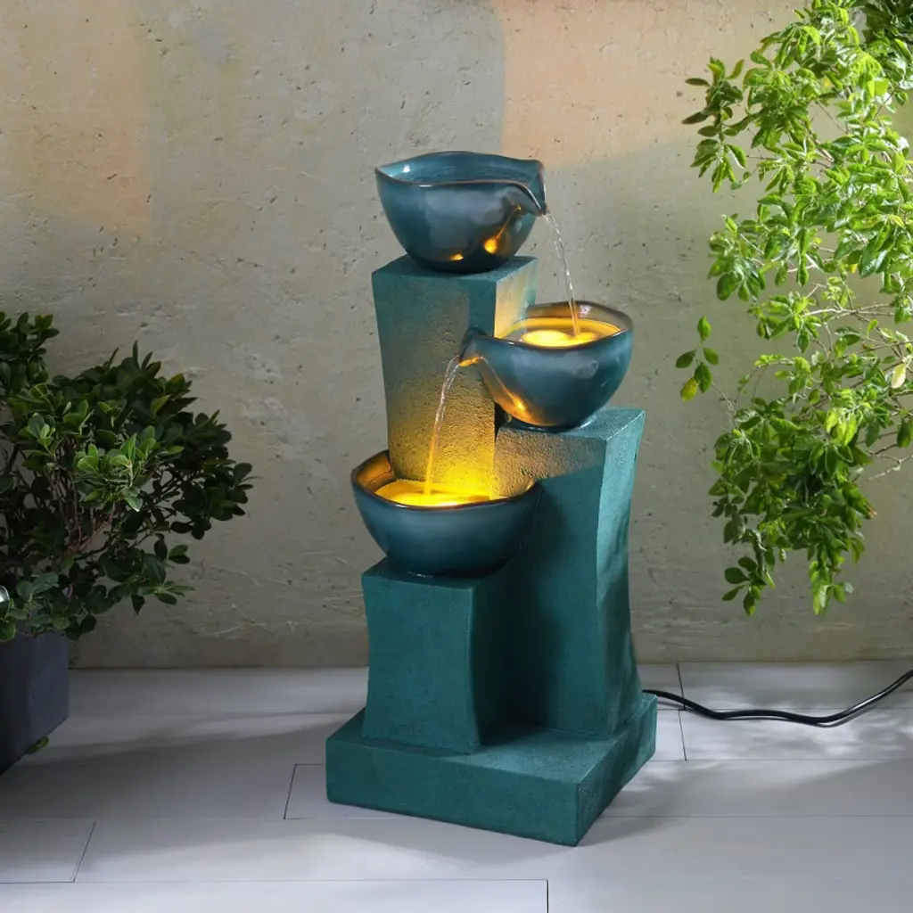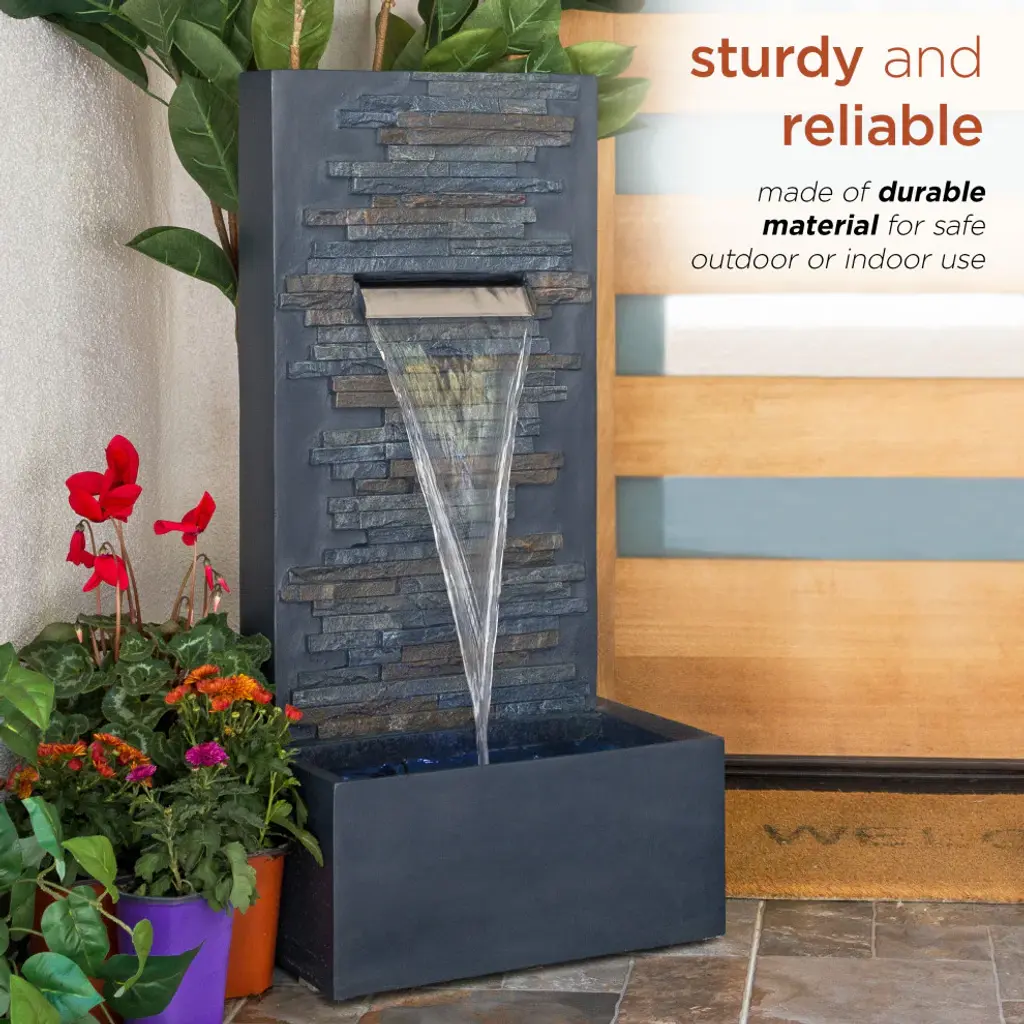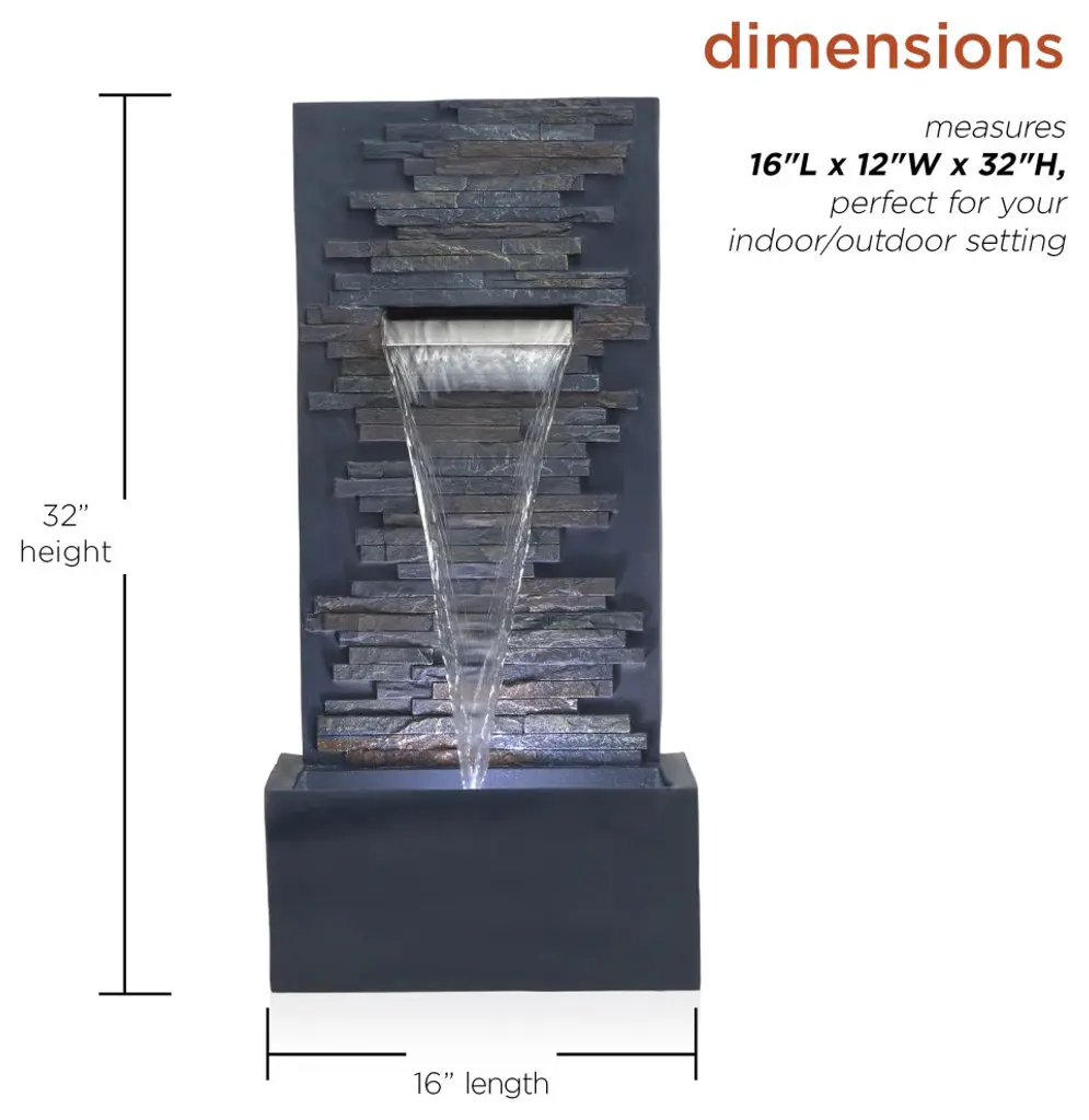 Elevate your home''s indoor or outdoor style with this elegant 32" tall Cascading Stone Wall Fountain Decoration with LED Lights. This cascading wall statue provides a tranquil and soothing addition to your outdoor living areas. Constructed from durable polystone and fiberglass with an elevated, modern look, the fountain is weatherproof, rust-resistant, and resilient. With its stunning wall design, it will bring a touch of artistic flair to your outdoor space. The fountain becomes illuminated with the included LED lights, and is sure to light up your home or garden. Relax to the sounds of the soft, natural water flow as it trickles down through the fountain. Not only will the fountain provide you with serenity, it will also add a breathtaking display of beauty to your outdoor area. This majestic fountain provides an elegant addition to your courtyard, and gives your garden visual interest with its timeless design and classic style. For quick installation and convenient operating, the water fountain includes all necessary parts and a pump. This decorative tabletop water fountain measures 16"L x 12"W x 32"H to fit almost any outdoor space and includes a one-year manufacturer''s warranty from date of purchase. OUTDOOR GARDEN DECOR: 3-tier natural look bark cascading floor fountain with 2 cool white long-lasting LED lights provides a tranquil and soothing addition to your outdoor living space, porch, or lawn DURABLE LAWN STATUE: Constructed from durable polystone and fiberglass with a realistic natural aged wood look and realistic textures, the fountain is weatherproof, rust-resistant, and resilient NATURAL TRANQUILITY: Relax to the sounds of the calming natural water flow as it trickles down from the top tier of the fountain, while adding visual interest to your courtyard, garden, or lawn ALL PARTS INCLUDED: For quick install and convenient operating, the waterfall fountain includes all necessary parts, as well as a pump, to begin creating an outdoor oasis STANDING FOUNTAIN AND ONE-YEAR WARRANTY: Measures 18"L x 14"W x 39"H to fit almost any outdoor area and includes a one-year manufacturer''s warranty from date of purchase