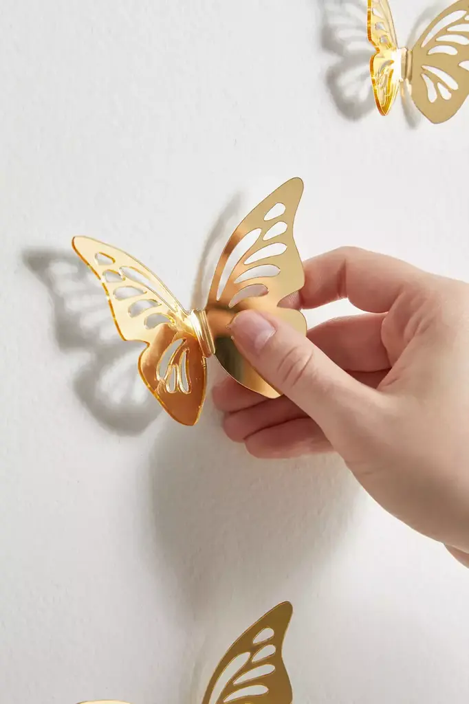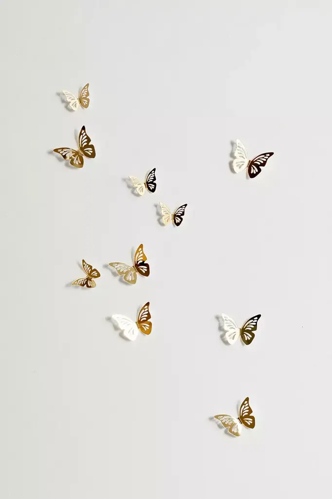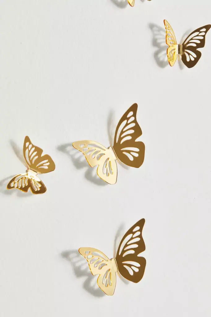 Create a whimsical space with these gold fluttering butterfly stickers that double as a chic little mirror. Complete with 10 stickers, this set of decals is easy to place, remove and reposition throughout your space. **Features** \- 3D Gold Butterflies Peel And Stick Mirror Set \- Fluttering butterfly-shaped wall decor \- 10 Vinyl butterflies double as mirrors \- Easily remove & reposition throughout your space **Content + Care** \- Set of 10 \- Vinyl \- Wipe clean \- Imported **Size** \- Dimensions: 2.75"l x 2"h - 3.75"l x 2.74"h