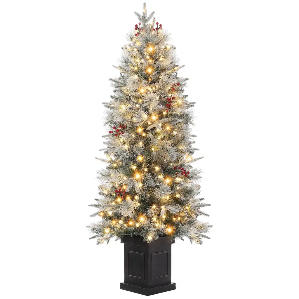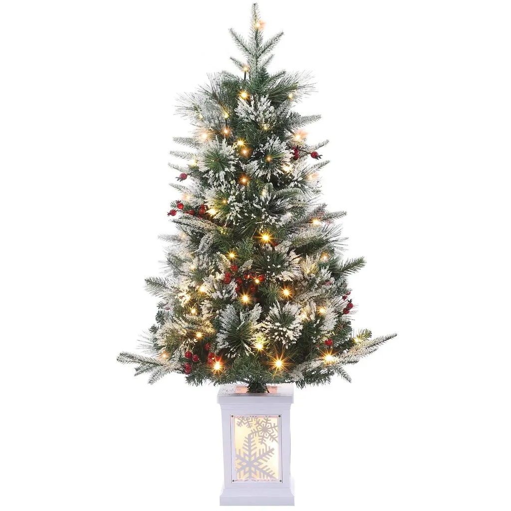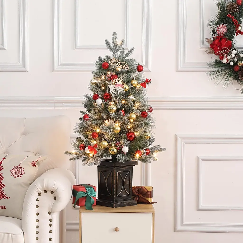 EASY ASSEMBLY: This 3ft Christmas tree is a breeze to assemble- simply unfold the branches and add batteries (not included),and it's ready to decorate your house in no time! Just enjoy the festive glow of 78 warm LED lights in Christmas holiday. IDEAL FOR CHRISTMAS DECORATION: The 3ft small Christmas tree comes in a rich color, with natural lifelike green leaves, Crafted with 121 branch tips ,78 lights, red berries and snow flocked leaves, this Christmas tree lends a lifelike and snowy appearance to your festive display. Create a winter wonderland in any room of your home! PRE-LIT ARTIFICIAL TREE: With 78 pre-lit LED lights, this Christmas tree ensures a bright and beautiful display. Even if one light goes out, the rest will continue to shine, ensuring your Christmas holiday tree remains vibrant all season long. FESTIVE HOLIDAY APPEAL: The Xmas tree features a classic retro-style potted base that adds a touch of elegance to your holiday party decor. It's not only stylish but also solid and stable, ensuring your tree stays securely in place. CONVENIENT TIMER FUNCTION: The battery box includes a handy timing function, allowing you to set the tree to automatically stay lit for 6 hours, then turn off for 18 hours. It's a hassle-free way to keep your tree illuminated without constantly adjusting the lights. XMAS TREE DIMENSION: Measuring 3 ft tall and 22 in wide at the bottom, our Christmas festival tree is designed to fit seamlessly into most homes, apartments, entryways, corridors, indoor or outdoor and other scenes. Whether you have limited space or want to add a touch of festive spirit to various areas, this 3ft Christmas tree with lights is the ideal choice.