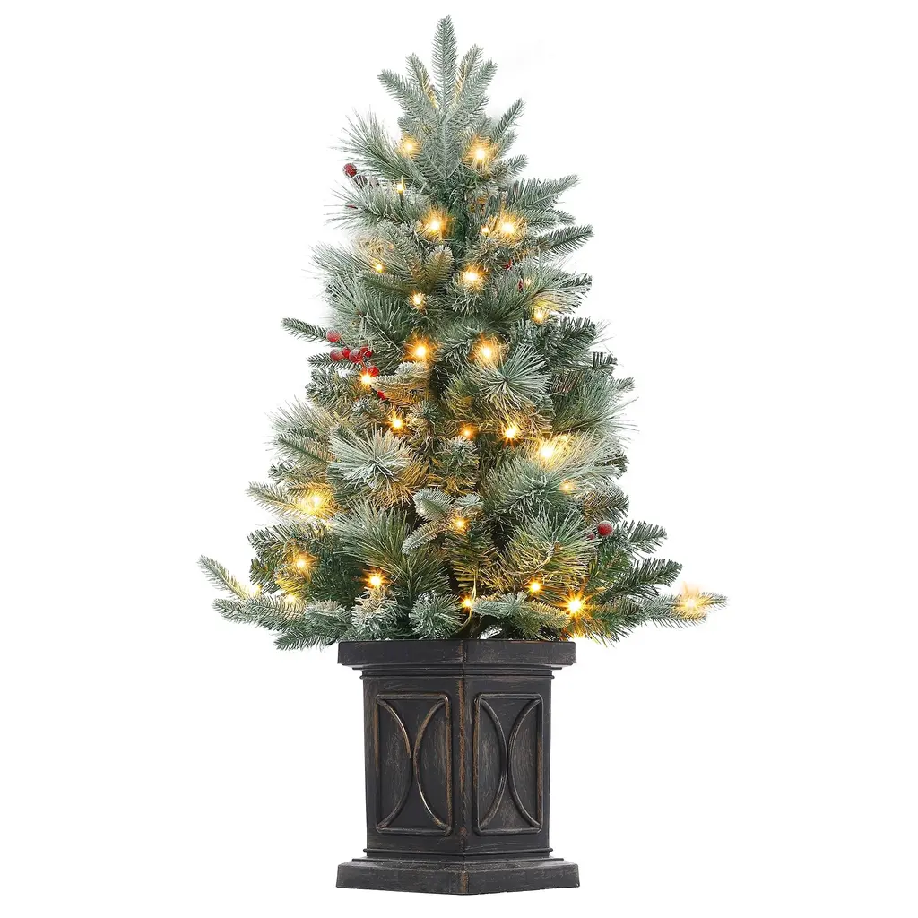 EASY ASSEMBLY: This 3ft Christmas tree is a breeze to assemble- simply unfold the branches and add batteries (not included), and it's ready to decorate your house in no time! Just enjoy the festive glow of 70 warm LED lights during the Christmas holiday.IDEAL FOR CHRISTMAS DECORATION: The 3ft small Christmas tree comes in a rich color, with natural lifelike green leaves, Crafted with 121 branch tips,70 lights, red berries, and snow-flocked leaves, this Christmas tree lends a lifelike and snowy appearance to your festive display. Create a winter wonderland in any room of your home!PRE-LIT ARTIFICIAL TREE: With 70 pre-lit LED lights, this Christmas tree ensures a bright and beautiful display. Even if one light goes out, the rest will continue to shine, ensuring your Christmas holiday tree remains vibrant all season long.CONVENIENT TIMER FUNCTION: The battery box includes a handy timing function, allowing you to set the tree to automatically stay lit for 6 hours, and then turn off for 18 hours. It's a hassle-free way to keep your tree illuminated without constantly adjusting the lights.XMAS TREE DIMENSION: Measuring 3 ft tall and 22 in wide at the bottom, our Christmas festival tree is designed to fit seamlessly into most homes, apartments, entryways, corridors, indoor or outdoor, and other scenes. Whether you have limited space or want to add a touch of festive spirit to various areas, this 3ft Christmas tree with lights is the ideal choice.