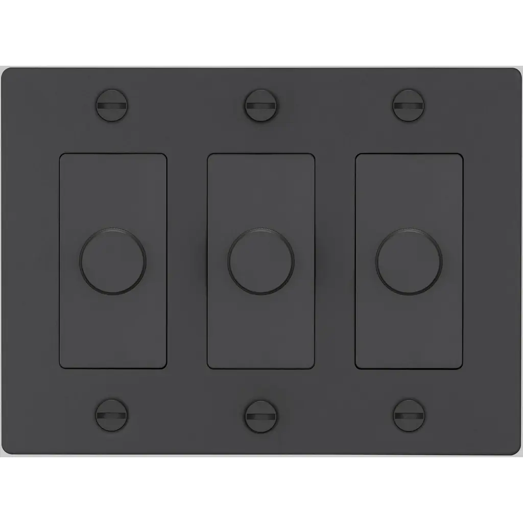 A dimmer switch finished in black. The dimmer knob features our signature, diamond-cut, cross knurl pattern and is made from solid black metal.FYI: This piece has a 4 mm shadow gap when installed.